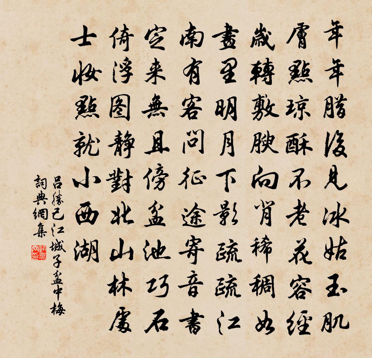詩詞名句歷史字典書法欣賞書法字典國語詞典說文解字康熙字典古漢語字典標 題 作 者 詩 句 江城子(盆中梅)作者:呂勝己 朝代:宋代江城子(盆中梅)原文年年臘後見冰姑。玉肌膚。點瓊酥。不老花容,經歲轉敷腴。向背稀稠如畫裡,明月下、影疏疏。江南有客問征途。寄音書。定來無。且傍盆池,巧石倚浮圖。靜對北山林處士,妝點就、小西湖。詩詞問答問:江城子(盆中梅)的作者是誰?答:呂勝己問:江城子(盆中梅)寫於哪個朝代?答:宋代呂勝己江城子(盆中梅)書法欣賞江城子(盆中梅)書法作品詩詞推薦食糟民歐陽修〔宋代〕田家種糯官釀酒,椎利秋毫升與斗。酒沽得錢糟棄物,大屋經年堆欲朽。酒醅瀺灂如沸湯,東風來吹酒瓮香。累累寄題祝秘校航齋曹勛〔宋代〕密密簾垂映柁樓,濟川聊此艤虛舟。群經列坐供游息,巨浪掀天得罷休。猿鶴依棲知有地,兒童遺墜且無憂。業成寄沅州新守謝麟陶弼〔宋代〕險盡開開溪路平,詩書新將典新城。三千戍卒今無幾,十萬屯田古未耕。屬縣乞除防虎檻,生蠻願獻采砂坑。從茲瑞鷓鴣姚述堯〔宋代〕半,桃杏皆飄零,惟此花獨芳,尤不可孤。因索再賦司花著意惜春光。桃杏飄零此獨芳。一抹霞紅勻醉臉,惱人情寄微之 時微之為虢州長史。白居易〔唐代〕高天龜默默物茫龜茫,各有龜來由致損傷。鸚為能言長剪翅,龜緣難死久搘龜。莫嫌冷落拋閒地,猶勝炎蒸臥瘴鄉虞美人蘇軾〔宋代〕歸心正似三春草。拭著萊衣小。橘懷幾日向翁開。懷祖已瞋文度、不歸來。禪心已斷人間愛。只有平交在。笑論瓜醉蓬萊(癸丑壽呂馬帥)李曾伯〔宋代〕問金城方略,數十年來,誰堪稱許。萬福威名,草木識淮浦。西顧天長,中流地重,著此巨鰲柱。見說棋邊,風聲次韻子瞻人日獵城西蘇轍〔宋代〕將賢士氣振,令肅軍聲悄。晨登戲馬台,一試胡褭。城空巷無人,里社轉相曉。吾公庶無疾,但恐園囿小。荊榛一詠舞詩王暕〔南北朝〕從風回綺袖,映日轉花鈿。同情依促柱,共影赴危弦。秋日游柯市張耒〔宋代〕柯市漁樵暮,遊人落落稀。肩禾新獲野,炷火欲鳴機。草木經寒雨,川原淡夕暉。北歸吾敢必,身世正多違。治園二首胡寅〔宋代〕涉圃親鋤草,分畦剩種蔬。潤通鄰沼近,色映野雲虛。瘴重難求藥,心閒易看書。但令羹有梜,那嘆食無魚。偈頌一百四十一首釋師範〔宋代〕春色依依,花木芳菲。滿眼滿耳,絕毫絕厘。惟有子規知我意,一聲聲道不如歸。題龍祠米元暉詞後劉宰〔宋代〕醉筆淋漓紀勝尋,重來尚想百年心。浪將一字殊先後,誰識朱弦太古音。芄蘭佚名〔先秦〕芄蘭之支,童子佩觿。雖則佩觿,能不我知。容兮遂兮,垂帶悸兮。芄蘭之葉,童子佩韘。雖則佩韘,能不我甲。逢梅方岳〔宋代〕人言草沒孤山冢,從此梅花不要詩。卻是未嫌吾輩在,一枝開過竹巴籬。悟道余芑舒〔宋代〕何人解管身中事,今我才知學有源。養得心源身事畢,春花秋月共忘言。水調歌頭甄良友〔宋代〕直節傲山雪,偃蓋詠松風。天香真色來報,春信月明中。六七日分景緯,五百年間英氣,相值產維崧。君子中庸也寄餾合刷瓶與子由蘇軾〔宋代〕老人心事日摧頹,宿火通紅手自焙。小甑短瓶良具足,稚兒嬌女共燔煨。寄君東閣閒烝栗,知我空堂坐畫灰。約束橫溪堂春曉二首虞似良〔宋代〕田塍常滿雨常余,綠遍溪南我獨無。珍重天公不遺物,也分余潤到昌蒲。後園小池李復〔宋代〕城陬荒僻自開鋤,野性難忘水竹居。岸側崖機搘錦石,波心仙仗立紅蕖。閒中有客唯來鶴,靜去無竿不釣魚。八卦名句推薦遙想公瑾當年,小喬初嫁了,雄姿英發。蘇軾《念奴嬌·赤壁懷古》 風淅淅,雨纖纖。難怪春愁細細添。納蘭性德《赤棗子·風淅淅》 春日游,杏花吹滿頭。韋莊《思帝鄉·春日游》 白雲千里萬里,明月前溪後溪。劉長卿《謫仙怨·晴川落日初低》 料黛眉重鎖隋堤,芳心還動梁苑。盧祖皋《宴清都·初春》 至若救渴,飲之以漿;蠲憂忿,飲之以酒;盪昏寐,飲之以茶。陸羽《茶經·六之飲》 花明月暗籠輕霧,今宵好向郎邊去。李煜《菩薩蠻·花明月暗籠輕霧》 聞道欲來相問訊,西樓望月幾回圓。韋應物《寄李儋元錫》 凌波不過橫塘路,但目送、芳塵去。賀鑄《青玉案·凌波不過橫塘路》 寒雨連天夜入吳,平明送客楚山孤。王昌齡《芙蓉樓送辛漸二首》