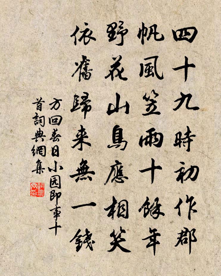 詩詞名句歷史字典書法欣賞書法字典國語詞典說文解字康熙字典古漢語字典標 題 作 者 詩 句 春日小園即事十首作者:方回 朝代:宋代春日小園即事十首原文四十九時初作郡,帆風笠雨十餘年。野花山鳥應相笑,依舊歸來無一錢。詩詞問答問:春日小園即事十首的作者是誰?答:方回問:春日小園即事十首寫於哪個朝代?答:宋代方回春日小園即事十首書法欣賞春日小園即事十首書法作品詩詞推薦夏至雨霽與陳履常暮行溪上二首楊萬里〔宋代〕夕涼恰恰好溪行,暮色催人底急生。半路蛙聲迎步止,一熒松火隔籬明。滿庭芳趙令畤〔宋代〕玉枕生涼,金缸傳曉,敗葉飛破清秋。雨餘翻浪,渺渺阻行舟。暫系汀洲側畔,風夜起、荻葉添愁。銀屏遠,龍香出遊郊外七絕王炎〔宋代〕孤煙近見數椽屋,急水時行獨木橋。入眼異鄉風景別,修眉一抹暮山遙。和所盤闌字韻丘葵〔宋代〕遙想山齋客夢闌,朔風吹鬢怯欄乾。黃花句裹空相憶,青鏡朝來獨自看。絕似東坡來海上,勝猶賈島渡桑乾。木奴極樂寺李堪〔宋代〕空門出白雲,梵宇依蒼岫。天色湛瑤光,春花結野秀。簷間綺羅被,池底星珠漏。香沉煙篆餘,文兼雨碑舊。恬智照禪師久欲一見比至汝則已游矣因題廣惠韓維〔宋代〕高僧寂寞空塵坐,古寺悲涼足野風。道在豈須煩目擊,亭前雙柏自蔥蔥。二月初七日壽溪十絕劉克莊〔宋代〕士不論窮達,離鄉即可哀。白頭孫七十,歲歲埽松來。和侯大夫秋原山觀征人回楊巨源〔唐代〕兩河戰罷萬方清,原上軍回識舊營。立馬望雲秋塞靜,射鵰臨水晚天晴。戍閒部伍分岐路,地遠家鄉寄旆旌。新地減字木蘭花侯善淵〔元代〕五行四象。戊己攢盈如何樣。黑水紅雲。白馬背牛兩下分。金車寶輦。大道夷然烹玉線。碾路如銀。搬載嬰兒出世雪中作陸游〔宋代〕竹折松僵鳥雀愁,閉門我亦擁貂裘。已忘作賦游梁苑,但憶銜枚入蔡州。屬國餐氈真強項,翰林煮茗自風流。明朝歲暮病懷贈夢得(時與夢得同患足疾)白居易〔唐代〕十年四海故交親,零落唯殘兩病身。共遣數奇從是命,同教步蹇有何因。眼隨老減嫌長夜,體待陽舒望早春。新樂送高秘丞曾鞏〔宋代〕簿書壅處精神健,負俗澆時質性淳。公退種花常滿縣,政成馴雉不驚人。指麾細柳通河外,歌詠甘棠付漢濱。惆悵學道陸游〔宋代〕學道知專氣,尊生得養形。精神生尺宅,虛白集中扃。出岫孤雲靜,凌霜老柏青。晨興取澗水,漱齒讀黃庭。雜曲歌辭。浪淘沙皇甫松〔唐代〕灘頭細草接疏林,浪惡罾船半欲沉。宿鷺眠洲非舊浦,去年沙觜是江心。蠻歌豆蔻北人愁,松雨蒲風夜艇秋。浪起放魚 自此後詩到江州作。白居易〔唐代〕曉日提竹籃,家僮 * 蔬。青青芹蕨下,疊臥雙白魚。無聲但呀呀,以氣相煦濡。傾籃寫地上,撥剌長尺余。豈唯送陳季常歸洛黃庭堅〔宋代〕人生俱行役,何能如聚鹿。浮楂在江湖,邂逅一相觸。天邊數年別,故人有陳叔。誰雲區區葉,車馬肯來辱。清樽聞延州警郭稹〔宋代〕塞日兵前慘,城煙戰後無。分明千帝紀,況乃畔天都。桂玉京師涌,金湯鄜路孤。遲回思廟筭,端坐愧龍圖。閒居史彌寧〔宋代〕山雲送我丹青幅,花氣撩人蘭麝香。詩債幸在逢人務,被渠催索又奔忙。初八日人事少閒命車……趙蕃〔宋代〕細雨微風湖上亭,柳深荷密競青青。生平漫與形神接,客里孤游耳目醒。題詠紛繪幾詩板,畫圖零落半幽屏。像祠慈雲嶺韓元吉〔宋代〕極目慈雲路,看山立少時。湖光經雨闊,柳色泥煙垂。琢石觀蹲獸,鐫崖讀斷碑。西關知底險,撫掌笑兒嬉。名句推薦故人溪上,掛愁無奈,煙梢月樹。史達祖《留春令·詠梅花》 梅似雪,柳如絲。試聽別語慰相思。辛棄疾《鷓鴣天·送歐陽國瑞入吳中》 此去與師誰共到,一船明月一帆風。韋莊《送日本國僧敬龍歸》 兩個黃鸝鳴翠柳,一行白鷺上青天。杜甫《絕句》 停船暫借問,或恐是同鄉。崔顥《長干行·君家何處住》 千步虹橋,參差雁齒,直趨水殿。柳永《破陣樂·露花倒影》 謂學不暇者,雖暇亦不能學矣。劉安及其門客《淮南子·說山訓》 歌沉玉樹,古寺空有疏鍾發。李綱《六么令·次韻和賀方回金陵懷古鄱陽席上作》 望家思獻壽,算甲恨長年。歐陽詹《除夜長安客舍》 闌乾風冷雪漫漫,惆悵無人把釣竿。姜夔《釣雪亭》
