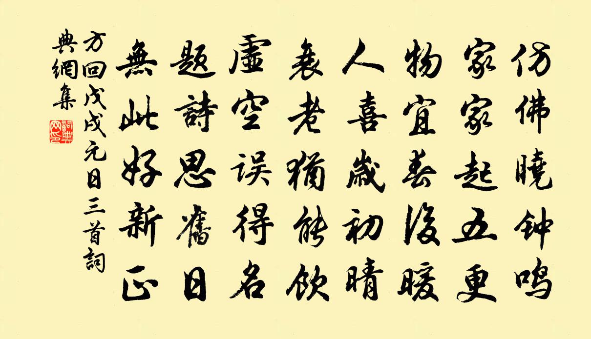 詩詞名句歷史字典書法欣賞書法字典國語詞典說文解字康熙字典古漢語字典標 題 作 者 詩 句 戊戌元日三首作者:方回 朝代:宋代戊戌元日三首原文仿佛曉鐘鳴,家家起五更。物宜春後暖,人喜歲初晴。衰老猶能飲,虛空誤得名。題詩思舊日,無此好新正。詩詞問答問:戊戌元日三首的作者是誰?答:方回問:戊戌元日三首寫於哪個朝代?答:宋代方回戊戌元日三首書法欣賞戊戌元日三首書法作品詩詞推薦周純臣子去病淑慧而短折賦以哀之葉適〔宋代〕周子百未遇,有兒慰眼前。敢夸村調別,自喜稟賦全。其守過老蒼,其行通變權。共看成蚤負,何意夭初年。汝昔記顏六言三首劉克莊〔宋代〕謗之則喪家狗,譽之則人中龍。華發去周柱下,深衣立魯門東。重登廬山感懷陳香梅〔〕四十年來煙雨多,國恨家仇奈若何;英雄抗日征戰死,天涯遊子唱離歌。牯嶺東西谷尚在, 郎人士舊風波;廬山醉蓬萊(天寧節作)葛勝仲〔宋代〕望蔥蔥佳氣,虹渚祥開,斗樞光繞。析木天津,正靈暉騰照。鷺綴分班,象胥交貢,奉御觴清曉。玉殿寒輕,金徒春日送沈贊府歸潯陽覲叔父楊巨源〔唐代〕潯陽阮鹹宅,九派竹林前。花嶼高如浪,雲峰遠似天。江聲在南巷,海氣入東田。才子今朝去,風濤思渺然。次韻袁憲雪二首陳造〔宋代〕犯雪回帆歲遽殘,自憐雨澁更風慳。從游已落鄒枚後,著語渠能季孟間。夢逐蜚仙凌 * ,誰因逋客護雲關。獨思同丁致遠司戶游東掖山二首李庚〔宋代〕不見詩人老鄭虔,誰知衣缽此中傳。尚余傑閣驚我句,更結今秋未了緣。浩西堂見和因再用韻釋紹嵩〔宋代〕每慚疏散為吟詩,說破當知未大奇。似此誤人多少事,如何兩鬢不成絲。七月二十五日為廣州蒲澗節鞏帥相招坐上默營曾豐〔宋代〕侵尋逾七夕,次第到中秋。蒲澗廣南節,熊車城外游。杯盤收復出,賓主勸還酬。痛為江山飲,離騷不讀休。初六日過湖方回〔宋代〕長於花擔看梅花,不訪山巔問水涯。世換湖光無減少,時來春色與增加。荒榛德佑權臣宅,老樹鹹平處士家。一醉尉繚子引諺佚名〔先秦〕千金不死。百金不刑。吏隱宜春郡詩十首祖無擇〔宋代〕吏隱宜春郡,閒思應舉時,端居苦貧賤,徒步入京師。誤寵乘軒鶴,均憂入廟犧。功名在何許,雙鬢已垂絲。乍歸九首劉克莊〔宋代〕絕愛牆陰橘,花開滿院香。鄰人欺不在,稍覺北枝傷。和田錄事新燕賀鑄〔宋代〕新巢故國兩依依,似與春華秋葉期。雨過池塘得泥近,日高台榭捲簾遲。鞦韆節後初相見,祓禊人歸有所思。雙侶句張潞〔宋代〕未能子字民,但欲兄事錢。偈頌五十一首釋大觀〔宋代〕作者相逢,一西一東。斷碑坤白字,當道種青松。至日宿藍坑小民居,竹柱荻壁,壁皆不土楊萬里〔宋代〕一路都岑寂,藍坑分外荒。屋疏茅送月,壁密荻分霜。病趾催趺坐,殘更妒曉光。暖寒無上策,來早借朝陽。內直奉寄聖俞博士歐陽修〔宋代〕千門鑰入斷人聲,樓閣沉沉夜氣生。獨直偏知宮漏永,稍寒尤覺玉堂清。霜雲映月鱗鱗色,風葉飛空摵摵鳴。犬馬頌古三十一首釋安永〔宋代〕南北山相對,東西有路分。不經場陣裹,爭見李將軍。漫興九首方回〔宋代〕袍絮無堪換,柴錢久未還。有人來問字,賒酒醉花間。名句推薦恐斷紅、尚有相思字,何由見得。周邦彥《六醜·落花》 掃眉才子知多少,管領春風總不如。王建《寄蜀中薛濤校書》 草木也知愁,韶華竟白頭。曹雪芹《唐多令·柳絮》 雲鬢花顏金步搖,芙蓉帳暖度春宵。白居易《長恨歌》 人生自古誰無死?留取丹心照汗青。文天祥《過零丁洋》 知君獨坐青軒下,此時結念同所懷。李白《早秋單父南樓酬竇公衡》 江山如畫,一時多少豪傑蘇軾《念奴嬌·赤壁懷古》 處大無患者恆多慢,處小有憂者恆思善陳壽《三國志·蜀書·杜周杜許孟來尹李譙郤傳》 新秋逢閏,鵲橋重駕,兩度人間乞巧。顧太清《鵲橋仙·雲林矚題閏七夕聯吟圖》 一言既出,駟馬難追。佚名《增廣賢文·上集》