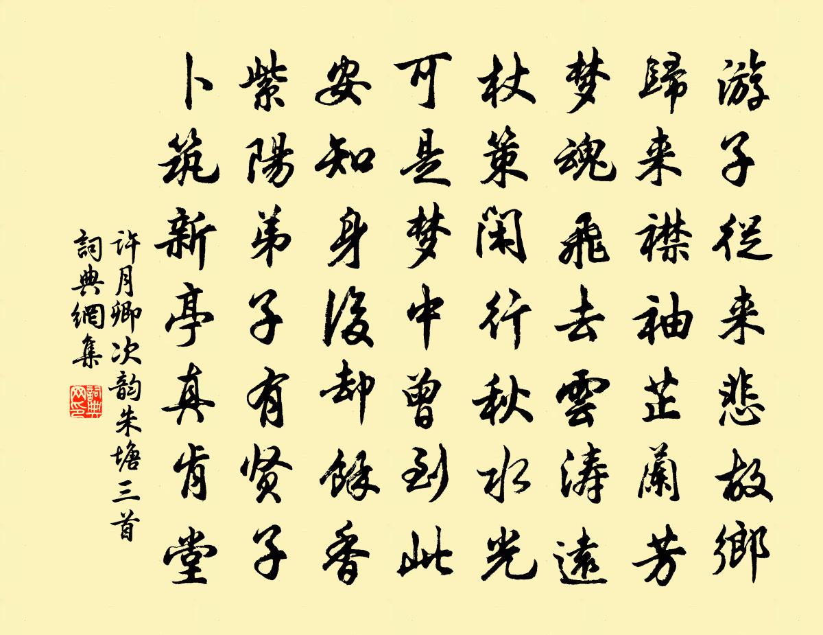 詩詞名句歷史字典書法欣賞書法字典國語詞典說文解字康熙字典古漢語字典標 題 作 者 詩 句 次韻朱塘三首作者:許月卿 朝代:宋代次韻朱塘三首原文遊子從來悲故鄉,歸來襟袖芷蘭芳。夢魂飛去雲濤遠,杖策閒行秋水光。可是夢中曾到此,安知身後卻余香。紫陽弟子有賢子,卜築新亭真肯堂。詩詞問答問:次韻朱塘三首的作者是誰?答:許月卿問:次韻朱塘三首寫於哪個朝代?答:宋代許月卿次韻朱塘三首書法欣賞次韻朱塘三首書法作品詩詞推薦重送丘二十二還臨平山居韋應物〔唐代〕歲中始再覯,方來又解攜。才留野艇語,已憶故山棲。幽澗人夜汲,深林鳥長啼。還持郡齋酒,慰子霜露淒。思佳客陳允平〔宋代〕曾約雙瓊品鳳簫。玉台光映玉嬌嬈。銀花燭冷飛羅暗,寶悄香融曲篆銷。簾影亂,漏聲迢。佩雲清入楚天遙。題紅自寬晁說之〔宋代〕無奈愁何強自寬,細將心事樂江乾。新詩時向夢中得,明月多從枕上看。吾道若存生有益,君恩可報死何難。五陵晚春臥病喜振上人見訪李益〔唐代〕臥床殊舊日,窺戶易傷春。靈壽扶衰力,芭蕉對病身。道心空寂寞,時物自芳新。旦夕誰相訪,唯當揖上人。初夏雜詠陸游〔宋代〕屐路緣虛壁,棋軒枕小灘。玄言不媿籍,熟睡卻輸摶。咄咄書常嬾,便便腹本寬。山園時節好,杏子已微丹。南歌子呂勝己〔宋代〕湛露涼亭館,香風散芰荷。晚來月色似金波。間綠圍紅、同伴雪兒歌。年少風流足,情深歡會多。佳人月下拜嫦娥會居易齋分韻李廌〔宋代〕君子何樂胥,清夜以文會。篇章各紛拏,錦組貫珠貝。高譚生清風,石齒漱湍瀨。安得樓蘭肉,充庖余炙膾。天台四睡贊釋慧開〔宋代〕既是伏爪藏牙,不用三頭六臂。只圖夢裡惺惺,任疑大蟲瞌睡。送武士曹歸蜀 士曹即武中丞兄。白居易〔唐代〕花落鳥嚶嚶,南歸稱野情。月宜秦嶺宿,春好蜀江行。鄉路通雲棧,郊扉近錦城。烏台陟岡送,人羨別時榮。淮揚大水鄭獬〔宋代〕淮揚水暴不可言,繞城四面長波皴。如一大瓢寄滄海,十萬生聚瓢中存。水之初作自何爾,舊堤有病亡其唇。劃然賀新郎(二鶴)劉克莊〔宋代〕家有仙禽二。早追隨、先生杖屨,互鄉童子。旦旦池邊三薰沐,夜夜山中警睡。且伴我、人間遊戲。此老生平哀大讀老子次前韻陸游〔宋代〕平生好大忽瑣細,焚香讀書戶常閉。少年曾預老聃役,晚歲欲挹浮丘袂。力探玄門窮眾妙,肯學陰謀畫奇計?言狂菩薩蠻(和令狐公子)王灼〔宋代〕風柔日薄江村路。一鞭又逐春光去。胡蝶作團飛。竹間桃李枝。醉魂招不得。一半隨春色。桃李□無多。其如風日新荷葉史浩〔宋代〕真隱先生,家居近在東湖。茅屋三椽,自有一種清虛。秫來釀酒,便無後、也解賒沽。只愁客至,不能拚此芳壺。尉繚子引諺佚名〔先秦〕千金不死。百金不刑。【越調】柳營曲 賞春吳西逸〔元代〕花艷冶,柳欹斜,粉牆低畫樓人困也。庭院星列,羅綺雲疊,簇簇鬧蜂蝶。紫霞杯我輩豪俠,綠雲鬟仕女奇絕。烏大雪趙振文寄詩言乘月泛舟清甚次韻樓鑰〔宋代〕雪光絕勝水銀銀,未覺仙家隔一塵。真境宜君著佳句,賞心樂事更良辰。已醜正月二十四日避地鹽楹入省坑存思庵和舊舒岳祥〔宋代〕到此於今四,情深即故鄉。新松積壓改徑,舊竹不依行。平施天猶病,周回日載陽。鄰人{饃莫換鬼}雞黍,厚意和座客周顓〔唐代〕十載文場敢憚勞,宋都回鶂為風高。今朝甘被花枝笑,任道尊前愛縛猱。念奴嬌(次韻施德初席上)毛並〔宋代〕麗譙春晚,望東南千里,湖山佳色。畫戟門前清似水,時節初過燈夕。封井年登,京華日近,每報平安驛。滿城花名句推薦美功不伐,貴位不善佚名《孔子家語·弟子行》 市,朝則滿,夕則虛,非朝愛市而夕憎之也,求存故往,亡故去。劉向《戰國策·齊四·孟嘗君逐於齊而復反》 寂寞離亭掩,江山此夜寒。王勃《江亭夜月送別二首》 故人書報,莫因循、忘卻蓴鱸。辛棄疾《漢宮春·會稽秋風亭觀雨》 且就洞庭賒月色,將船買酒白雲邊。李白《游洞庭湖五首·其二》 試問鄉關何處是,水雲浩蕩迷南北。趙鼎《滿江紅·丁未九月南渡泊舟儀真江口作》 君王選玉色,侍寢金屏中。李白《怨歌行》 木落雁南度,北風江上寒。孟浩然《早寒江上有懷 / 早寒有懷 / 江上思歸》 八陣圖名成臥龍,六韜書功在飛熊。查德卿《蟾宮曲·懷古》 耕犁千畝實千箱,力盡筋疲誰復傷?李綱《病牛》