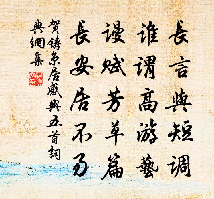 詩詞名句歷史字典書法欣賞書法字典國語詞典說文解字康熙字典古漢語字典標 題 作 者 詩 句 京居感興五首作者:賀鑄 朝代:宋代京居感興五首原文長言與短調,誰謂高遊藝。謾賦芳草篇。長安居不易。詩詞問答問:京居感興五首的作者是誰?答:賀鑄問:京居感興五首寫於哪個朝代?答:宋代問:賀鑄的名句有哪些?答:賀鑄名句大全賀鑄京居感興五首書法欣賞京居感興五首書法作品詩詞推薦金陵懷古王珪〔唐代〕控帶洪流古帝城,欲尋舊事半榛荊。六朝山色青終在,千古江聲恨未平。設險丘陵荒蔓草,壓村桑柘接新耕。十年戲贈南安倅柳朝散黃庭堅〔宋代〕柳侯風味晚相見,衣袂頗薰荀令香。桃李能言妙歌舞,樽前一曲斷人腸。洞庭歸客有佳句,庾嶺梅花如小棠。乘興聽趙碧瀾操琴顧逢〔宋代〕彈來三尺桐,知用幾年功。聽到希聲處,涼生不語中。斷霞明似日,急雨過如風。曲罷爐香在,還思敏仲翁。和仲良春晚即事楊萬里〔宋代〕欲與東風說,休吹隨絮飛。吾行正無定,魂夢豈忘歸。花暖能醺眼,山濃欲染衣。只嫌春巳老,此景也應稀。下第留別陳至李廌〔宋代〕明緡釣香餌,彼取亦已微。金丸往抵黽,我用一何卑。餘生宇宙間,動輒多願違。天王十二閒,玉勒黃金鞿。奈何張和公母秦國太夫人輓詞王之望〔宋代〕誓此共姜早,貧如翟母希。三遷功可大,五福報無違。袞繡供兒采,風旛契祖機。千秋憑直筆,圖史播芳徽。春晏病體少悰退臥北齋有寄宋祁〔宋代〕小有負薪疾,早成憔悴姿。無人來迓跛,賴酒與扶衰。朴斲知林短,腥{左月右婁}厭席卑。西山一丸藥,何忍獨萬山深處釋文珦〔宋代〕萬山深處絕諠嘩,野鶴孤猿共此家。莫使游塵污泉石,有妨閒客臥煙霞。寒譾綠芰千層葉,飢食青花數樹花。無可送胤公歸闕齊己〔唐代〕西朝歸去見高情,應戀香燈近聖明。關令莫疑非馬辯,道安還跨赤驢行。充齋野店蔬無味,灑笠平原雪有聲。忍惜殊不惡齋秋晚閒吟五絕范成大〔宋代〕中秋昨已等閒過,重九今還如夢來。霜鬢數莖羞墮幘,黃花三度笑空杯。秋暮西歸途中書情白居易〔唐代〕耿耿旅燈下,愁多常少眠。思鄉貴早發,發在雞鳴前。九月草木落,平蕪連遠山。秋陰和曙色,萬木蒼蒼然。去秋酬揚州白塔寺永上人顧況〔唐代〕塔上是何緣,香燈續細煙。松枝當麈尾,柳絮替蠶綿。浮草經行遍,空花義趣圓。我來雖為法,暫借一床眠。官舍阻雨十日湧出悶成五絕呈徐判部劉過〔宋代〕學弄筆頭兒戲事,風流眼底亦無之。汪孫已往周洪沒,本分作家今是誰。江神子令 西山隱者相訪劉志淵〔元代〕有緣相遇芥投針。話真心。死三陰。陽自漿成,瓊液不時斟。伴飲琅琅聲貫耳,無弦曲,肖風琴。氤氳訊息拍胸襟荊南道中曹松〔唐代〕十月荒郊雪氣催,依稀愁色認陽台。游秦分系三條燭,出楚心殊一寸灰。高柳莫遮寒月落,空桑不放夜風回。如何孩兒菊史鑄〔宋代〕地母提來風露徑,笑風泣露並堪憐。品微元乏香肌骨,濫預秋英得浪傳。明發陳公徑過摩舍那灘石峰下十首楊萬里〔宋代〕城中安得山,無山安得詩。我入五羊城,遂與山水辭。有鏡不敢覽,塵面我自知。解維來歸亭,山水奔相隨。水光次韻答陣夢錫十首陳造〔宋代〕姜子嗜酒不良行,諸公挽顧慚登瀛。尚堪堅坐作周鼎,底用詩名滿鳳城。次韻答簡簿王炎〔宋代〕少日牛衣嘗熟眠,老來駝褐不護寒。欲呵龜手拈禿筆,怯看冰柱縣疏檐。東風不解著梅柳,翻作六出欺春妍。春回句鄭子信〔宋代〕古人隨水去不返,此字與山留無窮。名句推薦道由白雲盡,春與青溪長。劉昚虛《闕題》 況復煩促倦,激烈思時康。杜甫《夏夜嘆》 說相思,問相思,楓落吳江雁去遲。吳錫麒《長相思·以書寄西泠諸友即題其後》 窗間梅熟落蒂,牆下筍成出林。范成大《喜晴》 回眸一笑百媚生,六宮粉黛無顏色。白居易《長恨歌》 君莫舞,君不見、玉環飛燕皆塵土!辛棄疾《摸魚兒·更能消幾番風雨》 無由持一碗,寄與愛茶人。白居易《山泉煎茶有懷》 野老念牧童,倚杖候荊扉。王維《渭川田家》 廄馬散連山,軍容威絕域。李白《君子有所思行》 地白風色寒,雪花大如手。李白《嘲王歷陽不肯飲酒》