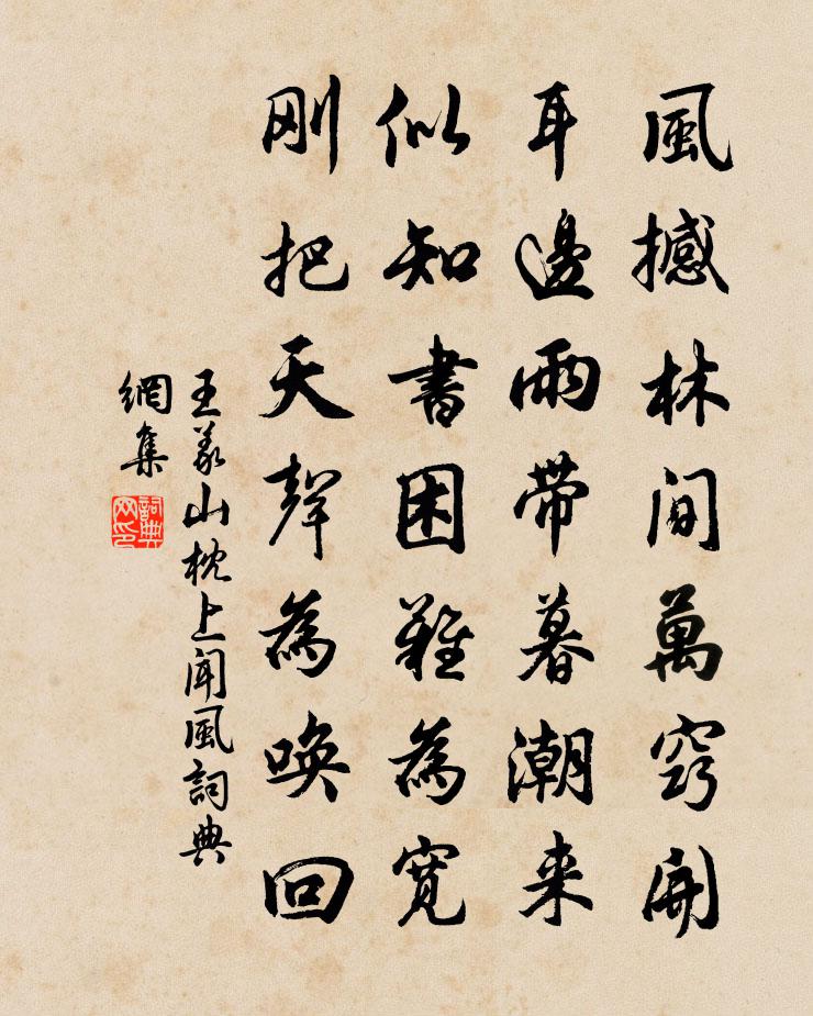 詩詞名句歷史字典書法欣賞書法字典國語詞典說文解字康熙字典古漢語字典標 題 作 者 詩 句 枕上聞風作者:王義山 朝代:宋代枕上聞風原文風撼林間萬竅開,耳邊雨帶暮潮來。似知書困難為寬,剛把天聲為喚回。詩詞問答問:枕上聞風的作者是誰?答:王義山問:枕上聞風寫於哪個朝代?答:宋代王義山枕上聞風書法欣賞枕上聞風書法作品詩詞推薦點絳唇張掄〔宋代〕花滿名園,萬紅千翠交相映。晝闌幽徑。行樂迷芳景。惟有幽人,不與浮華競。便幽靜。興來獨飲。花下風吹醒。答范石湖牡丹詩吳儆〔宋代〕滿城桃李已塵埃,麗日稠紅次第開。竹里柴扉掩春晝,坐看蜂蝶去還來。次丹元姚先生韻二首蘇軾〔宋代〕不學劉更生,黃金鑄上方。不學房次律,身事問潁陽。王烈亦何人,叔夜未可量。獨見神山開,遽餐石髓香。至道和宮師相公待制龐學士賢年二韻續川然兩字宋祁〔宋代〕龍樓一品亞台聯,佚老歸來帝養賢。商皓嶺芝追隱伴,胡公潭菊得高年。客盤梅熟經調鼎,宴渚舟橫舊濟川。延閣和閱明妃傳趙希逢〔宋代〕青冢今成土一堆,嬌容埋玉恨難開。無端當日毛延壽,輕把毫端巧作媒。水仙花黃庚〔宋代〕冰魂月魄水精神,翠袂凌波濕楚雲。雪後清閒誰是侶,汨羅江上伴湘君。菩薩蠻盧祖皋〔宋代〕芙蓉香卸桐陰薄。水窗未雨涼先覺。何處理秋裳。月高砧杵長。袂羅新恨悄。展轉屏山曉。長是捲簾時。翠禽相對自述王珪〔唐代〕少從客路千波轉,老入流年萬事疏。野鶴定知乘寵誤,春冰多愧踐名虛。幾思漢殿金盤露,恣閱蓬山綠字書。未報苦旱六首陳造〔宋代〕蒼生惜死所,倚須數寸澤。連朝油雲度,空勞問雨色。豐歉恐數然,造物莫為力。定知天屢陰,為爾動悽惻。題曾氏山園十一詠霜傑張栻〔宋代〕種松苦難長,松長還耐久。莫和目前思,但種門前柳。齊安春謠五絕張耒〔宋代〕楊柳弄春藏不得,雪絮點點吹人來。輕清潔白非塵物,寄語桃杏莫相猜。風入松趙聞禮〔宋代〕麴塵風雨亂春晴。花重寒輕。珠簾卷上還重下,怕東風、吹散歌聲。棋倦杯頻晝永,粉香花艷清明。十分無處著閒和襲美詠皋橋陸龜蒙〔唐代〕橫截春流架斷虹,憑欄猶思五噫風。今來未必非梁孟,卻是無人斷伯通。英德道中文天祥〔宋代〕海近山如沃,杼深屋半蕪。乾坤正風雨,軒冕總泥途。自嘆鳶肩薄,誰憐鶴影孤。少年狂不醒,夜夜夢伊吾。王德言樞密生日十首曹勛〔宋代〕每喜高情語甚真,讜言亹亹贊天鈞。不殊林下忘形態,定是因是地位人。題蘇慶嗣睡樂軒郭印〔宋代〕六鑿森劍戟,一枕寄華胥。覺夢既殊轍,睡兮真樂歟。達人蘊大觀,方寸包太虛。憂樂兩不知,寤寐常如如。昔也岳陽懷古呂溫〔唐代〕晨飆發荊州,落日到巴丘。方知刳剡利,可接鬼神遊。二湖豁南浸,九派駛東流。襟帶三千里,盡在岳陽樓。憶昔獨不見楊巨源〔唐代〕春風艷陽色,柳綠花如霰。競理同心鬟,爭持合歡扇。香傳賈娘手,粉離何郎面。最恨捲簾時,含情獨不見。絕命詞方孝孺〔明代〕天降亂離兮,孰知其由? 奸臣得計兮,謀國用猶。 忠臣發憤兮,血淚交流。 以此殉君兮,抑又何求! 嗚呼擬輕薄篇何遜〔南北朝〕城東美少年。重身輕萬億。柘彈隋珠丸。白馬黃金飾。長安九逵上。青槐蔭道植。轂擊晨已喧。肩排暝不息。走狗名句推薦何處可為別,長安青綺門。李白《送裴十八圖南歸嵩山二首》 天際疏星趁馬,簾晝隙、冰弦三疊。吳文英《暗香·送魏句濱宰吳縣解組分韻得闔字》 世事短如春夢,人情薄似秋雲。朱敦儒《西江月·世事短如春夢》 天秋月又滿,城闕夜千重。戴叔倫《客夜與故人偶集 / 江鄉故人偶集客舍》 西北望長安,可憐無數山辛棄疾《菩薩蠻·書江西造口壁》 巧媳婦煮不得沒米粥馮夢龍《警世通言·卷十二》 話別情多聲欲戰,玉著痕留紅粉面。顧敻《玉樓春·拂水雙飛來去燕》 國有賢相良將,民之師表也。司馬遷《史記·七十列傳·太史公自序》 江寒水不流,魚嚼梅花影。釋敬安《題寒江釣雪圖》 奸不自招,忠不自辯。奸者禍國,忠者禍身。來俊臣《羅織經·察奸卷第八》