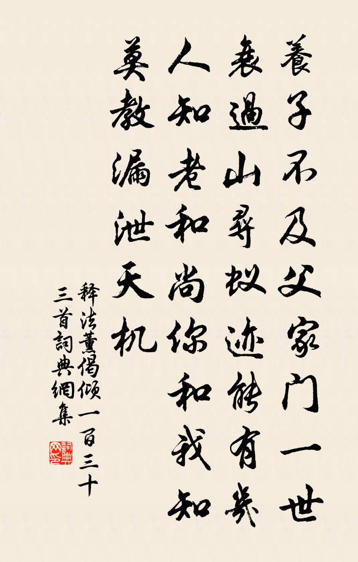詩詞名句歷史字典書法欣賞書法字典國語詞典說文解字康熙字典古漢語字典標 題 作 者 詩 句 偈傾一百三十三首作者:釋法薰 朝代:宋代偈傾一百三十三首原文養子不及父,家門一世衰。過山尋蟻跡,能有幾人知。老和尚你和我知,莫教漏泄天機。詩詞問答問:偈傾一百三十三首的作者是誰?答:釋法薰問:偈傾一百三十三首寫於哪個朝代?答:宋代釋法薰偈傾一百三十三首書法欣賞偈傾一百三十三首書法作品詩詞推薦郊居書事趙蕃〔宋代〕物意因人喜,人情與物和。家家繰繭火,處處插秧歌。麥熟黃疑委,桑余路尚多。我居雖逼仄,度日亦婆娑。秋謁屺瞻墓馬廷鸞〔宋代〕了知五十六年非,何處空山叫阿{上彌下女}。斗酒只雞雙淚落,荒林宿莽九原悲。黃花委地傷徂歲,青筍迎船憶謁梓潼張惡子廟王鐸〔唐代〕盛唐聖主解青萍,欲振新封濟順名。夜雨龍拋三尺匣,春雲鳳入九重城。劍門喜氣隨雷動,玉壘韶光待賊平。惟報江上為韓毅伯訪得便舟王炎〔宋代〕銅墨纏腰雪上頭,人生一飽亦難謀。天明忽暗釀梅雨,風暖又寒催麥秋。老矣不堪時節換,粲然方幸故人留。白雲封泰山樂章。壽和佚名〔唐代〕烝烝我後,享獻惟夤。躬酌郁鬯,跪奠明神。孝莫孝乎,配上帝親。敬莫敬乎,教天下臣。歸東陽臨岐上杜使君七首貫休〔唐代〕小謝清高大謝才,聖君令泰此方來。一從到後常無事,鈴閣公庭滿綠苔。紅錦帳中歌白雪,烏皮幾畔撫青英。不知和淮南公聽琴聞弦斷詩庾信〔南北朝〕嗣宗看月夜。中散對行雲。一弦雖獨韻。猶足動文君。偈頌一百六十首釋宗杲〔宋代〕門外春將半,山房總不知。可憐拄杖子,暗裡自抽枝。夏日陸游〔宋代〕山下柴荊晝不開,苔生古井暗楸槐。新詩喔罷閒無事,移取藤床睡去來。嗟美人詞李廌〔宋代〕嗟美人兮何人,撫千祀兮增悲。咎司命之匪仁兮,弗庇下民。故嗇數於令人兮,俾弗儷乎常期。既闓端之引大,復曲江醉題薛能〔唐代〕閒身行止屬年華,馬上懷中盡落花。狂遍曲江還醉臥,覺來人靜日西斜。偈頌一百零一首釋慧性〔宋代〕觀音菩薩將錢賣糊餅,放下元來是個饅頭。相席打令,看樓打樓,不風流處也風流。壽趙泉使楊簡〔宋代〕孕秀鐘鼎慶源長,屬近親依日月光。弧矢影侵槐陰綠,熊羆夢入藕花香。詩書博雅今平獻,政事精明古趙張。九府夏夜范成大〔宋代〕脈脈惜佳夜,泠泠成浩歌。儻無詩句子,將奈月明何!露氣蒙花重,風聲入樹多。清歡殊未辦,桂影墮江波。子夜四時歌·秋風入窗里佚名〔南北朝〕秋風入窗里,羅帳起飄揚。仰頭看明月,寄情千里光。船子和尚遺蹟在華亭朱涇之間圭上人即其所誅劉克莊〔宋代〕萬頃煙波百尺絲,禪家宗旨有誰知。自嫌固陋如高叟,卻為僧箋把釣詩。登樂遊園望白居易〔唐代〕獨上樂遊園,四望天日曛。東北何靄靄,宮闕入煙雲。愛此高處立,忽如遺垢氛。耳目暫清曠,懷抱郁不伸。下視董嶺水周朴〔唐代〕湖州安吉縣,門與白雲齊。禹力不到處,河聲流向西。去衙山色遠,近水月光低。中有高人在,沙中曳杖藜。寄題曹氏居竹方回〔宋代〕維古修竹鄉,君子世此居。厥壤既宜竹,種竹環其廬。根不取馬箠,筍不供盤蔬。永保歲寒盟,子孫樂只且。老夫又示同志楊冠卿〔宋代〕寂寂寥寥揚子居,雲山相對一床書。無人載酒問奇字,自把殘編時卷編。名句推薦已覺逝川傷別念,復看津樹隱離舟。王勃《秋江送別二首》 歷冰霜、不變好風姿,溫如玉。陸容《滿江紅·詠竹》 山亭水榭秋方半。鳳幃寂寞無人伴。朱淑真《菩薩蠻·山亭水榭秋方半》 浮雲遊子意,落日故人情。李白《送友人》 欲祭疑君在,天涯哭此時。張籍《沒蕃故人》 山中也有千年樹,世上難逢百歲人。佚名《增廣賢文·上集》 灞涘望長安,河陽視京縣。謝朓《晚登三山還望京邑》 大丈夫當橫屍戰場,奈何狼藉都市。李大師、李延壽《南史·列傳·卷十九》 仁義禮善之於人也,辟之若貨財粟米之於家也。荀子《荀子·大略》 遺民淚盡胡塵里,南望王師又一年。陸游《秋夜將曉出籬門迎涼有感》