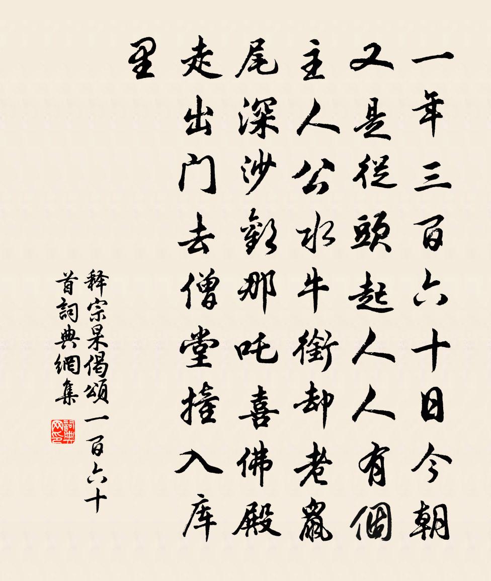 詩詞名句歷史字典書法欣賞書法字典國語詞典說文解字康熙字典古漢語字典標 題 作 者 詩 句 偈頌一百六十首作者:釋宗杲 朝代:宋代偈頌一百六十首原文一年三百六十日,今朝又是從頭起。人人有個主人公。水牛銜卻老鼠尾。深沙歡,那吒喜。佛殿走出門去,僧堂撞入庫里。詩詞問答問:偈頌一百六十首的作者是誰?答:釋宗杲問:偈頌一百六十首寫於哪個朝代?答:宋代釋宗杲偈頌一百六十首書法欣賞偈頌一百六十首書法作品詩詞推薦題東坡卜運算元後張耒〔宋代〕空江月明魚龍眠,月中孤鴻影翩翩。有人清吟立江邊,葛巾藜杖眼窺天。夜涼月墮幽蟲急,鴻影翹沙衣露濕。仙人苦雨許必勝〔宋代〕積憂遂成陰,昏色遍蒼莽。我醉憂已忘,天地當開朗。何以酒醒後,猶然在檐上。雲是方春時,暗助草木長。凝陰水軒林逋〔宋代〕日於詩雅轉沉迷,尤愛憑闌此構題。飄蕩楊花春意晚,黃鸝飛過水東西。辛亥元日送章德茂自建康移帥江陵二首楊萬里〔宋代〕西湖一別忽三年,白首相從豈偶然。到得我來恰君去,政當臘後與春前。醉余犯雪追征帽,送了憑欄望去船。待把題沈華溪詩集陳深〔宋代〕暑夕坐無寐,把君詩獨謠。才堪敵冰柱,韻不減江{蟲兆}。瘴海三年隔,風沙萬里遙。相逢欣有得,傾篋盡瑤瓊臘月二十二夜漏下數刻小飲徑醉坐小合睡傍無劉克莊〔宋代〕晉士讐阮籍眼,唐人觀李邕眉。任汝得吾皮骨,惟吾不汝瑕疵。栝城林景熙〔宋代〕寒芒曾動少微星,一水溶溶疊嶂橫。落日漁舟吹遠笛,斷煙戍屋帶荒城。沙鷗欲近如招隱,關樹無多亦厭兵。卻憶胡笳十八拍第五拍劉商〔唐代〕水頭宿兮草頭坐,風吹漢地衣裳破。羊脂沐髮長不梳,羔子皮裘領仍左。狐襟貉袖腥復膻,晝披行兮夜披臥。氈帳梅詩冥漠子〔宋代〕紅苞紫萼曾欺雪,素艷清香解動人。自有風傳枝上意,肯教蝶見蕊中真。王殿丞舉通判桂州楊億〔宋代〕科名得玉向昆邱,家世長淮入海流。通籍殿中鉤盾省,頒條嶺外桂林州。漢皇前席期清夜,楚客歸帆指素秋。父老送李德明解綿竹尉李流謙〔宋代〕嚴生起寒瀨,至今漁釣尊,董賢尉三公,冕黻蒙垢塵。榮瘁視所挾,誰以通塞論。吾宗老筆墨,健力河漢翻。蛟蜃句范中立〔宋代〕我本雲山窟里人,每憐雪嶺照人清。沁園春 再次韻周權〔元代〕混沌鑿開,天險巍巍,東岩峻兮。是雲髓凝成,半空高矗,天風吹裂,一線中開。妙出神功,高擎仙界,鳥道疑當次韻知縣兄夏夜古調蘇泂〔宋代〕非禽胡能飛,羽翰上青霄。非木胡能花,開謝隨驚飈。始予眷所生,於世免塵囂。頗知師寧蘧,貧樂富無驕。異哉頌證道歌證道歌釋印肅〔宋代〕學人不了用修行,只應步步踏陰坑。大光普照盲無識,非時不共野狐爭。居中饋薏苡青頭雞小詩代簡李新〔宋代〕彈殺能言笑解頤,載歸招謗問誰知。難隨白鶴同時放,且伴黃粱一處炊。呂宗卿以病謝客明日約飯則予行矣詩以代簡方岳〔宋代〕長松落落雪霜姿,欲往欲之我所思。剝啄始知摩詰病,推敲誰話賈僧詩。可羞吾事蚊虻等,坐失先生雞黍期。細雨走筆贈許玖赴桂州命張祜〔唐代〕桂林真重德,蓮幕藉殊才。直氣自消瘴,遠心無暫灰。劍棱叢石險,箭激亂流回。莫說雁不到,長江魚盡來。淳熙癸卯錢伸東陽本方回〔宋代〕永和貞觀晉沿唐,奉詔臨摹老遂良。展轉流傳非一手,虎賁猶得似中郎。寄外舅郭大夫陳師道〔宋代〕巴蜀通歸使,妻孥且舊居。深知報訊息,不忍問何如。身健何妨遠,情親未肯疏。功名欺老病,淚盡數行書。名句推薦斷崖蒼蘚對立久,凍雨為洗前朝悲。黃庭堅《書摩崖碑後》 父之讎,弗與共戴天。兄弟之讎不反兵。交遊之讎不同國。戴聖《禮記·曲禮上》 禹廟空山里,秋風落日斜。杜甫《禹廟》 密雲雙鳳,初破縷金團。米芾《滿庭芳·詠茶》 秦中花鳥已應闌,塞外風沙猶自寒。王翰《涼州詞二首》 葉落根偏固,心虛節更高。憨山德清《詠竹五首》 審定有無與其實虛,隨其嗜欲以見其志意。王詡《鬼谷子·捭闔》 昔聞洞庭水,今上岳陽樓杜甫《登岳陽樓》 人生自是有情痴,此恨不關風與月。歐陽修《玉樓春·尊前擬把歸期說》 君行四月草萋萋,柳花桃花半委泥。納蘭性德《送蓀友》