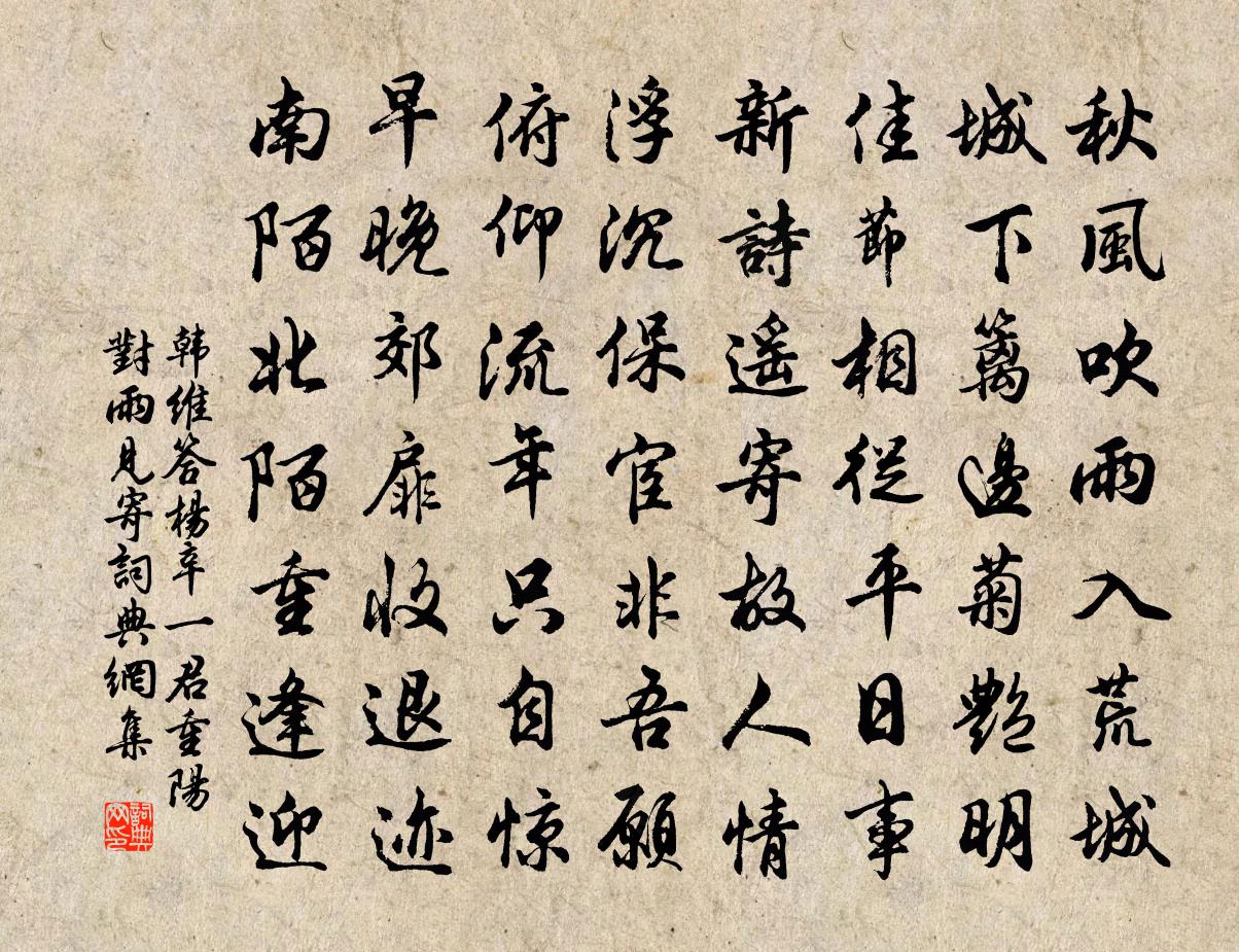 詩詞名句歷史字典書法欣賞書法字典國語詞典說文解字康熙字典古漢語字典標 題 作 者 詩 句 答楊辛一君重陽對雨見寄作者:韓維 朝代:宋代答楊辛一君重陽對雨見寄原文秋風吹雨入荒城,城下籬邊菊艷明。佳節相從平日事,新詩遙寄故人情。浮沉保宦非吾願,俯仰流年只自驚。早晚郊扉收退跡,南陌北陌重逢迎。詩詞問答問:答楊辛一君重陽對雨見寄的作者是誰?答:韓維問:答楊辛一君重陽對雨見寄寫於哪個朝代?答:宋代韓維答楊辛一君重陽對雨見寄書法欣賞答楊辛一君重陽對雨見寄書法作品詩詞推薦句釋洪英〔宋代〕一句不遑無著問,迄今猶作野盤僧。戊戌生日二首方回〔宋代〕貪得真迷境,持平實悟門。未妨人負我,各要子生孫。動輒聞誰死,猗嗟幸獨存。榮華何足記,衰翠不須論。句趙善詔〔宋代〕仁壽州如斗,分符愧岡功。起度律師同居東齋院韋應物〔唐代〕釋子喜相偶,幽林俱避喧。安居同僧夏,清夜諷道言。對閣景恆晏,步庭陰始繁。逍遙無一事,松風入南軒。宿松江驛卻寄蘇州一二同志(一作宿望亭驛寄蘇州同游)許渾〔唐代〕候館人稀夜自長,姑蘇台遠樹蒼蒼。江湖潮落高樓迥,河漢秋歸廣簟涼。月轉碧梧移鵲影,露低紅葉濕螢光。西園憶孟浩然唐彥謙〔唐代〕郊外凌兢西復東,雪晴驢背興無窮。句搜明月梨花內,趣入春風柳絮中。過天姥嶺黃宏〔宋代〕天姥連天橫,我過如牛脊。乃知李謫仙,夢遊言過實。徐生亦好奇,請問劉阮跡。安知古仙人,太平入鬼域。妖狐半年張榘〔宋代〕半年留鶴邑,歲晚倦重遊。雪柳帶春意,煙蕪生暮愁。怕看新鳳歷,忍拂舊貂裘。莫道知心少,相親有白鷗。陳嚴二君頻送蠟梅因以成詠趙蕃〔宋代〕綴蠟為花荊作枝,列為梅種自何時。詩多劃木初無與,賢比蘭荃又見遺。只道品題終不遇,豈期坡谷解相知。卻憐十二時行孝文白居易〔唐代〕夜半子,孝養父母存終始。百年恩愛暫時間,莫學愚人不歡喜。水龍吟(賦芍藥)盧祖皋〔宋代〕杜鵑啼老春紅,翠陰滿眼愁無奈。飛來何處,鳳軿鸞馭,霞裾雲佩。風檻嬌憑,露梢慵嚲,酒濃微退。念洛陽人去關山月霍總〔唐代〕珠瓏翡翠床,白皙侍中郎。五日來花下,雙童問道傍。到門車馬狹,連夜管弦長。每笑東家子,窺他宋玉牆。樂全先生生日,以鐵拄杖為壽,二首蘇軾〔宋代〕二年相伴影隨身,踏遍江湖草木春。擿石舊痕猶在眼,閉門高節慾生鱗。畏途自衛真無敵,捷徑爭先卻累人。遠寄將至醴陵楊萬里〔宋代〕行盡崎嶇峽,初逢熨帖坡。寒從平野有,雨傍遠山多。也自長沙近,其如此路何?披丈渾不惡,凍手奈頻呵。太常引姬翼〔元代〕人生弱喪自迷方。來往恰如狂。泥里弄泥團。竟不識、神珠夜光。幾多風雨,幾回磨滅,爭肯暫回惶。何處是家鄉和象翁絕句衛宗武〔宋代〕春花色色俱成夢,夏實纍纍結滿枝。獨有葵榴媚清晝,薰風時度五弦詩。寄潮州於公九流趙希晝〔宋代〕扁舟如葉路東西,一片灘聲下惡豀。當日亭台舊時客,相逢莫惜醉如泥。偈釋祖印〔宋代〕昔日南泉親斬卻,今朝耶舍示玄徒。而今賣與諸禪客,文契分明要也無。昇州保寧寺鳳皇亭祖無擇〔宋代〕鳳台雖舊址,亭榭斬新開。荊棘榛蕪去,江山氣象來。明君虞氏化,賢守次公才。遲爾離丹穴,飛飛止此台。如魚水(二之二·仙呂調)柳永〔宋代〕帝里疏散,數載酒縈花系,九陌狂游。良景對珍筵惱,佳人自有風流。勸瓊甌。絳唇啟、歌發清幽。被舉措、藝足名句推薦安民可與為義,而危民易與為非賈誼《過秦論》 春風對青冢,白日落梁州。張喬《書邊事》 梅子黃時日日晴,小溪泛盡卻山行曾幾《三衢道中》 想翠竹、碧梧風采,舊遊何處。張寧《滿江紅·題碧梧翠竹送李陽春》 大家漸及消亡,難期其復振,勢成於因循也。王永彬《圍爐夜話·第三七則》 秋花冒綠水,密葉羅青煙。李白《古風·其五十九》 又有牆頭千葉桃,風動落花紅蔌蔌。元稹《連昌宮詞》 親賢臣,遠小人。諸葛亮《出師表/前出師表》 心心視春草,畏向階前生。王維《雜詩三首 / 雜詠三首》 梳洗罷,獨倚望江樓。溫庭筠《望江南·梳洗罷》