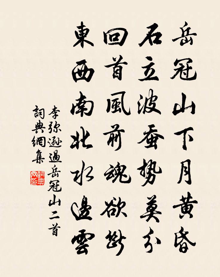 詩詞名句歷史字典書法欣賞書法字典國語詞典說文解字康熙字典古漢語字典標 題 作 者 詩 句 過岳冠山二首作者:李彌遜 朝代:宋代過岳冠山二首原文岳冠山下月黃昏,石立波蠶勢莫分。回首風前魂欲斷,東西南北水邊雲。詩詞問答問:過岳冠山二首的作者是誰?答:李彌遜問:過岳冠山二首寫於哪個朝代?答:宋代李彌遜過岳冠山二首書法欣賞過岳冠山二首書法作品詩詞推薦到梅山次韻弟茝陳著〔宋代〕相對兩衰翁,此心無復童。幸叨無事坐,貧欠有錢通。菜粥琴書畫,梅花雪月風。黃塵在門外,勞隱是英雄。頌古八首釋元聰〔宋代〕倒腹傾腸說向伊,不知何故尚遲疑。只今便好猛提取,莫待天明失卻雞。廬山東林寺夜懷李白〔唐代〕我尋青蓮宇,獨往謝城闕。霜清東林鐘,水 * 溪月。天香生虛空,天樂鳴不歇。宴坐寂不動,大千入毫髮。湛然晚步吳則禮〔宋代〕暮林帶斜日,隱隱聞疏鍾。息憊有孤石,扶衰憐短筇。垂楊暖自綠,春事老渾慵。正念余影獨,忽與幽鳥逢。點絳唇辛棄疾〔宋代〕身後功名,古來不換生前醉。青鞋自喜。不踏長安市。竹外僧歸,路指霜鍾寺。孤鴻起。丹青手裡。剪破松江水。隋王鼓吹曲 出藩曲謝朓〔南北朝〕雲枝紫微內。分組承明阿。飛艎遡極浦。旌節去關河。眇眇蒼山色。沉沉寒水波。鐃音巴渝曲。簫鼓盛唐歌。夫君戲贈子仁侄楊萬里〔宋代〕小阮新來覓句忙,自攜破硯汲寒江。天公念子抄詩苦,借與朝陽小半窗。過宋州李端〔唐代〕睢陽陷虜日,外絕救兵來。世亂忠臣死,時清明主哀。荒郊春草遍,故壘野花開。欲為將軍哭,東流水不回。柳溪對雪司馬光〔宋代〕春風不勝雪,散漫渡龍沙。密映緣溪柳,爭飛亂眼花。鴟夷賒美酒,油壁擊輕車。塞下芳菲晚,柳將當物華。詠雁趙蕃〔宋代〕胡為去關塞,何事落江湖。歲月常違燕,飛鳴每候奴。菰蒲雖足樂,矰繳絕須虞。矯矯其高舉,紛紛莫下俱。從軍別家竇鞏〔唐代〕自笑儒生著戰袍,書齋壁上掛弓刀。如今便是征人婦,好織回文寄竇滔。柳崔櫓〔唐代〕風慢日遲遲,拖煙拂水時。惹將千萬恨,系在短長枝。骨軟張郎瘦,腰輕楚女飢。故園歸未得,多少斷腸思。偈頌一百四十一首釋師範〔宋代〕炎炎六月,飄風灑雪。百丈耳聾,黃蘗吐舌。海闊山高誰與輪,一回飲水一回噎。贈竟陵盧使君虔別孟郊〔唐代〕赤日千里火,火中行子心。孰不苦焦灼,所行為貧侵。山木豈無涼,猛獸蹲清陰。歸人憶平坦,別路多嶇嶔。賴得句鄭獬〔宋代〕東飛江雲北飛燕,同寄青春不相見。喜友人再面裴說〔唐代〕一別幾寒暄,迢迢隔塞垣。相思長有事,及見卻無言。靜坐將茶試,閒書把葉翻。依依又留宿,圓月上東軒。桑中佚名〔先秦〕爰采唐矣?沬之鄉矣。雲誰之思?美孟姜矣。期我乎桑中,要我乎上宮,送我乎淇之上矣。爰采麥矣?沬之北矣。卜居白玉蟾〔宋代〕路似羊腸繞,溪如燕尾分。青山相領略,許我一丘雲。冰壺亭趙汝譡〔宋代〕孰是群動主,天機在靈關。深居默自照,瑕垢寧得乾。昭昭素絲義,幕佐實郡端。身潔吏所貴,心精士其難。請將鷓鴣天石孝友〔宋代〕玉燭調元黍律勻。迎長嘉節屬芳辰。雲如惜雨鉤牽雪,梅不禁風漏泄春。天意好,物華新。偷閒贏取酒邊身。太平名句推薦矮紙斜行閒作草,晴窗細乳戲分茶。陸游《臨安春雨初霽》 千淘萬漉雖辛苦,吹盡狂沙始到金。劉禹錫《浪淘沙九首》 曲闌深處重相見,勻淚偎人顫。納蘭性德《虞美人·曲闌深處重相見》 日月盈昃,辰宿列張。周興嗣《千字文·全文》 西風潑眼山如畫,有黃花休恨無錢。張可久《風入松·九日》 但將千歲葉,常奉萬年杯。趙彥昭《奉和元日賜群臣柏葉應制》 有無相生,難易相成,長短相形,高下相傾,音聲相和,前後相隨。老子《老子·道經·第二章》 詩酒趁年華。蘇軾《望江南·超然台作》 楊柳青青江水平,聞郎江上唱歌聲。劉禹錫《竹枝詞二首·其一》 寒雨連天夜入吳,平明送客楚山孤。王昌齡《芙蓉樓送辛漸二首》