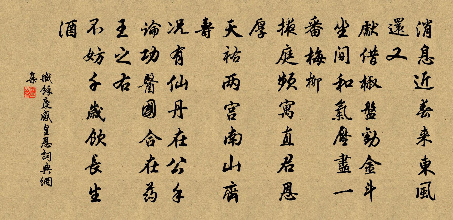 詩詞名句歷史字典書法欣賞書法字典國語詞典說文解字康熙字典古漢語字典標 題 作 者 詩 句 感皇恩作者:臧餘慶 朝代:宋代感皇恩原文訊息近春來,東風還又。先借椒盤勸金斗。坐間和氣,壓盡一番梅柳。掖庭頻寓直,君恩厚。天祐兩宮,南山齊壽。況有仙丹在公手。論功醫國,合在藥王之右。不妨千歲飲,長生酒。詩詞問答問:感皇恩的作者是誰?答:臧餘慶問:感皇恩寫於哪個朝代?答:宋代問:感皇恩是什麼體裁?答:詞臧餘慶感皇恩書法欣賞感皇恩書法作品詩詞推薦女冠子(夏景)柳永〔宋代〕火雲初布。遲遲永日炎暑。濃陰高樹。黃鸝葉底,羽毛學整,方調嬌語。薰風時漸勸,峻閣池塘,芰荷爭吐。畫梁偈頌二十四首釋智遇〔宋代〕人間無,天上有,往往無人脫窠臼。四海娟娟洗玉魂,九野茫茫白兔走。寒山子,不關口,也落馬駒群隊後。閒居釋行海〔宋代〕蕩蕩空山草木青,枝禽飛下菜池冰。夜深月照茅檐靜,翠石幽泉落幾層。偈釋寶覺〔宋代〕一即一,二即二,嗅著直是無香氣。識得山僧榔栗條,莫向南山尋鱉鼻。北征杜甫〔唐代〕皇帝二載秋,閏八月初吉。杜子將北征,蒼茫問家室。維時遭艱虞,朝野少暇日。顧慚恩私被,詔許歸蓬蓽。拜辭蒼溪山寺文同〔宋代〕正午風色高,遂泊蒼溪縣。層崖抱林木,有寺藏蔥蒨。出船步危磴,蔭密頗索轉。上到金仙家,緣空列台殿。修篁和中丞奉使承恩,還終南舊居皇甫冉〔唐代〕軒車尋舊隱,賓從滿郊園。蕭散煙霞興,殷勤故老言。謝公山不改,陶令菊猶存。苔蘚侵垂釣,松篁長閉門。風霜題袁州邵錄三老圖王義山〔宋代〕不夸九老寫成圖,要似一家三老無。滿把壽觴拼一醉,父前母后子來扶。曾子易簀佚名〔先秦〕曾子寢疾,病。樂正子春坐於床下,曾元、曾申坐於足,童子隅坐而執燭。童子曰:“華而睆,大夫之簀與?”子送胡仲方西歸陳宓〔宋代〕後進無因見老成,一覘風采快平生。南來幸有同寮契,西去寧無惜別情。五載官聯親懿德,遠夷君長慕清名。明時芷溪園侯畐〔宋代〕行吟溪上園,幽思與詩便。藤附多年樹,苔生廢井泉。瘦梅鋤月種,蔓菊就籬編。更有三間屋,重茅蓋竹椽。讀秦紀陳恭尹〔清代〕謗聲易弭怨難除,秦法雖嚴亦甚疏。夜半橋邊哼孺子,人間猶有未燒書。奉酬西川武相公晨興贈友見示之作竇群〔唐代〕碧樹分曉色,宿雨弄清光。猶聞子規啼,獨念一聲長。眷眷軫芳思,依依寄遠方。情同如蘭臭,惠比返魂香。新什和樂天耳順吟兼寄敦詩劉禹錫〔唐代〕吟君新什慰蹉跎,屈指同登耳順科。鄧禹功成三紀事,孔融書就八年多。已經將相誰能爾,拋卻丞郎爭奈何。獨恨句李埴〔宋代〕日射紅鸞扇,風清白野樽。一剪梅佚名〔宋代〕粗布寬衣下領袍。一襟瀟灑,兩袖飄飄。水雲活計伴漁樵。過得今宵,莫問來朝。九節蒼龍杖一條。仙經數卷,肩永遇樂(夏至)史浩〔宋代〕日永繡工,減卻一線,節臨短至。幸有杯盤,隨分快樂,□得醺醺醉。尋思塵世,寒來暑往,凍極又還熱熾。恰如得宣州竇尚書書因投寄二首羅隱〔唐代〕雙魚迢遞到江濱,傷感南陵舊主人。萬里朝台勞寄夢,十年侯國阻趨塵。尋知亂後嘗辭祿,共喜閒來得養神。時見偈頌七十二首釋祖欽〔宋代〕老杜風前得句時,等閒開口便成詩。就中一著巴鼻,卻把驢兒當馬騎。秋氣宋祁〔宋代〕清濁還二儀,秋氣颯然肅。溪潔潦已殘,林疏條自矗。寒蛩思長階,歸燕眷華屋。凋年自茲始,鄉懷念松菊。名句推薦願君多採擷,此物最相思。王維《相思》 重見金英人未見,相思一夜天涯遠晏幾道《蝶戀花· * 開時傷聚散》 留連戲蝶時時舞,自在嬌鶯恰恰啼。杜甫《江畔獨步尋花·其六》 從臣皆半醉,天子正無愁。李商隱《陳後宮》 秋已無多,早是敗荷衰柳。潘希白《大有·九日》 青紫雖被體,不如早還鄉。杜甫《夏夜嘆》 將欲歙之,必故張之;將欲弱之,必故強之;將欲廢之,必故興之;將欲取之,必故與之。老子《老子·道經·第三十六章》 善歌者,使人繼其聲;善教者,使人繼其志。戴聖《禮記·學記》 小姑織白紵,未解將人語。李白《湖邊採蓮婦》 春風知別苦,不遣柳條青。李白《勞勞亭》