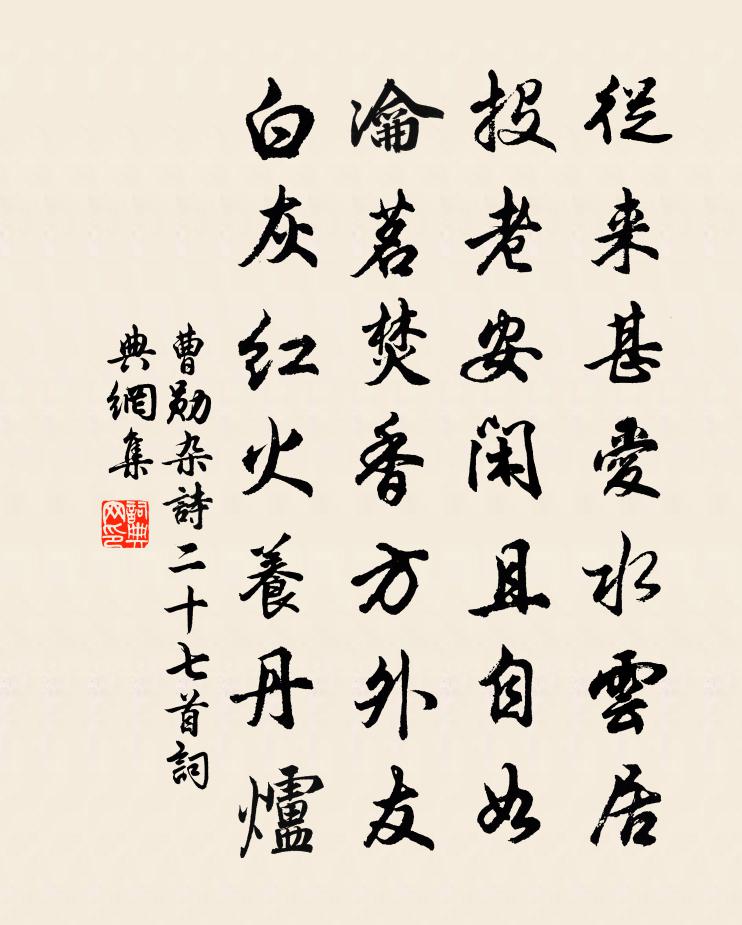 詩詞名句歷史字典書法欣賞書法字典國語詞典說文解字康熙字典古漢語字典標 題 作 者 詩 句 雜詩二十七首作者:曹勛 朝代:宋代雜詩二十七首原文從來甚愛水雲居,投老安閒且自如。瀹茗焚香方外友,白灰紅火養丹爐。詩詞問答問:雜詩二十七首的作者是誰?答:曹勛問:雜詩二十七首寫於哪個朝代?答:宋代曹勛雜詩二十七首書法欣賞雜詩二十七首書法作品詩詞推薦傷何皆秀才梅堯臣〔宋代〕高高空山木,枯死不中材。寧答厚地力,歲久為朽灰。昂藏儒家子,五十殞蒿萊。空負執卷勤,明月不頷顋。一芥城南道中有感陸游〔宋代〕行李蕭然一束書,城南觸目更愁予。市門乞食僧持缽,關路喔詩客跨驢。殘發無多真已矣,名山未去獨何歟?芒鞋前用吉字韻問嚴子文疾再和問疾之詩不工甚矣崔敦禮〔宋代〕日來間何闊,坐見月初吉。欲往扣齋扉,政恐勞取瑟。聞公清淨緣,巧笑卻銀櫛。露骨秀寒松,烘晹嚥暖日。鍾乳再用前韻答徐聖可仲並〔宋代〕乃翁儒學似文翁,韻句天然無異同。社稷堂堂推故相,家庭挺挺見遺風。詞場已擅千軍敵,詩律仍驚萬馬空。願報無漏子 景金本注云,三首本名更漏子 樂道丘處機〔元代〕去年禾,今歲麥。陸地如雲充塞。豐稔世,太平年。黎民各坦然。眾心安,閒客易。到處逍遙無事。昏告宿,餒求登龍瑞觀北岩方乾〔唐代〕縱目下看浮世事,方知峭崿與天通。湖邊風力歸帆上,嶺頂雲根在雪中。促韻寒鍾催落照,斜行白鳥入遙空。前人新作西北門樓韓維〔宋代〕赤白崔嵬晚照間,投閒時復一躋攀。時平守望皆無用,添得清秋數點山。滌愫鄭樵〔宋代〕修身以為弓,矯思以為矢。立義以為的,亦云善擬議。嗚呼彼鴻漸,進德亦猶水。我如罵其說,木舌暢所指。和范元作五絕胡寅〔宋代〕馬遷法左氏,實錄系日月。孰傳經世學,儻可論絕筆。何太宰生日二首強至〔宋代〕卻數中秋已過旬,老君親送玉麒麟。力侔二氣文詞重,迥繼諸公德業醇。論道他年要黃髮,看公當世斡洪鈞。泰山使東川亞枝紅元稹〔唐代〕平陽池上亞枝紅,悵望山郵事事同。還向萬竿深竹里,一枝渾臥碧流中。山居寂寥與世如隔是非不到榮辱兩忘因憶秋崖吳錫疇〔宋代〕我愛山居好,茶甌困解圍。松邊橫蘚石,柳下敞漁扉。細雨噞喁出,斜陽觳觫歸。交情殊貴賤,似覺故人非。宿董山寺陳峴〔宋代〕送客聯鑣歸,得得招提宿。晚渡滄江口,路入青山曲。突兀忽在眼,一洗賓士俗。然燈遽呼酒,僧留供野蔌。林高織圖二十四首大起樓璹〔宋代〕盈箱大起時,食桑聲似雨。春風老不知,蠶婦忙如許。呼兒刈青麥,朝飯已過午。妖歌得綾羅,不易青裙女。次韻梁粹方岳〔宋代〕只與青山對成居,白雲侵屨有詩無。故人咫尺隔千里,明月嬋娟共一壺。鷗鷺盟應憐久客,梧桐雨亦問歸塗。近來曹娥江蘇泂〔宋代〕月下傾殘酒,風前讀斷碑。采江那有意,陟岵不無悲。樹影經船疾,灘聲到枕遲。重來更何日,放棹欲何之。偈頌八十五首釋妙倫〔宋代〕華山突兀聳蒼穹,坐斷坤維千萬峰。潘閬騎驢山下過,只聞啼鳥鬧春風。遺直堂六首韓元吉〔宋代〕種木已如此,高賢有餘思。賴公酷似舅,其誰羨牢之。夜泊法忍寺趙孟堅〔宋代〕秋泊禪扉夜,清吟入興頻。風生水鱗甲,雲放月精神。禪有機鋒祠,詩無句法新。舊題尋不見,吹遍壁間塵。春日五首劉克莊〔宋代〕步入西峰不見人,數聲澗鳥自啼春。下山欲與唐碑語,先遣奴兵細拂塵。名句推薦飛絮濛濛。垂柳闌乾盡日風。歐陽修《採桑子·群芳過後西湖好》 以繩墨取木,則宮室不成矣。呂不韋《呂氏春秋·覽·離俗覽》 燕子欲歸時節,高樓昨夜西風。晏殊《破陣子·燕子欲歸時節》 古之為政,愛人為大戴聖《禮記·哀公問》 國有賢相良將,民之師表也。司馬遷《史記·七十列傳·太史公自序》 一念慈祥,可以醞釀兩間和氣;寸心潔白,可以昭垂百代清芬。洪應明《菜根譚·概論》 不以規矩,不能成方圓孟子《孟子·離婁章句上·第一節》 想文君望久,倚竹愁生步羅襪。姜夔《八歸·湘中送胡德華》 且憑天子怒,復倚將軍雄。高適《塞下曲》 腸已斷,淚難收。相思重上小紅樓。辛棄疾《鷓鴣天·晚日寒鴉一片愁》