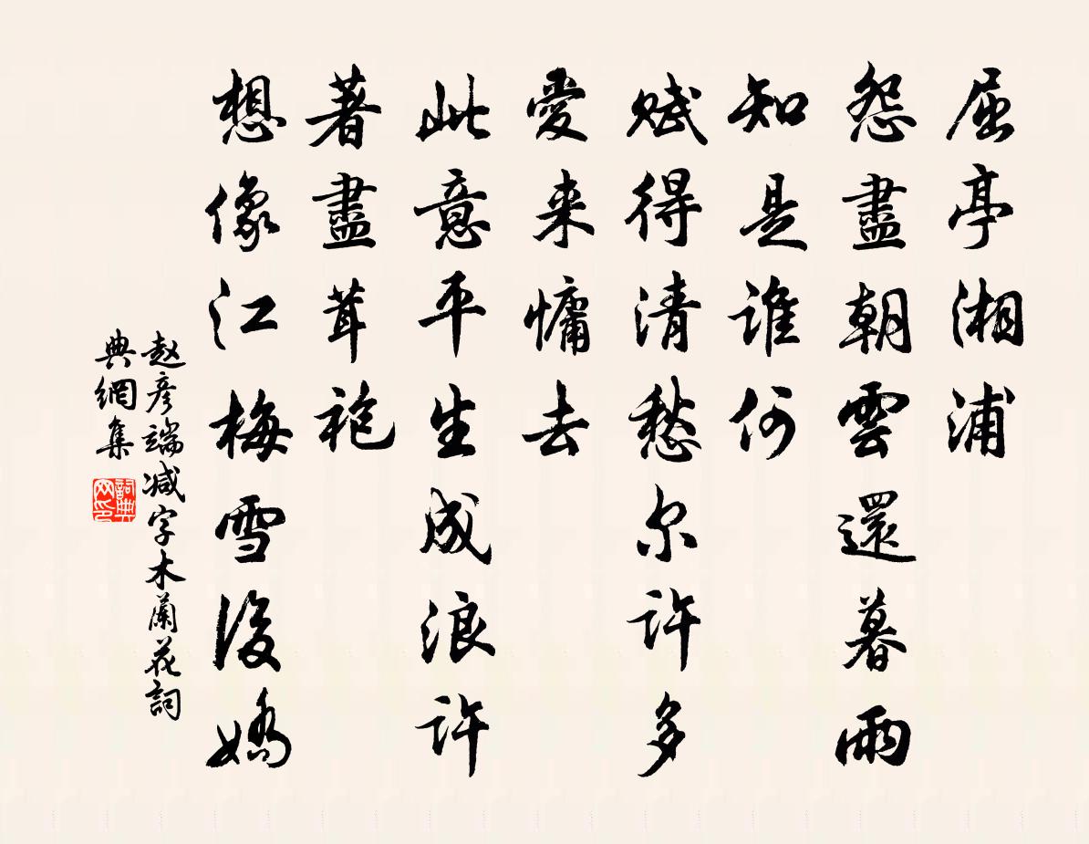 詩詞名句歷史字典書法欣賞書法字典國語詞典說文解字康熙字典古漢語字典標 題 作 者 詩 句 減字木蘭花作者:趙彥端 朝代:宋代減字木蘭花原文屈亭湘浦。怨盡朝雲還暮雨。知是誰何。賦得清愁爾許多。愛來慵去。此意平生成浪許。著盡茸袍。想像江梅雪後嬌。詩詞問答問:減字木蘭花的作者是誰?答:趙彥端問:減字木蘭花寫於哪個朝代?答:宋代問:減字木蘭花是什麼體裁?答:詞趙彥端減字木蘭花書法欣賞減字木蘭花書法作品詩詞推薦殘春白玉蟾〔宋代〕昨日春光更水涯,水涯今日已春賒。春歸只道無蹤跡,尚有青苔一片段預告。聽楊君彈古操陳郁〔宋代〕年來雅道類聾瘖,到處笙歌只勸淫。肯抱焦桐閒訪隱,應思塵世少知音。離鸞別鵠皆風月,二典三盤不古今。聞子浣溪沙趙長卿〔宋代〕一味風流一味香。十分濃艷十分妝。自然嬌態自然芳。樓上好風樓下水,雪前欄檻竹前窗。也宜單著也宜雙。熱華岳〔宋代〕翠微家在大江東,五月鞭驢入建中。雲烈火車天穀雨,汗淹香葛扇無風。不求殿閣千間庇,卻喜岩泉一線通。為汲至揚州文天祥〔宋代〕路逢敗屋作雞棲,白屋荒荒鬼哭悲。袖有金錢無米糴,假饒有米亦無炊。夜宿太清悟真成道宮白玉蟾〔宋代〕朱樓紫殿貼晴空,前後千峰更萬峰。蝶殢秋花黃淡佇,猿啼曉樹翠溟濛。斷霞煙重苔粘露,薄暮雲興夜起風。醉倚寄深居馮發管釋斯植〔宋代〕相懷千里外,空望極遙天。處世唯今日,看花憶去年。春風生島樹,夜月滿漁船。此後閒尋處,應須借榻眠。贈京尹八首袁燮〔宋代〕儒學當年究指歸,服勞王事不言疲。遙知今日張京尹,不瑕閨房畫婦眉。清口懷應書時雪中舟行晁補之〔宋代〕蚤歲單舟此水濱,雪花都蔽引舟人。重來五馬真何事,笑雪空成鬢上春。久病灼艾後獨臥有感陸游〔宋代〕白帝城高暮柝傳,幽窗搔首亦蕭然。江邊雲濕初橫雁,牆下桐疏不庇蟬。計出火攻傷老病,臥聞鳶墜嘆蠻煙。諸賢枕上鄭剛中〔宋代〕三面屏圍屈曲山,篆爐灰冷柏無煙。霜鐘不管春陽薄,聲到寒窗各夢邊。芭蕉曾幾〔宋代〕以此葉陰涼,代彼青琅玕。但恐本質脆,不堪期歲寒。一落索(信守王道夫席上和趙達夫賦金林檎韻)辛棄疾〔宋代〕錦帳如雲處。高不知重數。夜深銀燭淚成行,算都把、心期付。莫待燕飛泥污。問花花訴。不知花定有情無,似卻次韻丁評事春雨強至〔宋代〕溪樓燕子懶飛飛,一鼓輕雷漸作威。細濯林花紅抹淺,低蒙岸柳翠花微。偶穿縱步尋山屐,且解銷憂貰酒衣。華表豆葉黃陸游〔宋代〕一春常是雨和風,風雨晴時春已空。誰惜泥沙萬點紅。恨難窮,恰似衰翁一世中。旦氣詩陳普〔宋代〕書氣如大霧,蒙我大明鏡。主人莫如鄉,奴柰竊權柄。不能巍巍蒞,惟聽紛紛命。是非既昧瞀,操執豈中正。不惟游蔡峰道中三首碧渚庵前陳著〔宋代〕恩袍拜後兩周星,今日西行得再經。休問庵中僧在否,滿檐松竹舊時青。勉送吳國三五新戒歸齊己〔唐代〕法王遺制付仁王,難得難持劫數長。努力只須堅守護,三千八萬是垣牆。登幽州台歌陳子昂〔唐代〕前不見古人,後不見來者。念天地之悠悠,獨愴然而涕下。秋晚登城北門陸游〔宋代〕幅巾藜杖北城頭,捲地西風滿眼愁。一點烽傳散關信,兩行雁帶杜陵秋。山河興廢供搔首,身世安危人倚樓。橫槊名句推薦春色三分,二分塵土,一分流水。蘇軾《水龍吟·次韻章質夫楊花詞》 禁里疏鍾官舍晚,省中啼鳥吏人稀。王維《酬郭給事 / 贈郭給事》 向來吟秀句,不覺已鳴鴉。韓翃《酬程延秋夜即事見贈》 同是人,類不齊,流俗眾,仁者希。李毓秀《弟子規·親仁》 公乎躍馬揚玉鞭,滅沒高蹄日千里。溫庭筠《拂舞詞 / 公無渡河》 漢家天子今神武,不肯和親歸去來。王之渙《涼州詞二首》 獨自淒涼還自遣,自製離愁。龔自珍《浪淘沙·寫夢》 飛花兩岸照船紅,百里榆堤半日風。陳與義《襄邑道中》 江山易改,稟性難移。馮夢龍《醒世恆言·卷三十五》 寄書長不達,況乃未休兵。杜甫《月夜憶舍弟》