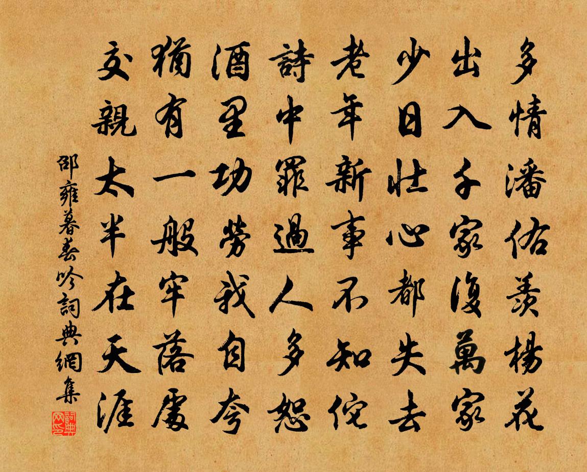 詩詞名句歷史字典書法欣賞書法字典國語詞典說文解字康熙字典古漢語字典標 題 作 者 詩 句 暮春吟作者:邵雍 朝代:宋代暮春吟原文多情潘佑羨楊花,出入千家復萬家。少日壯心都失去,老年新事不知佗。詩中罪過人多恕,酒里功勞我自誇。猶有一般牢落處,交親太半在天涯。詩詞問答問:暮春吟的作者是誰?答:邵雍問:暮春吟寫於哪個朝代?答:宋代邵雍暮春吟書法欣賞暮春吟書法作品詩詞推薦謁金門·春漏促韋莊〔唐代〕春漏促,金燼暗挑殘燭。一夜簾前風撼竹,夢魂相斷續。有個嬌嬈如玉,夜夜繡屏孤宿。閒抱琵琶尋舊曲,遠山眉臨川水驛汪元量〔宋代〕羊角山高鎖戰塵,春風吹草綠孤城。鵲巢遜與鳩夫婦,燕幙能容雁弟兄。今古廢興棋一著,萍蓬聚散酒三行。悲歌冬夜示敏巢(時在東都宅)白居易〔唐代〕爐火欲銷燈欲盡,夜長相對百憂生。他時諸處重相見,莫忘今宵燈下情。偈傾一百六十九首釋智朋〔宋代〕大地皆凍鎖,遍界熱如火。時節不放過,衲僧多蹉過。不蹉過,深雪之中有一個。晨炊浦村楊萬里〔宋代〕水出何村尾,橋橫亂筱叢。隔溪三四屋,對面一雙峰。過午非常暖,疑他不是冬。疏梅照清淺,作意為誰容?橫吹曲辭。出塞竇威〔唐代〕匈奴屢不平,漢將欲縱橫。看雲方結陣,卻月始連營。潛軍渡馬邑,揚旆掩龍城。會勒燕然石,方傳車騎名。鳳棲梧 先天觀作尹志平〔元代〕山後風光何處好。上谷靈蹤,自古軒轅廟。湧出清流方曲繞。森森綠檜知多少。雲水閒遊今日到。信筆狂吟,自在秋雨陸游〔宋代〕西山雲千重,東園泥一尺。可憐牆下路,十日無履跡。空庭桐葉盡,古甃土花碧。坐懷江湖間,病鴈濕羽翮。寒窗九日閒居寄登高數子錢起〔唐代〕初服棲窮巷,重陽憶舊遊。門閒謝病日,心醉授衣秋。酒盡寒花笑,庭空暝雀愁。今朝落帽客,幾處管弦留。蘊聞禪人請贊釋宗杲〔宋代〕蘊聞聞自性,自性離聞蘊。吾真亦復然,迥迢千聖頂。題武關李涉〔唐代〕來往悲歡萬里心,多從此路計浮沉。皆緣不得空門要,舜葬蒼梧直到今。答趙生紅梨花詩謝金蓮〔宋代〕本分天然白雪香,誰知今日卻濃妝。鞦韆院落溶溶月,羞覩紅脂睡海棠。寄滿粹翁王令〔宋代〕滿子吾逢久,皇皇未見閒。老成終到孔,窮死亦為顏。學術思無際,誠明去一間。吾雖有心者,力苦未能攀。山行張弋〔宋代〕偶作山行只杖藜,歸逢寒日下山詩。與僧並立看紅樹,忽有鶴來棲樹枝。四月望再游西湖十首陳造〔宋代〕前時小舫冒氛昏,重到輕橈破麴塵。湖面風煙飽姿態,一番到眼一番新。皇帝合春帖子六首蘇頌〔宋代〕光宅唐堯日,暄和太昊春。德如天溥愛,性與帝同仁。滿江紅蔡伸〔宋代〕人倚金鋪,顰翠黛、盈盈墮睫。話別處、留連無計,語嬌聲咽。十幅雲帆風力滿,一川煙暝波光闊。但回首、極目送李著作赴四明趙湘〔唐代〕暫辭芸閣伴,欲上海邊城。地近瀛州見,山連越水迎。駐帆寒草動,移旆曉霞明。到日新題出,登高待雪晴。揚州城樓陳沆〔清代〕濤聲寒泊一城孤,萬瓦霜中聽雁呼。曾是綠楊千樹好,只今明月一分無。穹商日夜荒歌舞,樂歲東南困轉輪。道誼李粹伯對月見懷次韻曾協〔宋代〕初收雨腳萬絲懸,妙手誰人補漏天。佳月素華迷夜旦,好詩餘味滿中邊。裴徊無奈謝希逸,齁齁總輸邊孝先。見說名句推薦為無為,事無事,味無味。老子《老子·德經·第六十三章》 夕陽牛背無人臥,帶得寒鴉兩兩歸。張舜民《村居·水繞陂田竹繞籬》 可憐青冢已蕪沒,尚有哀弦留至今。王安石《明妃曲二首》 楓樹夜猿愁自斷,女蘿山鬼語相邀李商隱《楚宮》 圓荷浮小葉,細麥落輕花。杜甫《為農》 蜀國曾聞子規鳥,宣城還見杜鵑花。李白《宣城見杜鵑花 / 子規》 深夜無風新雨歇,涼月,露迎珠顆入圓荷。閻選《定風波·江水沉沉帆影過》 故大人之務,將在於眾賢而已。墨子《墨子·08章 尚賢(上)》 雲來山更佳,雲去山如畫。張養浩《雁兒落兼得勝令》 桃花洞,瑤台夢,一片春愁誰與共?和凝《天仙子·柳色披衫金縷鳳》