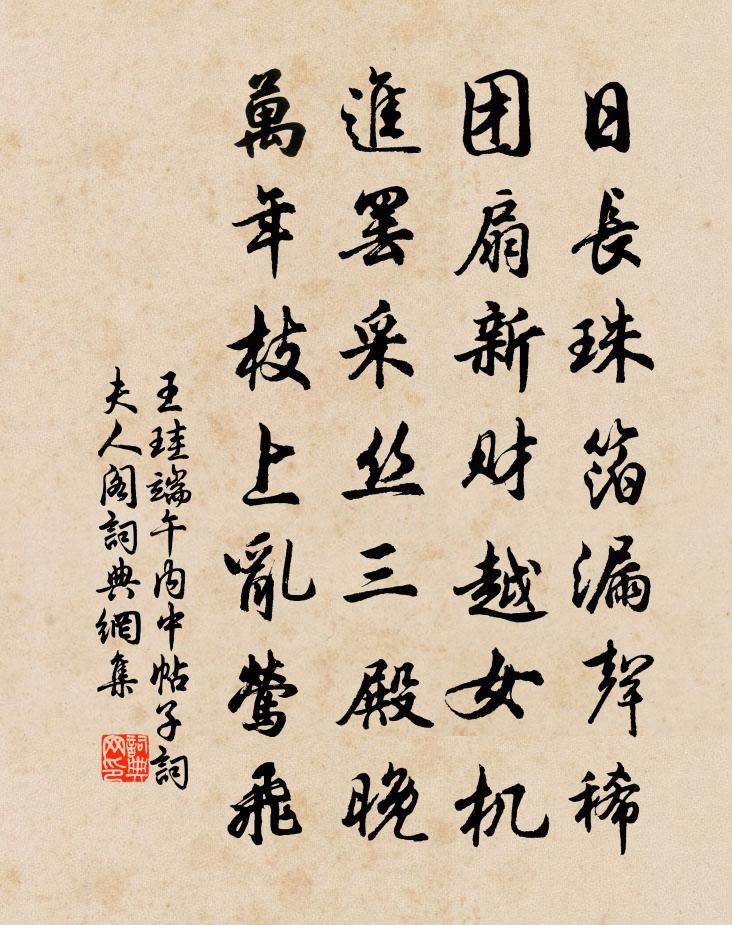詩詞名句歷史字典書法欣賞書法字典國語詞典說文解字康熙字典古漢語字典標 題 作 者 詩 句 端午內中帖子詞夫人閣作者:王珪 朝代:唐代端午內中帖子詞夫人閣原文日長珠箔漏聲稀,團扇新財越女機,進罷采絲三殿晚,萬年枝上亂鶯飛。詩詞問答問:端午內中帖子詞夫人閣的作者是誰?答:王珪問:端午內中帖子詞夫人閣寫於哪個朝代?答:唐代王珪端午內中帖子詞夫人閣書法欣賞端午內中帖子詞夫人閣書法作品詩詞推薦賽神曲陸游〔宋代〕擊鼓坎坎,吹笙嗚嗚。綠袍槐簡立老巫,紅衫繡裙舞小姑。烏臼燭明蠟不如,鯉魚糝美出神廚。老巫前致詞,小姑情詩其七倉央嘉措〔清代〕竟日冥思絕妙相,碧落黃泉兩茫茫。奈何紅顏一時現,不需枯坐與焚香。贈別鄒君昆仲趙蕃〔宋代〕湖北湖南路,俱行不憚疲。難追燎須意,姑慰倚門思。世士才華取,君家孝友基。更能知我友,相與切磋為。撫古晁說之〔宋代〕撫古論今百感生,興亡異世實同情。鬼神能告廣陵散,才智無如大廈傾。天御日躔歸故國,江潮淮浦謾新城。論都兒侄輩為燕老集石秀叔以詩來和之二首陳著〔宋代〕身是書中老僕童,布衣不溯馬頭風。雖無二頃資窮巷,猶有三峰著睡翁。虛室漫留莊叟白,新詩忽見相州紅。然時送高縉之歸謀武林結課二首陳造〔宋代〕眼底論人物,如君亦壯哉。作書猶乞米,造物不憐才。跋履妨詩筆,祛除近酒杯。飛塵棲劍室,歸棹莫遲回。兵部尚書席上作杜牧〔唐代〕華堂今日綺筵開,誰喚分司御史來?偶發狂言驚滿坐,三重粉面一時回。溪西李家丘葵〔宋代〕秧鍼初出未全青,昨夜岡頭冷雨晴。日暮採樵人去後,一痕淡月亂蛙鳴。西師底定伊犁捷音至詩以述事乾隆〔清代〕乘時命將定條枝,天佑人歸捷報馳。無戰有徵安絕域,壺漿簞食迎王師。兩朝締構敢石繼,百世寧綏有所思。好雨虞美人·愁痕滿地無人省納蘭性德〔清代〕愁痕滿地無人省,露濕琅玕影。閒階小立倍荒涼。還剩舊時月色在瀟湘。薄情轉是多情累,曲曲柔腸碎。紅箋向壁橫吹曲辭梅花落盧照鄰〔唐代〕梅嶺花初發,天山雪未開。雪處疑花滿,花邊似雪回。因風入舞袖,雜粉向妝檯。匈奴幾萬里,春至不知來。寄堯章蘇泂〔宋代〕聞似磻溪隱姓名,阿鬟仍是許飛瓊。涼風昨夜驚新雁,想見 * 又月明。偈頌七十六首釋師範〔宋代〕徑山門下,無彼無我。大家疊足挨肩,共向無煙宿火。若是香匙火箸,不得動著。不見道丹霞燒木佛,院主眉須墮送獨孤煥評事赴豐州姚合〔唐代〕東門攜酒送廷評,結束從軍塞上行。深磧路移唯馬覺,斷蓬風起與雕平。煙生遠戍侵雲色,冰疊黃河長雪聲。須鑿插秧歌劉學箕〔宋代〕農夫楫楫清波闊,秧稻茸茸森石發。父兒呼喚手拔齊,千把萬把根連泥。四更乘月躇隴陌,曉煙漸散東方白。歸來送張少卿赴召十首李新〔宋代〕四海傾瞻調鼎手,朝廷側席待伊周。江城父老休遮道,可是星車肯少留。求酒於鄰袁說友〔宋代〕太息官寒獨養疴,浮生半作病維摩。新涼欲學東城醉,亡奈維罍已恥何。龍泉寺石井二首王安石〔宋代〕人傳湫水未嘗枯,滿底蒼苔亂髮粗。四海旱多霖雨少,此中端有臥龍無。仙人篇曹植〔魏晉〕仙人攬六著。對博太山隅。湘娥拊琴瑟。秦女吹笙竽。玉樽盈桂酒。河伯獻神魚。四海一何局。九州安所知。韓終舞曲歌辭。吳俞兒舞歌。弩俞陸龜蒙〔唐代〕牛來開弦,人為置鏃。捩機關,迸山谷。鹿駭澀,隼擊遲。析毫中睫,洞腋分龜。達堅壘,殘雄師,可以冠猛樂壯名句推薦三冬暫就儒生學,千耦還從父老耕。陸游《觀村童戲溪上》 兼聽則明,偏信則暗。司馬光《資治通鑑·唐紀八》 汾水碧依依,黃雲落葉初飛。孫光憲《河瀆神·汾水碧依依》 四十年來家國,三千里地山河李煜《破陣子·四十年來家國》 綠萼添妝融寶炬,縞仙扶醉跨殘虹曹雪芹《詠紅梅花得“紅”字》 弱冠弄柔翰,卓犖觀群書。左思《詠史八首·其一》 塞上長城空自許,鏡中衰鬢已先斑。陸游《書憤五首·其一》 滿目飛花萬點,回首故人千里,把酒沃愁腸。葛長庚《水調歌頭·江上春山遠》 機不密,禍先行。馮夢龍《醒世恆言·卷二十》 桃花落,閒池閣。山盟雖在,錦書難托。陸游《釵頭鳳·紅酥手》