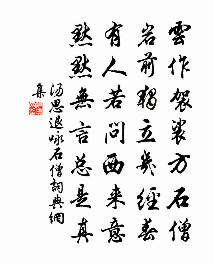 詩詞名句歷史字典書法欣賞書法字典國語詞典說文解字康熙字典古漢語字典標 題 作 者 詩 句 詠石僧作者:湯思退 朝代:宋代詠石僧原文雲作袈裟方石僧,岩前獨立幾經春。有人若問西來意,默默無言總是真。詩詞問答問:詠石僧的作者是誰?答:湯思退問:詠石僧寫於哪個朝代?答:宋代湯思退詠石僧書法欣賞詠石僧書法作品詩詞推薦北苑侍宴雜詠詩松徐鉉〔唐代〕細韻風中遠,寒青雪後濃。繁陰堪避雨,效用待東封。送夏肯父赴補杜范〔宋代〕之子問行李,策足游上都。晚風吹客袂,話別聊躊躇。朝家渴多士,璧水來英儒。子志橫四海,亦復隨群趨。磨礪夏日六言陸游〔宋代〕我是百年遺老,掃空一夢浮名。未到終南二華,且入天台四明。送別皎然〔唐代〕聞說情人怨別情,霜天淅瀝在寒城。長宵漫漫角聲發,禪子無心恨亦生。苦旱六首陳造〔宋代〕蒼生惜死所,倚須數寸澤。連朝油雲度,空勞問雨色。豐歉恐數然,造物莫為力。定知天屢陰,為爾動悽惻。撥棹子尹鶚〔唐代〕風切切,深秋月,十朵芙蓉繁艷歇。小檻細腰無力,空贏得,目斷魂飛何處說。寸心恰似丁香結,看看瘦盡胸前雪史鎮江丐得請仍進職趙汝鐩〔宋代〕帝念承流欲報功,力祈閶闔請琳宮。固知槐鼎身將愛,卻愛蓴鱸味不同。寶閣風雲雖學士,滄洲煙雨且漁翁。到家頌古三十一首釋玿〔宋代〕相逢打鼓弄琵琶,須是還他兩會家。曲罷不知何處去,夕陽斜映暮天霞。和吳公仲庶游海雲寺王霽〔宋代〕大師新謠十五州,殘春摸石是遨頭。氳氳喜氣隨民遍,冉冉風光盡日流。野俗只知觀燕賞,主人非獨為嬉遊。晚回觀胡文恭樞密全集偶成一首蘇籀〔宋代〕鏗鈜正始音,嚴密萃英耆。上仁體勛華,四方致雍熙。文賦鳴昇平,聲譽藝林馳。心口爛錦繡,欬唾皆珠璣。韜涵得天台命二首劉子翬〔宋代〕暖風環佩滿芳洲,貝闕珠宮憶舊遊。此日劉郎心似水,桃花空繞暮溪流。鄉思(用前韻)薛濤〔唐代〕峨嵋山下水如油,憐我心同不繫舟。何日片帆離錦浦,棹聲齊唱發中流。疊蒙林子長和章愈索愈奇未敢遽豎降旗猶能背虞儔〔宋代〕詩情引上碧天高,侍史毋辭走送勞。栗里正思陶靖節,愚溪不數柳儀曹。只慚同隊疎頭角,莫戀樊籠損羽毛。取友遣興三首文同〔宋代〕惻惻抱伊鬱,試此登嶕嶢。陰風吹繁雲,黯黯蒙泰霄。關河眇無際,節物何蕭蕭。過雁安所之,驚哀翻泬寥。幽懷將發石頭上烽火樓詩謝朓〔南北朝〕徘徊戀京邑。躑躅躧曾阿。陵高遲關近。眺逈風雲多。荊吳阻山岫。江海含瀾波。歸飛無羽翼。其如離別何。十六夜待月溪濱風露浩然宵中不寐李洪〔宋代〕昨夜中秋月,高唐妒素娥。憑誰修玉戶,未覺減金波。練淨前溪水,銀侵左界河。浩然風露爽,通夕祗長喔。次韻秋日五首姜特立〔宋代〕冉冉寒雲滃曉扉,涓涓墜露滴秋衣。興來倚杖看蒼石,無限空山木葉飛。初晴陸游〔宋代〕暑雨初收體為輕,遠山盡出眼偏明。詩憑寫興忘工拙,酒取澆愁任濁清。綠樹有陰休倦步,澄溪無滓濯塵纓。老人次韻翁士秀病起曾協〔宋代〕一間何闊昔未有,擬遣蒼頭問安否。果然示疾毗耶城,靜看醫方出吾肘。平生豪氣乾青雲,客疾來侵豈能久。已知王開府輓詞三首范祖禹〔宋代〕連帥諸侯長,維師列爵隆。儀刑憲萬國,眷禮視三公。白日年華盡,浮雲世事空。九原伊洛上,松柏自悲風。名句推薦籬落疏疏一徑深,樹頭花落未成陰。楊萬里《宿新市徐公店》 碧雲無渡碧天沉,是湖心,是儂心。張惠言《江城子·填張春溪西湖竹枝詞》 燕支長寒雪作花,蛾眉憔悴沒胡沙。李白《王昭君二首》 日射人間五色芝,鴛鴦宮瓦碧參差。元好問《浣溪沙·日射人間五色芝》 腸已斷,淚難收。相思重上小紅樓。辛棄疾《鷓鴣天·晚日寒鴉一片愁》 江燕話歸成曉別,水花紅減似春休。西風梧井葉先愁。吳文英《浣溪沙·秋情》 離一切諸相則名諸佛。鳩摩羅什譯《金剛經·離相寂滅》 新樣靚妝,艷溢香融,羞殺蕊珠宮女。趙佶《燕山亭·北行見杏花》 兩處春光同日盡,居人思客客思家。白居易《望驛台》 豆蔻連梢煎熟水,莫分茶。李清照《攤破浣溪沙·病起蕭蕭兩鬢華》