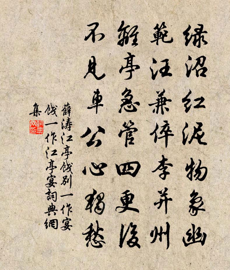 詩詞名句歷史字典書法欣賞書法字典國語詞典說文解字康熙字典古漢語字典標 題 作 者 詩 句 江亭餞別(一作宴餞,一作江亭宴)作者:薛濤 朝代:唐代原文綠沼紅泥物象幽,范汪兼倅李并州。離亭急管四更後,不見車公心獨愁。詩詞問答問:《江亭餞別(一作宴餞,一作江亭宴)》的作者是誰?答:薛濤問:該詩寫於哪個朝代?答:唐代問:該詩是什麼體裁?答:七絕書法欣賞江亭餞別(一作宴餞,一作江亭宴)書法作品注釋全唐詩詩詞推薦圩丁詞十解楊萬里〔宋代〕何代何人作此圩,石頑土膩鐵難如。年年二月桃花水,如律流皈石臼湖。疥療洪咨夔〔宋代〕疥療悲志郁,發涼慨年徂。人特自苦耳,天竟可恃夫。忘憂草良嫵,蠲忿花更姝。多渠有酒醑,寬我無錢沽。阿芝已嘗早稻晚禾得雨亦驟長出城按行阡陌歷諸寺程公許〔宋代〕稻壠楓林錦纈文,秋郊樂事壓芳春。為山谷訪竹尊者,介衛公尋石丈人。午暑緩觴休北寺,夕曛趣駕度東津。勝游南鄉子佚名〔宋代〕十日後重陽。甘菊階前滿意黃。生日無錢留賀客,何妨。尚有兒曹理壽觴。雙鬢已滄浪。休問金門與玉堂。二仲相游韶石余靖〔宋代〕世務常喧囂,物外有真賞。結友探勝概,放情諧素想。韶山南國鎮,靈蹤傳自曩。雙闕倚天秀,一徑尋雲上。長江贈包安靜先生茶三首蘇軾〔宋代〕皓色生甌面,堪稱雪見羞。東坡調詩腹,今夜睡應休。(偶謁大中精藍中,遇故人烹日注茶,果不虛示,故詩以記過鄱陽湖華岳〔宋代〕北風翻雪鼓雷霆,舟子停蘭亦斷魂。看我金鱗三十六,為君一躍上龍門。子修步屧相過屬疾不能倒屣戲贈沈與求〔宋代〕簿書日在手,佳思挽不留。而能痛撥置,時來訪清幽。古木占城陰,一曲縈寒流。落影插清泚,綠蔭亦已稠。結亭客枕崔敦禮〔宋代〕客枕愁無寐,悠悠夜未分。誰同對床雨,惟想太行雲。黃犬行應健,飛鴻過亦勤。如何萬金信,別久寂無聞。獨宿山中薛嵎〔宋代〕澗水松風聲不斷,白雲飛上屋頭棲。山中昨夜孤吟客,只把無眠便作題。雨中惜海棠花四首廖行之〔宋代〕誰恨花枝苦未妍,故將雨熟醉顏嫣。禁寒來把芳絲吐,會向和風放暖天。倡嫗嘆梅堯臣〔宋代〕萬錢買爾身,千錢買爾笑。老笑空媚人,笑死人不要。薛子舒罷官久無所授端明得謝始換承務郎葉適〔宋代〕男子行藏地,自求難問天。空多賈誼學,突過馬周年。願改京官後,常趨黼扆前。太平如致了,別造會昌船。敬和九鎖步虛詞天關鎖趙汝湜〔宋代〕雲墉高嵯峨,七蕤銜銅環。有象非有質,真儔得躋攀。九天著通籍,保我玉煉顏。英英青旄節,悠悠款靈關。松江舟中四首荷葉浦時有不測末句故及之戴復古〔宋代〕秋風吹客衣,歸興浩難寫。寒林噪晚鴉,紅日墮平野。篙師解人意,檥棹酒旗下。暮春書事姚合〔唐代〕窮巷少芳菲,蒼苔一徑微。酒醒聞客別,年長送春歸。宿願眠雲嶠,浮名系鎖闈。未因丞相庇,難得脫朝衣。句蕭德藻〔宋代〕信腳到太古。鷓鴣天 蓮元好問〔金代〕瘦綠愁紅倚暮煙。露華涼冷洗嬋娟。含情脈脈知誰怨,顧影依依定自憐。風送雨,水連天。凌波無夢夜如年。何時郗恢授衣帖贊岳珂〔宋代〕郗姓三傳而至恢,晉代七革而為唐。書以世而能,摹以久而彰。予將因高平之奕葉,而擷千古之遺芳。於戲道徽,辛未中元記夢夢與一僧談世事良久問答中有凡五邁〔宋代〕蘧蘧一夢中,了了三生意。法界如許寬,此生亦特寄。誰言玉局仙,元本是法器。不解自磨礲,因人亦成事。強顏名句推薦可能無意傳雙蝶,盡付芳心與蜜房。宋祁《落花》 相尋夢裡路,飛雨落花中。晏幾道《臨江仙·鬥草階前初見》 我居北海君南海,寄雁傳書謝不能。黃庭堅《寄黃幾復》 至誠之道可以前知。國家將興,必有禎祥;國家將亡,必有妖孽。子思《中庸·第二十四章》 不論平地與山尖,無限風光盡被占羅隱《蜂》 擊楫中流,曾記淚沾裳李好古《江城子·平沙淺草接天長》 長風連日作大浪,不能廢人運酒舫。元結《石魚湖上醉歌》 水國蒹葭夜有霜,月寒山色共蒼蒼。薛濤《送友人》 我亦飄零久!顧貞觀《金縷曲二首》 提出西方白帝驚,嗷嗷鬼母秋郊哭。李賀《春坊正字劍子歌》