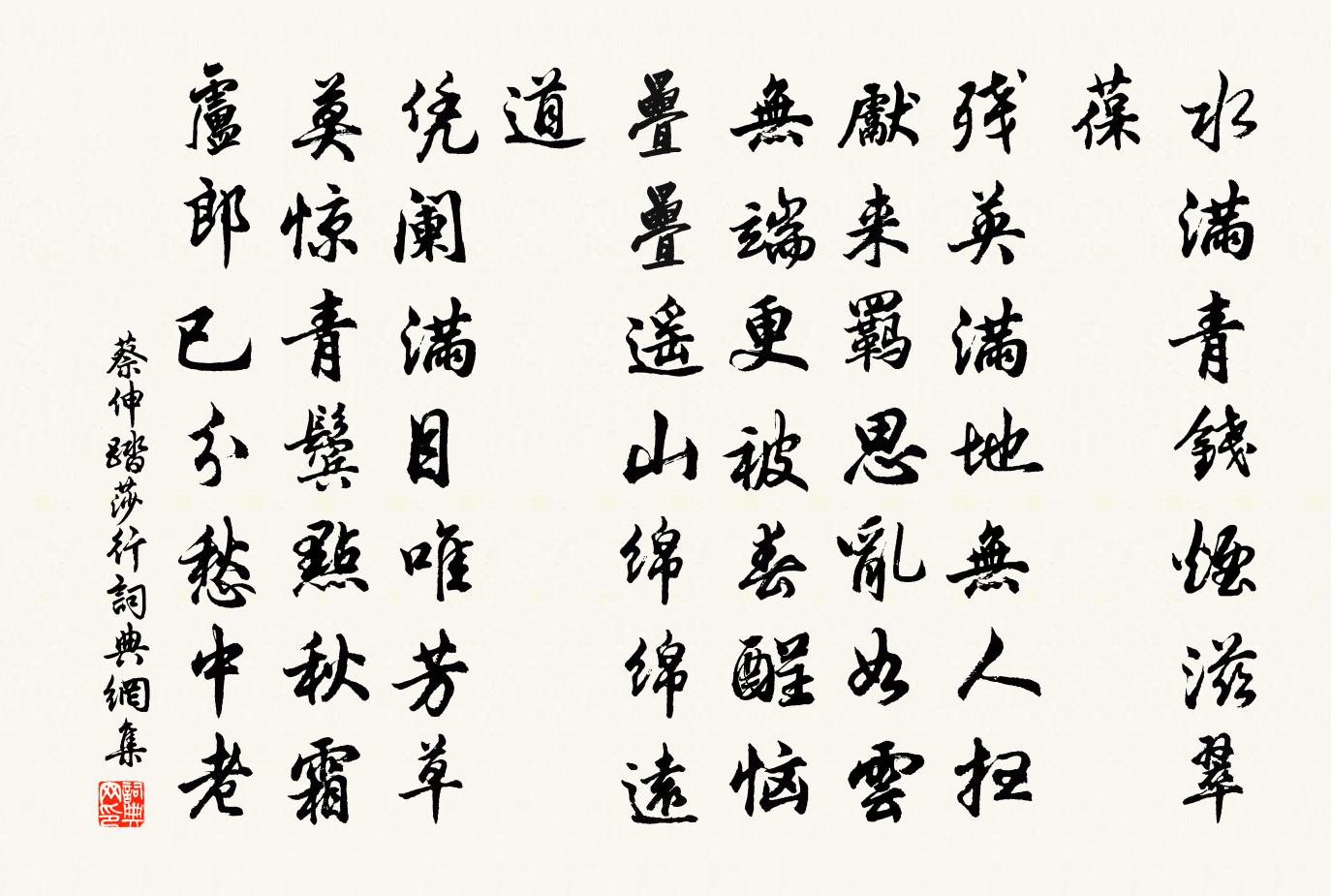 詩詞名句歷史字典書法欣賞書法字典國語詞典說文解字康熙字典古漢語字典標 題 作 者 詩 句 踏莎行作者:蔡伸 朝代:宋代踏莎行原文水滿青錢,煙滋翠葆。殘英滿地無人掃。先來羈思亂如雲,無端更被春酲惱。疊疊遙山,綿綿遠道。憑闌滿目唯芳草。莫驚青鬢點秋霜,盧郎已分愁中老。詩詞問答問:踏莎行的作者是誰?答:蔡伸問:踏莎行寫於哪個朝代?答:宋代問:踏莎行是什麼體裁?答:詞蔡伸踏莎行書法欣賞踏莎行書法作品詩詞推薦露華(次張宙雲韻)周密〔宋代〕暖消蕙雪,漸水紋漾錦,雲淡波溶。岸香弄蕊,新枝輕裊條風。次第燕歸將近,愛柳眉、桃靨煙濃。鴛徑小,芳屏思蜀陸游〔宋代〕玉食峨嵋栮,金齏丙穴魚。常思晚秋醉,未與故人疏。白髮當歸隱,青山可結廬。梅花訊息動,悵望雪消初。楊梅袁說友〔宋代〕酒著圓腮重,珠聯細葉芳。絳紗籠密顆,朱粉皺新妝。色漬桑間椹,甘傅荔子漿。輕酸認梅種,草木有他楊。棲霞會飲諸僚曾惇〔宋代〕月近中秋好,風因小雨清。山眉煙處遠,江練夜深橫。我病自不飲,君詩俱有聲。放歌能取醉,不必喚嘉榮。朗湖道中因見二事信筆二首許月卿六〔宋代〕屋下種花檐露滿,窗前疊石岫雲生。春風不解分疆界,本自無心卻有情。題吳江三高堂范蠡楊萬里〔宋代〕霸越亡吳未害仁,不妨報國並酬身。風雲長頸無遺恨,雪月扁舟更絕塵。還了君王采香徑,須饒老子苧羅人。鴟夷唐享昊天樂第十武則天〔唐代〕肅肅祀典,邕邕禮秩。三獻已周,九成斯畢。爰撤其俎,載遷其實。或升或降,惟誠惟質。句釋曉瑩〔宋代〕餘思草萋萋。苦雨吟十首呈同官諸丈吳潛〔宋代〕正直三神列,慈悲一佛尊。須知真實念,是謂吉祥門。巨浸旋歸壑,頑雲漸散屯。更憑驅日馭,揮霍照乾坤。瑞峰院董淵〔宋代〕石屏樹幄白雲端,溪路生苔樹石間。閒訪禪家問塵世,總言塵事不相干。閱韓伯修集示其子二首趙蕃〔宋代〕吏部名高世所尊,一傳曾說誤金根。陵陽父子風流勝,政似蘇家擅蜀門。道次舂陵懷古二首宋庠〔宋代〕鬱郁舂陵舊帝家,黍離千古此興嗟。蕭王何事為天子,本愛金吾與麗華。詠史詩七里灘胡曾〔唐代〕七里青灘映碧層,九天星象感嚴陵。 * 上無絲竹,不是高人誰解登?齊國夫人曹氏輓詞樓鑰〔宋代〕痛哭王孫去,南來萬晨余。解衣催艇子,扶杖擁籃輿。已矣空鸞鏡,誰歟得雁書。辛勤立門戶,地下勿欷歔。滿月山龍見蔣粹翁〔宋代〕千載聖人閩海出,喜看龍亦馬騰驤。首縣魚目星光璨,脊散虎文金線長。道統再傅天有意,素王重見世應康。惜哉題工部文侍郎周翰郭熙平遠二首二晁補之〔宋代〕洞庭木落萬波秋,說與南人亦自愁。欲指吳松何處是,一行征雁海山頭。和文與可洋川園池三十首 菡萏亭蘇軾〔宋代〕日日移床趁下風,清香不盡思何窮。若為化作龜千歲,巢向田田亂葉中。卻歸睦州至七里灘下作劉長卿〔唐代〕南歸猶謫宦,獨上子陵灘。江樹臨洲晚,沙禽對水寒。山開斜照在,石淺亂流難。惆悵梅花發,年年此地看。潘德久永嘉佳士也聞其能詩久矣而不我過仆一姜特立〔宋代〕聞名渴見面,未合長相思。紛紛數來人,誰契此心期。識公恨不早,委刺方嫌遲。正欲我輩人,共此一段奇。良賈祭常山回小獵蘇軾〔宋代〕青蓋前頭點皂旗,黃茅岡下出長圍。弄風驕馬跑空立,趁兔蒼鷹掠地飛。回望白雲生翠巘,歸來紅葉滿征衣。聖明名句推薦遙看孟津河,楊柳郁婆娑。佚名《折楊柳歌辭五首》 功名祗向馬上取,真是英雄一丈夫岑參《送李副使赴磧西官軍》 野鴉無意緒,鳴噪自紛紛。杜甫《孤雁 / 後飛雁》 君子坦蕩蕩,小人長戚戚。孔子弟子《論語·述而篇》 勾引東風,也知芳思難禁。韓疁《高陽台·除夜》 彌傷孤舟夜,遠結萬里心。權德輿《月夜江行 / 旅次江亭》 遠樹帶行客,孤城當落暉。王維《送綦毋潛落第還鄉 / 送別》 私行勝,則少公功。韓非及後人《韓非子·外儲說左下》 去年射虎南山秋,夜歸急雪滿貂裘。陸游《三月十七日夜醉中作》 有生之樂,無死之心劉向《戰國策·齊六·田單將攻狄》