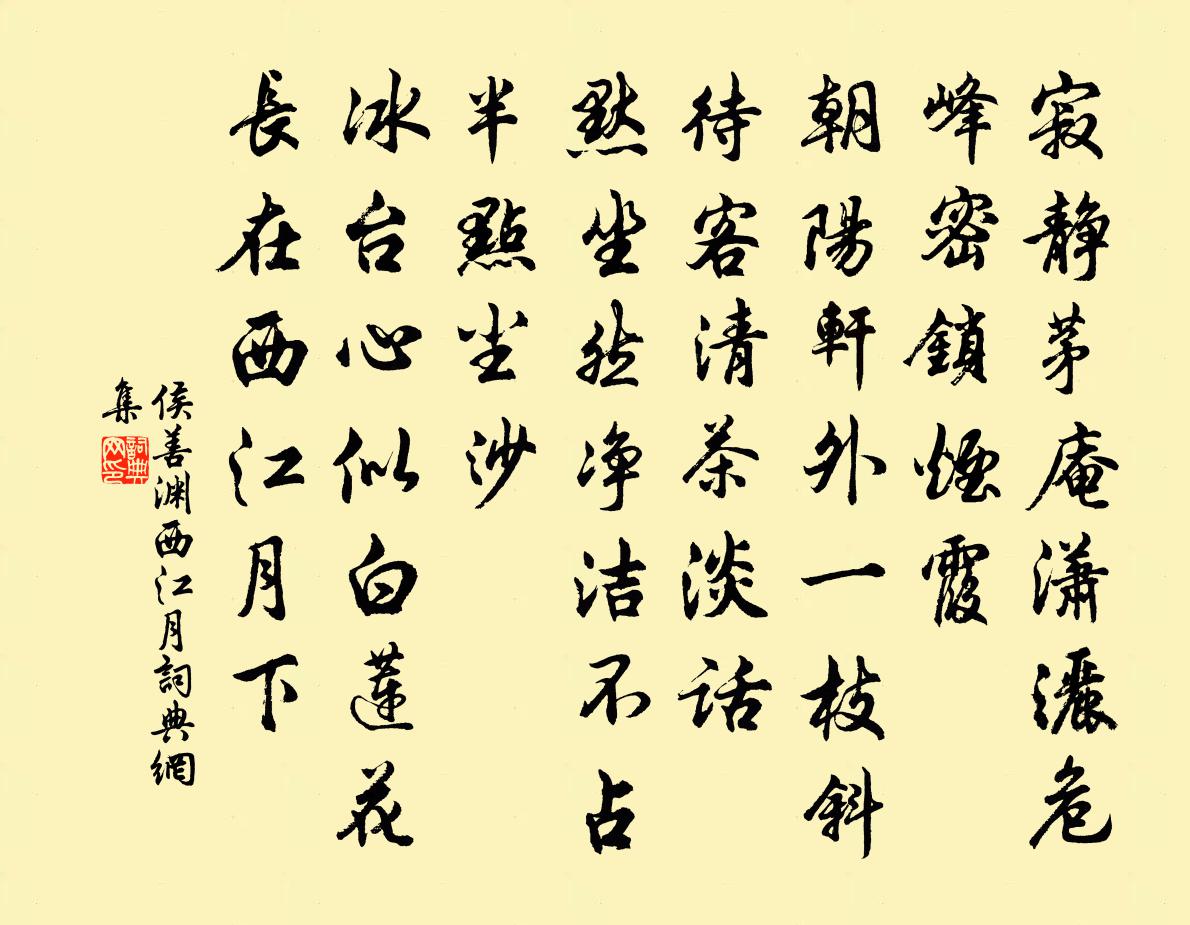 詩詞名句歷史字典書法欣賞書法字典國語詞典說文解字康熙字典古漢語字典標 題 作 者 詩 句 西江月作者:侯善淵 朝代:元代西江月原文寂靜茅庵瀟灑,危峰密鎖煙霞。朝陽軒外一枝斜。待客清茶淡話。默坐然淨潔,不占半點塵沙。冰台心似白蓮花。長在西江月下。詩詞問答問:西江月的作者是誰?答:侯善淵問:西江月寫於哪個朝代?答:元代問:西江月是什麼體裁?答:詞侯善淵西江月書法欣賞西江月書法作品詩詞推薦木樨花一首蘇籀〔宋代〕何處聞國薌,珍木秀岩谷。高標蕙蘭枝,妙輯沈麝酷。葉葉秋聲中,霏霏早英蓛。介特有如松,繁華豈慚菊。勃蔚哭劉德仁杜荀鶴〔唐代〕賈島還如此,生前不見春。豈能詩苦者,便是命羈人。家事因吟失,時情礙國親。多應銜恨骨,千古不為塵。題時遁澤畫卷十首王柏〔宋代〕浩浩雲橫塢,霏霏雨不收。野橋人少度,寂寞臥清秋。宋玉李覯〔宋代〕世間佳麗每專房,一顧多應萬事荒。夢裡若無真寶處,不妨頻為賦高唐。南歌子楊無咎〔宋代〕彩縷牽腸斷,明珠暗滴圓。從頭顆顆手親穿。寄與仙鄉同結、此生緣。和串攏瑜臂,連雲墜雪肩。循環密數對沈煙登山有作張栻〔宋代〕上頭壁立起千尋,下列群峰次第深。兀兀籃輿自吟詠,白雲流水此時心。偈頌一百五十首釋心月〔宋代〕曉坡北山雲,暮宿北山雨。來為北山人,須辦北山主。呈竹元珍孔武仲〔宋代〕一室蕭然傍禁城,塵埃不到旅懷清。水流紅片知花落,雨浥蒼苔見筍生。感物已憐春寂寞,辭家憶是歲崢嶸。知君溪上遇雨二首崔道融〔唐代〕回塘雨腳如繅絲,野禽不起沈魚飛。耕蓑釣笠取未暇,秋田有望從淋漓。坐看黑雲銜猛雨,噴灑前山此獨晴。忽驚南鄉子蘇軾〔宋代〕何處倚闌乾。弦管高樓月正圓。胡蝶夢中家萬里,依然。老去愁來強自寬。明鏡借紅顏。須著人間比夢間。蠟燭半和顏長官百詠空門朱繼芳〔宋代〕四祖門庭寂寞秋,牛頭只是舊牛頭。如何一旦風光別,花落花開百鳥愁。清平樂(詠橄欖燈球兒)侯置〔宋代〕縷金剪彩。茸綰同心帶。整整雲鬟宜簇戴。雪柳鬧蛾難賽。休夸結實炎州。且看指面纖柔。試問苦人滋味,何如插唐享昊天樂第十武則天〔唐代〕肅肅祀典,邕邕禮秩。三獻已周,九成斯畢。爰撤其俎,載遷其實。或升或降,惟誠惟質。端午內中帖子詞夫人閣王珪〔唐代〕後苑尋青趁午前,歸來競鬥玉蘭邊。袖中獨有香芸草,留與君王辟蠹編。送慵庵不及用韻奉寄方回〔宋代〕東城追跡過西關,橋上紛紛送客還。攜酒踟躕才水次,鳴珂躞蹀已雲間。摘茶貿食民尢窶,掘蕨燒畲土不閒。細為翠微寺陳炳〔宋代〕 * 休作獅子吼,門外泉聲正拍空。三十六峰渾不見,翠微真在有無中。鄭尚書新開涪江二首賈島〔唐代〕岸鑿青山破,江開白浪寒。日沉源出海,春至草生灘。梓匠防波溢,蓬仙畏水乾。從今疏決後,任雨滯峰巒。不侵送任三舅赴調項安世〔宋代〕火雲燒浪峽中歸,朔雪橫江又語離。一世由來迎送里,多才好去盛明時。人知與我為兄弟,或欲從君間鬢髭。為說曉發杉木陳與義〔宋代〕古澤春光淡,高林露氣清。紛紛世上事,寂寂水邊行。客子凋雙鬢,田家自一生。有詩還忘記,無酒卻思傾。酬劉谷除夜見寄李郢〔唐代〕坐恐三更至,流年此夜分。客心無限事,愁雨不堪聞。灞上家殊遠,爐前酒暫醺。劉郎亦多恨,詩憶故山雲。名句推薦少年心事當拿雲,誰念幽寒坐嗚呃。李賀《致酒行》 歲夜高堂列明燭,美酒一杯聲一曲。李頎《聽安萬善吹觱篥歌》 南山與秋色,氣勢兩相高。杜牧《長安秋望》 君仁莫不仁,君義莫不義,君正莫不正。孟子《孟子·離婁章句上·第二十節》 誰言寸草心,報得三春暉。孟郊《遊子吟 / 迎母漂上作》 馬驕泥軟錦連乾,香袖半籠鞭。薛昭蘊《喜遷鶯·清明節》 勝概日相與,思君心鬱陶。岑參《鞏北秋興寄崔明允》 奸有益,人皆可為奸;忠致禍,人難為忠。來俊臣《羅織經·察奸卷第八》 驛寄梅花,魚傳尺素。秦觀《踏莎行·郴州旅舍》 閒中件件思,暗裡般般量。康海《雁兒落帶得勝令·飲中閒詠》