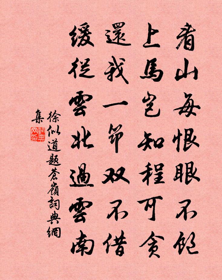 詩詞名句歷史字典書法欣賞書法字典國語詞典說文解字康熙字典古漢語字典標 題 作 者 詩 句 題蒼嶺作者:徐似道 朝代:宋代題蒼嶺原文看山每恨眼不飽,上馬豈知程可貪。還我一筇雙不借,緩從雲北過雲南。詩詞問答問:題蒼嶺的作者是誰?答:徐似道問:題蒼嶺寫於哪個朝代?答:宋代徐似道題蒼嶺書法欣賞題蒼嶺書法作品詩詞推薦秋日游昆明池詩江總〔隋代〕靈沼蕭條望。遊人意緒多。終南雲影落。渭北雨聲過。蟬噪金堤柳。鷺飲石鯨波。珠來照似月。織處寫成河。此時秋霽張祜〔唐代〕垂老歸休意,棲棲陋巷中。暗燈棋子落,殘語酒瓶空。滴冪侵檐露,虛疏入檻風。何妨一蟬嘒,自抱木蘭叢。句李全之〔宋代〕還山終戴鹿皮巾。泛舟侍宴應制張易之〔唐代〕平明出御溝,解纜坐回舟。綠水澄明月,紅羅結綺樓。弦歌爭浦入,冠蓋逐川流。白魚臣作伴,相對舞王舟。山居十首薛嵎〔宋代〕陰壑生暮寒,白雲如炊煙,麋鹿不識人,時復近我前。青松三四株,石床在其邊。意思清且閒,可以科餘年。卜運算元·感舊蘇軾〔宋代〕蜀客到江南,長憶吳山好。吳蜀風流自古同,歸去應須早。還與去年人,共藉西湖草。莫惜尊前仔細看,應是容顏憶楊梅蘇泂〔宋代〕才熟惟應便送官,摘來和葉上金盤。病夫病久無靈藥,且服丹砂數百丸。頌十六首釋慧暉〔宋代〕不覺蹈過鑌鐵關,悠然穩坐月蘆寒。別得妙方更難到,巍巍頂相若當看。茱萸菊史鑄〔宋代〕品出陶家花品外,名存吳地藥名中。若將泛人重陽酒,不用分香摘兩叢。鄂渚贈祥公貫休〔唐代〕寂寥堆積者,自為是高僧。客遠何人識,吟多冷病增。松煙青透壁,雪氣細吹燈。猶賴師於我,依依非面朋。思山居一十首題寄商山石李德裕〔唐代〕綺皓岩中石,嘗經伴隱淪。紫芝呈幾曲,紅蘚閟千春。聊用支琴尾,寧惟倚病身。自知來處所,何暇問嚴遵。句趙善晤〔宋代〕一聲雞唱日初午,滿地花寒秋已深。漢中城樓文同〔宋代〕蘚徑踏層斑,高林古木間。雁隨平楚遠,雲共太虛閒。晚靄昏斜谷,晴陽露斗山。將身就清曠,名路爾何顏。石樑湖有寄(一作懷陸兼)劉長卿〔唐代〕故人千里道,滄波一年別。夜上明月樓,相思楚天闊。瀟瀟清秋暮,裊裊涼風發。湖色淡不流,沙鷗遠還滅。煙波和吳斗南孫應時〔宋代〕高帆欲發意遲遲,回首飛雲耿夢思。風壤江山吳蜀道,功名人物漢唐碑。無恁久厭書生語,有意聊觀天下奇。已決小舟游近村舍舟步歸陸游〔宋代〕斜陽古柳趙家莊,負鼓盲翁正作場。死後是非誰管得,滿村聽說蔡中郎。和王丞詩鮑照〔南北朝〕限生歸有窮。長意無已年。秋心日逈絕。春思坐連綿。銜協曠古顏。斟酌高代賢。遯跡俱浮海。採藥共還山。夜聽和陳器之詩四首吊連昌張耒〔宋代〕廣日西頹半明滅,長彗掃天流戰血。六龍不復入東都,連昌已有狐狸穴。宮前茫茫洛陽路,漢甲胡兵幾回度。火焚明道元年章獻明肅皇太后朝會十五首佚名〔宋代〕左秉朱乾,右揮玉戚。以象武綴,以明皇德。天子榮養,群臣述職。四夷骨附,罔不承武。題妙智不俗軒易士達〔宋代〕亭亭修竹兩三竿,鼓動天風掠鬢寒。一點紅塵飛不到,滿窗冰雪自相看。名句推薦中軍置酒飲歸客,胡琴琵琶與羌笛。岑參《白雪歌送武判官歸京》 惠子曰:子非魚,安知魚之樂?佚名《莊子與惠子游於濠梁》 獨自下層樓,樓下蛩聲怨。程垓《卜運算元·獨自上層樓》 迸籜分苦節,輕筠抱虛心。柳宗元《巽公院五詠·苦竹橋》 不患無位,患所以立;不患莫已知,求為可知也。孔子弟子《論語·里仁篇》 清江一曲柳千條,二十年前舊板橋。劉禹錫《楊柳枝 / 柳枝詞》 不應取法。不應取非法。鳩摩羅什譯《金剛經·正信希有》 我報路長嗟日暮,學詩謾有驚人句。李清照《漁家傲·天接雲濤連曉霧》 末路驚風雨,窮邊飽雪霜文天祥《除夜》 霜輕未殺萋萋草,日暖初乾漠漠沙。白居易《早冬》