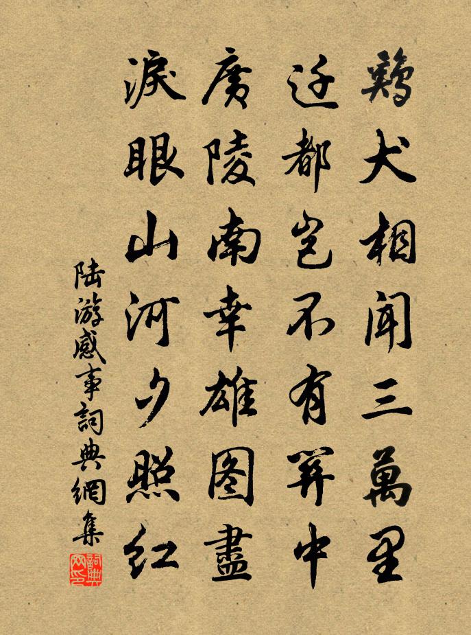 詩詞名句歷史字典書法欣賞書法字典國語詞典說文解字康熙字典古漢語字典標 題 作 者 詩 句 感事作者:陸游 朝代:宋代感事原文雞犬相聞三萬里,遷都豈不有關中?廣陵南幸雄圖盡,淚眼山河夕照紅。詩詞問答問:感事的作者是誰?答:陸游問:感事寫於哪個朝代?答:宋代問:陸游的名句有哪些?答:陸游名句大全陸游感事書法欣賞感事書法作品詩詞推薦卜運算元譚處端〔元代〕四大因緣做。苦海憑船渡。一棹清風到岸頭,得上無生路。人嘆風貧苦。我步閒閒趣。脫體全空沒一文,勝似石崇歸故園二首姜特立〔宋代〕一去丹墀六換春,已將柴柵等簪紳。雖無名節高當世,也是羊裘一故人。冬夜有懷柯田山人四首張元乾〔宋代〕聞說新居好,山樊卜築深。藥囊能濟物,龜策少知音。四海憂黔首,中原盡綠林。直須期雲屋,夜棹去相尋。寓興陸游〔宋代〕窮巷無來客,秋風獨浩歌。壯年閒處老,佳日病中過。其欲攜長鑱,仍思擁短蓑。逢山皆可隱,不必上三峨。秋懷李覯〔宋代〕褚冠斜頂對清秋,病骨支撐懶上樓。輔世功夫何日是,少年滋味此生休。山含紅樹隨時老,天帶黃昏一例愁。自笑猿文同〔宋代〕岷嶺高無敵,來從第幾層。攀緣殊不倦,趫捷爾誠能。晚嘯思危石,晴懸憶古藤。王孫非汝類,只可以文憎。玉樓春 次韻,答趙簽事學子溫來詞末句雲,劉敏中〔元代〕清官廚饌無兼味。飢待公庭人吏退。野人尊俎有餘歡,明月可批風可膾。野人衰殘清官貴。生死論交吾未愧。天開題四蘭釋紹曇〔宋代〕一再荒林雪,全身掩薜蘿。直饒埋沒得,爭柰鼻頭何。大雨水憂三堰決壞且念吾挺之在病無與共此憂李石〔宋代〕淫雨不止已及月,扊扅供釁無宿煙。池蛙齊聲振鼓吹,苔蘚一色堆金錢。方玄英故居林景熙〔宋代〕艤舟鸕鶿港,白雲滿高原。借問玄英居,遺構無復存。精靈幾百載,山鬼憑幽昏。獨遺文字香,隱隱草樹根。轉盼感物二首唐彥謙〔唐代〕騄驥初失群,亦自矜趫騰。俯仰歲時久,帖然困蚊蠅。豪鯨逸其穴,尺水成滄溟。豈無魚鱉交,望望為所憎。物理送韓太祝知錢塘司馬光〔宋代〕冠佩郁相映,由來積德家。一時推俊異,四海走聲華。圖籍添舟重,江山忘路賒。夷塗指霄漢,跼驥不須嗟。淇寡婦楊維楨〔元代〕淇上有寡婦,始慕宋共姬。食貧以自守,笑誚懷猜疑。忽為盜所污,放僻靡不為。昔為淇婦宗,今為淇婦嗤。可憐題臥屏十八花海棠葛立方〔宋代〕濯錦江邊雨露勻,杜鵑啼血染香繒。自緣佳處詩難貌。可是無花開杜陵。端午內中帖子詞皇后閣王珪〔唐代〕君王初幸集靈台,碧藕催花海上開。見說一房皆百子,鳳銜雙蒂幾時來。連雨獨飲偶書四首趙蕃〔宋代〕人無送酒錢,官無種秫田。鄰家賴可賒,醉過春風顛。春風急雨顛,梅黃更連連。不念陋巷士,其貧類顏淵。再賦梅花陸游〔宋代〕老來愛酒剩狂顛,況復梅花到眼邊。不怕幽香妨靜觀,正須疏影伴臞仙。松筠共嘆冰霜晚,桃李從教雨露偏。此去小出塞曲陸游〔宋代〕全師出雁塞,百戰運龍韜。金絡洮州馬,珠裝夏國刀。度沙風破肉,攻壘雪平壕。明日受降處,甲齊熊耳高。挽章冠叟洪咨夔〔宋代〕卷卻青雲靶,書來意轉平。於斯觀所養,知不失其亨。梧竹自師友,梅礬皆弟兄。悲風吹夢遠,不朽是鄉評。念奴嬌(戲和仲殊已未四月二十七日)吳潛〔宋代〕午飆褪暑,向綠陰深處,引杯孤酌。啼鳥一聲庭院悄,日影偷移朱箔。杏落金丸,荷抽碧筒,景物挨排卻。虛檐長名句推薦私視使目盲,私聽使耳聾,私慮使心狂。呂不韋《呂氏春秋·紀·季冬紀》 風起,雪飛炎海變清涼。蘇軾《定風波·南海歸贈王定國侍人寓娘》 來歲長安春事早,勸杏花、斷莫相思死。龔自珍《金縷曲·癸酉秋出都述懷有賦》 殘霞夕照西湖好,花塢苹汀,十頃波平,野岸無人舟自橫。歐陽修《採桑子·殘霞夕照西湖好》 城門失火,殃及池魚。司馬光《資治通鑑·梁紀·梁紀十六》 寒梅最堪恨,常作去年花。李商隱《憶梅》 笑綠鬟鄰女,倚窗猶唱,夕陽西下。蔣捷《女冠子·元夕》 圖難於其易,為大於其細老子《老子·德經·第六十三章》 晝成淒黯,雁飛過、垂楊轉青。吳文英《慶 * ·秋感》 山中夜來月,到曉不曾看。元好問《倪莊中秋》