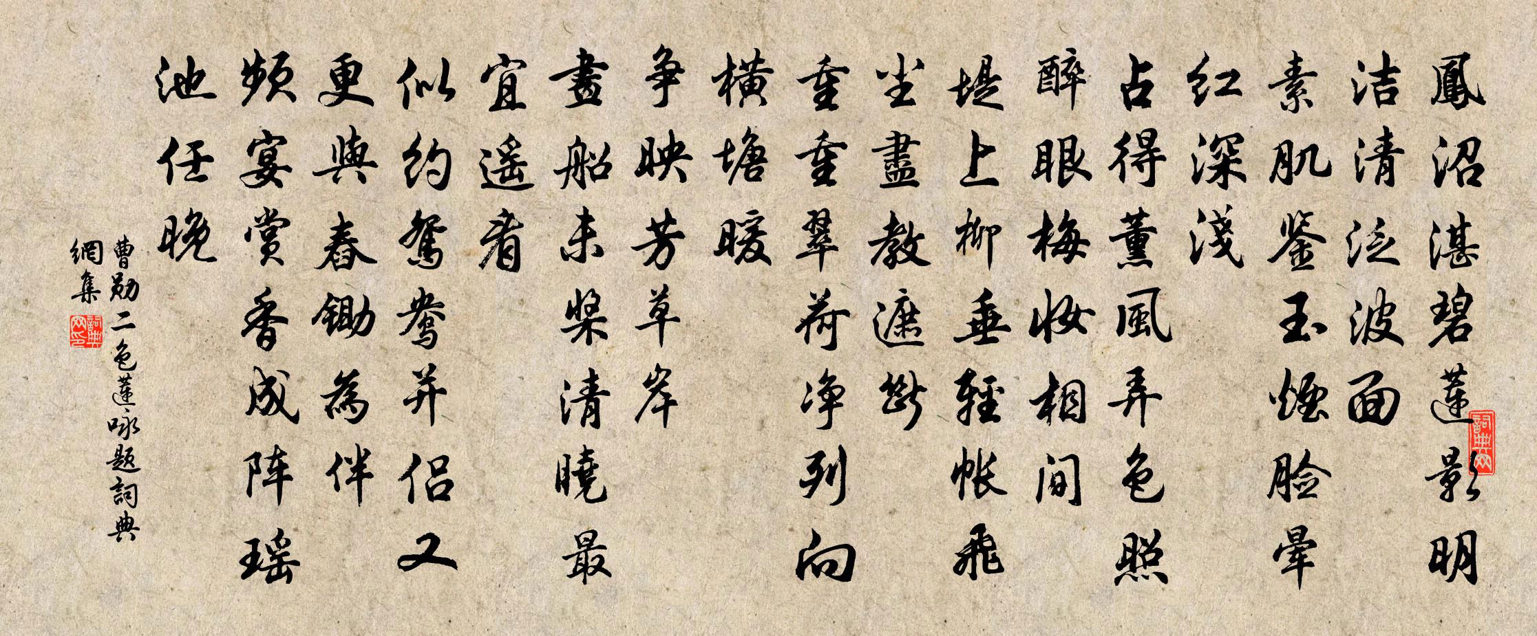 詩詞名句歷史字典書法欣賞書法字典國語詞典說文解字康熙字典古漢語字典標 題 作 者 詩 句 二色蓮(詠題)作者:曹勛 朝代:宋代二色蓮(詠題)原文鳳沼湛碧,蓮影明潔,清泛波面。素肌鑒玉,煙臉暈紅深淺。占得薰風弄色,照醉眼、梅妝相間。堤上柳垂輕帳,飛塵盡教遮斷。重重翠荷淨,列向橫塘暖。爭映芳草岸。畫船未槳,清曉最宜遙看。似約鴛鴦並侶,又更與、舂鋤為伴。頻宴賞,香成陣、瑤池任晚。詩詞問答問:二色蓮(詠題)的作者是誰?答:曹勛問:二色蓮(詠題)寫於哪個朝代?答:宋代問:二色蓮(詠題)是什麼體裁?答:詞曹勛二色蓮(詠題)書法欣賞二色蓮(詠題)書法作品詩詞推薦秦和十月二十四日初見雪呈相國元老邵雍〔宋代〕壬子初逢雪,未多仍卻晴。人間都變白,林下不勝清。寒士痛遭恐,窮民惡看驚。杯觴限新法,何故便能傾。白雲謠佚名〔先秦〕白雲在天。山(添氵換阝二換山)自出。道里悠遠。山川間之。將子無死。尚能復來。酬和杜侍御許渾〔唐代〕花時曾省杜陵游,聞下書帷不舉頭。因過石城先訪戴,欲朝金闕暫依劉。征帆夜轉鸕鶿穴,騁騎春辭鸛雀樓。正把答宋履中見贈孔武仲〔宋代〕粉袍如雪會群英,往歲曾當月旦評。夢想十年嗟舊事,翱翔三舍羨新榮。相如素擅為文麗,班固終期作史成。潦倒哭所知李鹹用〔唐代〕朝作青雲士,暮為玄夜人。風燈無定度,露薤亦逡巡。乘馬驚新冢,書帷擺舊塵。只應從此去,何處福生民?和題藤架獨孤及〔唐代〕尊尊葉成幄,璀璀花落架。花前離心苦,愁至無日夜。人去藤花千里強,藤花無主為誰芳。相思歷亂何由盡,春日景定初元即事十首劉克莊〔宋代〕臣繇賀捷表,臣結中興碑。亘古雄辭在,於今老學誰。送趙德老觀文東歸樓鑰〔宋代〕往還不過酒三行,成敗同觀棋一枰。東海敢言成二老,西湖自足度餘生。朅來便覺廢茲事,歸去定須尋舊盟。錦里夜長王禹偁〔宋代〕後樓前合互嚴更,年鬢侵人睡漸輕。病眼已甘書冊廢,愁腸猶取酒杯傾。風搖紙帳燈花碎,月照銅壺漏水清。吟盡句孫子進〔宋代〕酒祿嗟予薄。留題東屯詩四首李壁〔宋代〕連峰疊嶂擁崢嶸,個裡誰知掌樣平。還有人家留客醉,石榴花下聽啼鶯。和姚榷院送茉莉韻姚勉〔宋代〕清甚冰葩淡不妝,能從盛暑到秋涼。瓊樓合著移春檻,卻向山齋供淨香。東都送鄭處誨校書歸上都杜牧〔唐代〕悠悠渠水清,雨霽洛陽城。槿墮初開艷,蟬聞第一聲。故人容易去,白髮等閒生。此別無多語,期君晦盛名。懷張似之仇遠〔宋代〕少日登山屐,中年上水船。黃花猶自綠,白髮若為玄。但覺杯行速,那知帽影偏。南峰深秀處,回首重潸然。偈頌三十六首釋如珙〔宋代〕三世如來說妙義,炎炎火燄雪火飛。面前總是聽法底,識取當頭底是誰。扇子詩李石〔宋代〕飣餖蛛絲織網羅,坐看牛女夜斜河。只今頗怪人間巧,見說天孫巧更多。句陶弼〔宋代〕避秦荒徑在,招屈古祠空。桂枝香(四明中秋)趙以夫〔宋代〕青霄望極。際萬里月明,無點雲色。一片冰壺世界,水鄉先得。年年客里驚秋半,倚西風、鬢華吹白。覓閒無路,偈頌一百零二首釋慧遠〔宋代〕山僧有個不是,喪盡衲僧巴鼻。驚回陝府鐵牛,吞吐山河大地。訪故人釋斯植〔宋代〕石榻相期久,閒尋到野房。春歸芳草暗,雲入楚山長。人影分孤驛,雞聲落曙桑。淒涼千古事,回首兩茫茫。名句推薦敏捷詩千首,飄零酒一杯。杜甫《不見》 仗酒祓清愁,花銷英氣姜夔《翠樓吟·淳熙丙午冬》 燕子重來,往事東流去。吳文英《點絳唇·時霎清明》 晚年唯好靜,萬事不關心。王維《酬張少府》 聞道梅花坼曉風,雪堆遍滿四山中。陸游《梅花絕句》 無材可去補蒼天,枉入紅塵若許年。曹雪芹《紅樓夢·第一回》 如貧得寶,如暗得燈,如飢得食,如旱得雲。馮夢龍《警世通言·卷九》 綠樹村邊合,青山郭外斜。孟浩然《過故人莊》 長安一片月,萬戶搗衣聲。李白《子夜吳歌·秋歌》 嶺水爭分路轉迷,桄榔椰葉暗蠻溪。李德裕《謫嶺南道中作》