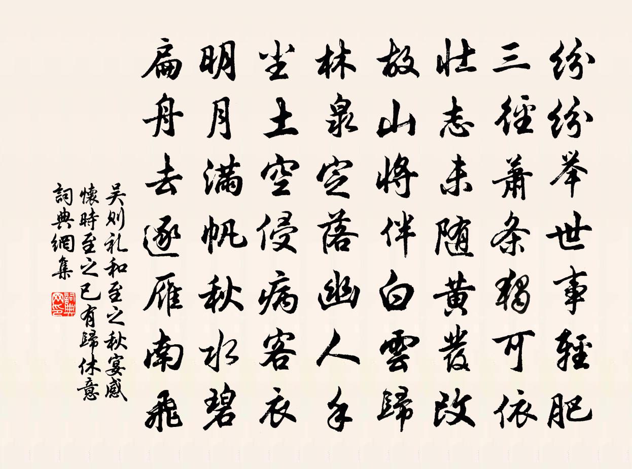 詩詞名句歷史字典書法欣賞書法字典國語詞典說文解字康熙字典古漢語字典標 題 作 者 詩 句 和至之秋宴感懷時至之已有歸休意作者:吳則禮 朝代:宋代原文紛紛舉世事輕肥,三徑蕭條獨可依。壯志未隨黃髮改,故山將伴白雲歸。林泉定落幽人手,塵土空侵病客衣。明月滿帆秋水碧,扁舟去逐雁南飛。詩詞問答問:《和至之秋宴感懷時至之已有歸休意》的作者是誰?答:吳則禮問:該詩寫於哪個朝代?答:宋代書法欣賞和至之秋宴感懷時至之已有歸休意書法作品詩詞推薦宴湖南洪漕樂語口號李曾伯〔宋代〕仗節來從玉筍班,福星甫照舉歡顏。持荷自盍登堯陛,挽粟寧容久漢關。慶集正當萸菊際,交盟喜在芷蘭間。定王酬於訢校書見貽朱慶餘〔唐代〕能□得從軍,清嬴□□□。綺羅徒滿目,山水不離心。暫別愁花老,相思倚竹陰。家貧無以養,未可話抽簪。滁上謫居王禹偁〔宋代〕一日復一日,悠悠任此生。所悲頻謫宦,不是厭專城。有悔皆因祿,無凶未若耕。林泉何處好,終卜掛吾纓。送紫陽王山長俊甫如武林五首方回〔宋代〕儒風掃地久堪哀,誰與前朝養禍胎。真魏無牛喬鄭壽,杜游不作董丁來。遊魂葛嶺人方醉,轉盼陳橋業遽灰。賴是資州鄧園李新〔宋代〕蒼官愯愯護重崗,綠玉寒梢亞短牆。春事鳥啼三月老,路人風送百花香。蜂衙歸去欄乾靜,江面飛來燕子忙。簿領庖人舟殿後餒甚以蔥虀佐飯袁說友〔宋代〕黃州狹港半江空,白飯青蔥酒一鍾。莫厭路貧愁欲絕,稍還瓮牖舊家風。江上四首王令〔宋代〕山頭斫竹下作竿,系鉤沉水坐岸觀。餌微水濁魚不乾。棲遲終日或有得,歸去猶可妻子歡。贈李李堂石介〔宋代〕顓頊宅帝丘,放勛葬成陽。有虞漁雷澤,三帝聲汪洋。聖人遺風烈,生民多材良。吾宋八十年,賢傑近相望。黃州六言雜興陸游〔宋代〕一夜雨來可怖,五更雲散無餘。傳舍僧窗雖異,不妨隨處觀書。次韻胡撫乾雪詩每句寓再字仍用汝陰詩禁項安世〔宋代〕積疑茶井實,高恐劍峰平。星暗楚雙路,津迷洛兩生。隨風來不斷,洊水凍無聲。已覺一為甚,更堪三後行。力減琵琶仙姜夔〔宋代〕《吳都賦》云:「戶藏煙浦,家具畫船」,唯吳興為然,春遊之盛,西湖未能過也。己酉歲,予與蕭時父載酒南郭得侄訊息二首陳造〔宋代〕甚喜的谷熟,仍聞佳食眠。郡人新過此,鄉主得真傳。社酒浮蛆淥,湖魚割玉鮮。平時計安穩,莫靳里胥錢。己丑元宵連文鳳〔宋代〕不因燈火有元宵,強把時光慰寂寥。十四年來無此興,三更踏月過河橋。王谷節推畫草蟲花竹求詩李復〔宋代〕細羽爭飛翠蔓長,窗間留影點綃光。寧知臂朽專蜩翼,但見心精妙楮芒。詩學蟲魚增舊譜,藥圖草木驗仙方。請君墨鄧熛〔宋代〕一寸龍香一寸金,仙家傳藥不傳心。香來莫作尋常看,千載文光翰苑林。採蓮女黃庚〔宋代〕越女蘭舟 * 漪,採蓮花露濕紅衣。萬荷影裹歌聲過,驚起鴛鴦貼水飛。吾家舊藏奇石甚富今無復存者獨道石一尚置幾陸游〔宋代〕誤因祿米棄蓴鱸,一落塵埃底事無。布襪青鞋雖與盡,此峰聊當臥遊圖。途中早發劉禹錫〔唐代〕馬踏塵上霜,月明江頭路。行人朝氣銳,宿鳥相辭去。流水隔遠村,縵山多紅樹。悠悠關塞內,往來無閒步。郴江百詠並序會勝寺阮閱〔宋代〕靈壽山前古梵宮,粥魚齋鼓白雲中。衲僧若會蒙泉意,竟與曹溪一徑通。和程泰之閣學詠雪十二題弄雪袁說友〔宋代〕天與騷人景物宜,風流嘲戲恰相知。長安道上吟詩罷,笑里騎驢緩勒羇。名句推薦戚姬髡髮入舂市,萬古共悲辛。李白《中山孺子妾歌》 吏不治則亂,農事緩則貧。墨子《墨子·39章 非儒(下)》 青春須早為,豈能長少年。孟郊《勸學》 人不見,春在綠蕪中。祖可《小重山·誰向江頭遺恨濃》 遲日江山麗,春風花草香。杜甫《絕句二首》 別路琴聲斷,秋山猿鳥吟。盧照鄰《送梓州高參軍還京》 耐寒唯有東籬菊,金粟初開曉更清。白居易《詠菊》 日月忽其不淹兮,春與秋其代序。屈原《離騷》 荒煙涼雨助人悲,淚染衣襟不自知。王安石《送和甫至龍安微雨》 夫嚴家無悍虜,而慈母有敗子。韓非及後人《韓非子·顯學》