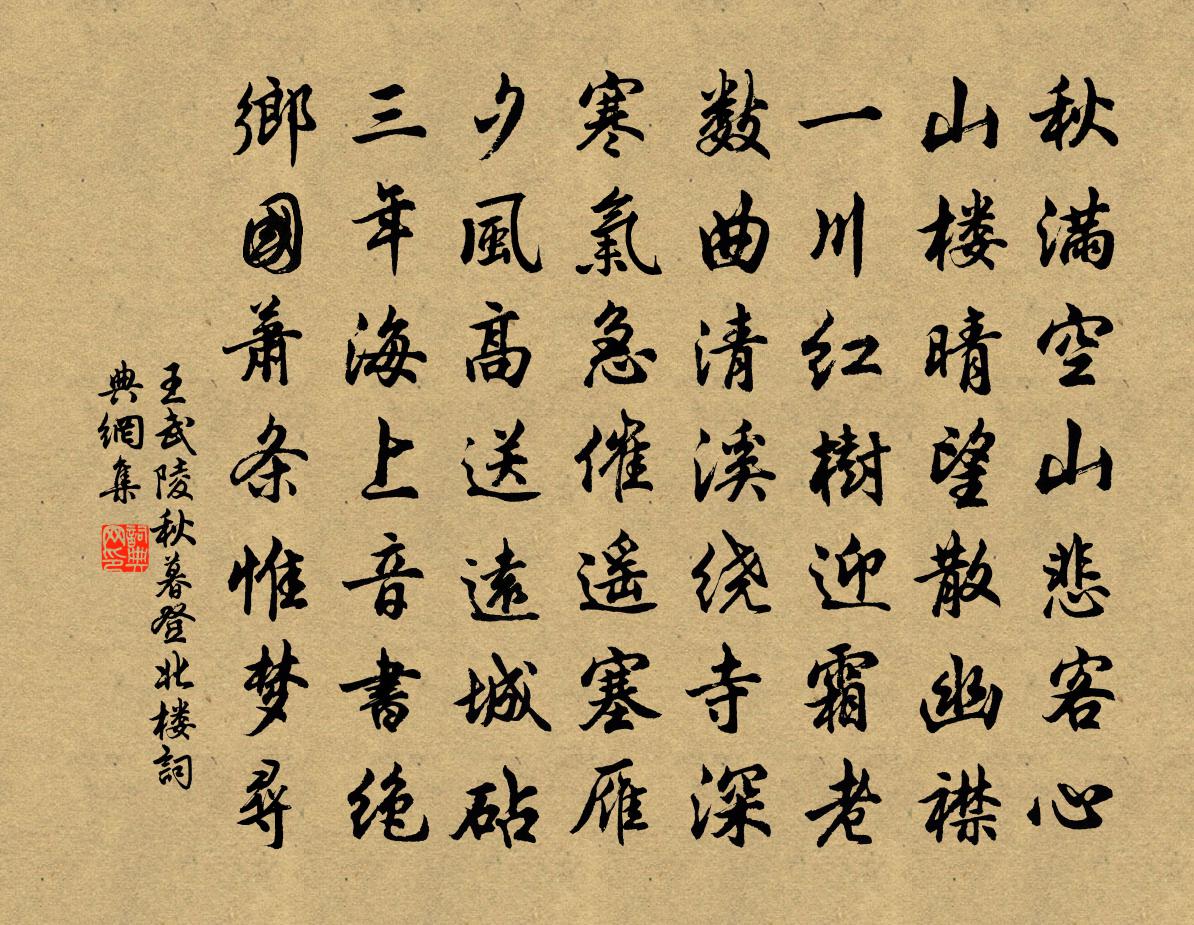 詩詞名句歷史字典書法欣賞書法字典國語詞典說文解字康熙字典古漢語字典標 題 作 者 詩 句 秋暮登北樓作者:王武陵 朝代:唐代秋暮登北樓原文秋滿空山悲客心,山樓晴望散幽襟。一川紅樹迎霜老,數曲清溪繞寺深。寒氣急催遙塞雁,夕風高送遠城砧。三年海上音書絕,鄉國蕭條惟夢尋。詩詞問答問:秋暮登北樓的作者是誰?答:王武陵問:秋暮登北樓寫於哪個朝代?答:唐代問:秋暮登北樓是什麼體裁?答:七律王武陵秋暮登北樓書法欣賞秋暮登北樓書法作品注釋全唐詩:卷275_22詩詞推薦府西亭納涼歸白居易〔唐代〕避暑府西亭,晚歸有閒思。夏淺蟬未多,綠槐陰滿地。頻寬衫解領,馬穩人攏轡。面上有涼風,眼前無俗事。路經蝶戀花 雨中客至王結〔元代〕久客幽燕懷故里。野鶴孤雲,笑我京塵底。鄭重佳賓勞玉趾。清談娓娓消愁思。細雨斜風聊爾耳。病怯輕寒,莫卷紹興祀皇地祗十五首佚名〔宋代〕毖祀泰折,柔祗是承。於赫藝祖,道格三靈。式嚴配侑,厚德惟寧。爰昭牙幣,享於克誠。為通州守賦綠漪亭二首姜特立〔宋代〕亭占佳名淮海東,六丁擁上水仙宮。檐牙簾額煙霏里,人語歌聲荷氣中。酒盞吸殘千斛月,釣竿擲下一絲風。使君感故府二首李建勛〔唐代〕戚戚復戚戚,期懷安可釋。百年金石心,中路生死隔。新墳應草合,舊地空苔色。白日燈熒熒,凝塵滿幾席。悒悒慶宮春(謝草窗惠詞卷)王易簡〔宋代〕庭草春遲,汀苹香老,數聲佩悄蒼玉。年晚江空,天寒日暮,壯懷聊寄幽獨。倦遊多感,更西北、高樓送目。佳人題休休亭(一作耐辱居士歌)司空圖〔唐代〕咄,諾,休休休,莫莫莫,伎兩雖多性靈惡,賴是長教閒處著。休休休,莫莫莫,一局棋,一爐藥,天意時情可料奉和幸韋嗣立山莊應制崔湜〔唐代〕竹徑桃源本出塵,松軒茅棟別驚新。御蹕何須林下駐,山公不是俗中人。撫松堂李處權〔宋代〕丈人居水南,未省價高索。平生丘壑事,長嘯天宇窄。舍榜五株柳,宛是陶家宅。舍南數畝園,似與人境隔。方須雷陽書事秦觀〔宋代〕駱越風俗殊,有疾皆勿藥。束帶趨祀房,用史巫紛若。弦歌薦繭栗,奴士洽觴酌。呻吟殊未央,更把雞骨灼。東湖李覯〔宋代〕古郡城池已瞰江,重湖更在郡東方。水仙坐下魚鱗赤,龍女門前橘樹香。路絕塵埃非灑掃,地無風雨亦清涼。使君轉調二郎神(再和)劉克莊〔宋代〕黃粱夢覺,忽跳出、北扉西省。今似得何人,老僧退院,秀才下省。罷草河西淮南詔,沒一字、諮尚書省。已交侶繡鸞鳳花犯·賦水仙周密〔宋代〕楚江湄,湘娥乍見,無言灑清淚。淡然春意。空獨倚東風,芳思誰寄。凌波路冷秋無際。香雲隨步起。謾記得,漢偶題張九成〔宋代〕道立神自昌,心閒氣常正。平生飽此味,不與時俗競。得失了不關,榮辱任無定。君看富貴人,表里互馳騁。雍容採桑子晏幾道〔宋代〕蘆鞭墜遍楊花陌,晚見珍珍。疑是朝雲,來作高唐夢裡人。應憐醉落樓中帽,長帶歌塵。試拂香茵,留解金鞍睡過秋思陸游〔宋代〕水際柴門一扇開,白頭羸病亦堪哀。阿誰得似桄榔杖,肯為閒人萬里來?偈頌一百六十首釋宗杲〔宋代〕不用安排,切莫造作。造作安排,無繩自縛。不安排,不造作,善財彈指登樓閣。秘魔放下手中叉,普化入市搖鈴忽見檳榔詩庾信〔南北朝〕綠房千子熟。紫穗百花開。莫言行萬里。曾經相識來。回雁峰晚望釋智愚〔宋代〕孤筇影落清相外,看盡歸雲斂復翔。身世悠悠心自許,幾回到此立斜陽。古漁父黃庭堅〔宋代〕窮秋漫漫蒹葭雨,裋褐休休白髮翁。范子歸來思狡兔,呂公何意兆非熊。漁收亥日妻到市,醉臥水痕船信風。四海名句推薦夢後樓台高鎖,酒醒簾幕低垂。晏幾道《臨江仙·夢後樓台高鎖》 小時了了,大未必佳。劉義慶《世說新語·言語》 萬里嬋娟,幾許霧屏雲幔。吳文英《玉漏遲·瓜涇度中秋夕賦》 稱是秦時避世人,勸酒相歡不知老。李白《山人勸酒》 日夕涼風至,聞蟬但益悲。孟浩然《秦中感秋寄遠上人 / 秦中寄遠上人》 君知妾有夫,贈妾雙明珠。張籍《節婦吟·寄東平李司空師道》 痴心做處人人愛,冷眼觀時個個嫌。馮夢龍《喻世明言·卷三》 華而不實,恥也。左丘明《國語·晉語·秦伯享重耳以國君之禮》 多少淚珠何限恨,倚欄乾李璟《攤破浣溪沙·菡萏香銷翠葉殘》 牆角數枝梅,凌寒獨自開。王安石《梅花 / 梅》
