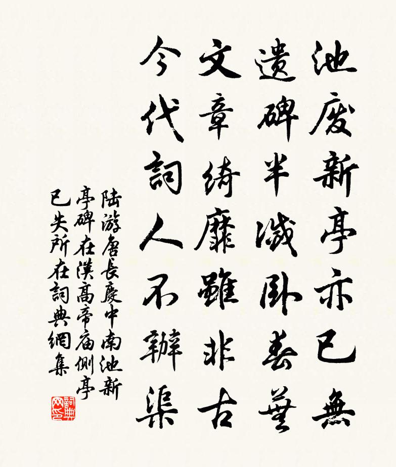 詩詞名句歷史字典書法欣賞書法字典國語詞典說文解字康熙字典古漢語字典標 題 作 者 詩 句 唐長慶中南池新亭碑在漢高帝廟側亭已失所在作者:陸游 朝代:宋代原文池廢新亭亦已無,遺碑半滅臥春蕪。文章綺靡雖非古,今代詞人不辦渠。詩詞問答問:《唐長慶中南池新亭碑在漢高帝廟側亭已失所在》的作者是誰?答:陸游問:該詩寫於哪個朝代?答:宋代問:陸游的名句有哪些?答:陸游名句大全書法欣賞唐長慶中南池新亭碑在漢高帝廟側亭已失所在書法作品詩詞推薦席上再送蘇轍〔宋代〕人言虎頭痴,勇作河朔游。黃河六七月,不辨馬與牛。腳踏車徑北渡,橫身障西流。虎頭亦不痴,志在萬戶侯。徜徉倦尋芳陳允平〔宋代〕杏檐轉午。青漏沈沈,春夢無據。鳳錦龜紗,空閉酒塵香霧。流水行雲天四遠,玉簫聲斷人何處。倦尋芳,鎮情尖東柯院妖謔杜令佚名〔唐代〕雖共蒿蘭伍,南朝有宗祖。莫打綠袍人,空中且歌舞。堪憐木邊土,非兒不似女。瘦馬上高山,登臨何自苦。八檜圖王令〔宋代〕客有要我八檜吟,手攜八檜圖來懸。掛張滿壁惕可駭,盼顧左右同嗟嘆。旁摹石刻署名狀,各有憑附相黃緣。或高偈頌二百零五首釋正覺〔宋代〕人平不語,水平不流。風定華猶落,鳥啼山更幽。只麽天真無少剩,莫於里許著絲頭。自釋休官之意方回〔宋代〕七載休官學老農,間關垂死脫兵鋒。折腰早覺身難屈,饒舌懸知世不容。已幸櫟陽歸舊質,可能稷嗣冀新封。時清臨江仙黃人傑〔宋代〕解事西風真可意,秋聲不到堯蓂。尚餘□莢十分清。知君當此際,清夢應長庚。道骨仙風元不老,天開鶴算龜齡。正月十六日夜二絕陳與義〔宋代〕正月十六夜,竹籬田父家。明月照樹影,滿山如龍蛇。送林子中安厚卿二學士奉使高麗二首蘇轍〔宋代〕官是蓬萊海上仙,此行聊復看桑田。鯤移鵬徙秋帆健,潮闊天低曉日鮮。平地誰言無嶮岨,仁人何處不安全。但將道彭澤張耒〔宋代〕姓陶令尹今何在,空補陳編歸去來。安得春江作春酒,百年長與子銜杯。減字木蘭花(贈尼師,舊角奴也)張孝祥〔宋代〕 * 泛月。往事悠悠休更說。拍碎琉璃。始覺從前萬事非。清齊淨戒。休作斷腸垂淚債。識破囂塵。作個逍遙物外十一月七日五首張耒〔宋代〕水霧今晨重,山川不復分。自然無日色,那更挾霜分。烏鳥依寒寂,漁樵散暝昏。一杯聊愈疾,令我憶違君。余融州生日陳藻〔宋代〕牂牁相遇說長年,一在公堂一洞天。清遠使君黃石老,西周柱史混元仙。端午貼子詞皇帝閣六首真德秀〔宋代〕庾午仍重午,離明正繼明。炎圖千萬歲,從此愈光亨。簽判丈見約同諸丈攜酒過賈新之運屬適以周侍趙蕃〔宋代〕載酒俱期過閬仙,悵然何事獨求船。春風易遠朝天旆,夜雨空成借榻眠。誰謂此行真不遇,了知一笑欠前緣。連朝題邵武熙春台呈王子文使君戴復古〔宋代〕步到風煙上上頭,恍如造物與同游。千山表里重圍過,一水中間自在流。近郭樓台隔雲見,鄰峰鐘磬出林幽。風流更漏子(雪中韓叔夏席上)向子諲〔宋代〕小窗前,疏影下。鸞鏡弄妝初罷。梅似雪,雪如人。都無一點塵。暮江寒,人響絕。更著朦朧微月。山似玉,玉如水調歌頭曾布〔宋代〕義城元靖賢相國,喜慕英雄士,賜金繒。聞斯事,頻嘆賞,封章歸印。請贖馮燕罪,日邊紫泥封詔,闔境赦深刑。彭心齋諱逢源自作頌呈師師於一句下加三句釋印肅〔宋代〕妙哉心齋,淺入深埋。欲識神通並妙用,何妨運水及搬柴。留春令黃庭堅〔宋代〕江南一雁橫秋水。嘆咫尺、斷行千里。回紋機上字縱橫,欲寄遠、憑誰是。謝客池塘春都未。微微動、短牆桃李。名句推薦贈人以言,重於金石珠玉;觀人以言,美於黼黻、文章;聽人以言,樂於鐘鼓琴瑟。荀子《荀子·非相》 明敕星馳封寶劍,辭君一夜取樓蘭。王昌齡《從軍行七首》 承恩不在貌,教妾若為容。杜荀鶴《 * 怨》 烽火平安夜,歸夢到家山。崔與之《水調歌頭·題劍閣》 明朝事與孤煙冷,做滿湖、風雨愁人。吳文英《渡江雲三犯·西湖清明》 萬里橋西一草堂,百花潭水即滄浪。杜甫《狂夫》 致治之本,惟在於審。量才授職,務省官員。吳兢《貞觀政要·卷三·論擇官》 去年花里逢君別,今日花開已一年。韋應物《寄李儋元錫》 京國多年情盡改,忽聽春雨憶江南。虞集《聽雨》 門有車馬客,駕言發故鄉。陸機《門有車馬客行》