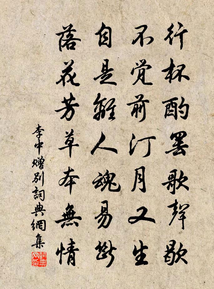 詩詞名句歷史字典書法欣賞書法字典國語詞典說文解字康熙字典古漢語字典標 題 作 者 詩 句 贈別作者:李中 朝代:唐代贈別原文行杯酌罷歌聲歇,不覺前汀月又生。自是離人魂易斷,落花芳草本無情。詩詞問答問:贈別的作者是誰?答:李中問:贈別寫於哪個朝代?答:唐代問:贈別是什麼體裁?答:七絕李中贈別書法欣賞贈別書法作品注釋全唐詩:卷747-7詩詞推薦千秋歲(壽友人)吳泳〔宋代〕松舟桂楫。苕霅溪頭別。秋後雨,春前雪。書憑湖雁寄,手把江蘺折。人未老,相看元似來時節。芳草鳴鶗鴂。野五雜俎范成大〔宋代〕五雜俎,流蘇縷。往復來,臨行語。不得已,上馬去。寄題彭澤王尉廨舍二境讀書岩楊萬里〔宋代〕不遇黃山谷,那傳石橘林。岩欺小孤頂,影落大江心。試聽秋蟲語,如聞夜誦音。梅仙癖嗜古,此外更幽尋。詠史上夏侯勝陳普〔宋代〕夏葛冬裘事已殊,茂陵禮樂議何迂。去周未遠真淳在,莫把公孫例漢儒。屈原塔蘇軾〔宋代〕楚人悲屈原,千載意未歇。精魂飄何處,父老空哽咽。至今滄江上,投飯救饑渴。遺風成競渡,哀叫楚山裂。屈原閒居書事唐異〔宋代〕幽居經宿雨,尾齒遍林塘。一境無過客,千山自夕陽。畫禽多獨語,夏木有餘涼。招隱詩慵寄,時清誰肯忘。上黃太史高荷〔宋代〕萬里南溪郡,黃香得賜環。盛名喧海內,摧翮返雲間。太史資誠峻,郎官選亦慳。朝廷才特起,堂奧援誰扳。一夢頌古十首釋師體〔宋代〕越鳥巢南枝,胡馬嘶北風。狸奴並白牯,寸步不曾通。千山都坐斷,萬派盡朝東。天王才合掌,那吒撲帝鍾。布袋贊釋紹曇〔宋代〕靠布袋坐,聽岩瀑笑。手把輪珠,數個什麼。內院拋離歲月深,啞,忘卻來時道。食梨曾鞏〔宋代〕今歲天旱甚,百穀病已久。山梨最大樹,屬此亦乾朽。當春花盛時,雪滿山前後。常期摘秋實,穰穰落吾手。忽驚楊少監寄西征近詩來,因賦二絕為謝。詩卷第范成大〔宋代〕錦囊隨上越王台,天海風濤亦壯哉。書到嶺頭梅恰動,一枝應伴一篇來。師厚明日歸南陽夜坐有懷梅堯臣〔宋代〕明朝子當去,我若雲失龍。龍歸雲未歸,索莫將安從。半夜出戶望,參畢已正中。倏然變陰黑,烈烈鳴窗風。窗鳴偈頌一百零二首釋慧遠〔宋代〕一粒紅稻飯,幾滴牛領血。憑君子細看,我亦難分雪。耕者耕未已,種者種不歇。目望九霄雲,誰顧三伏熱。秋收數日訴牒苦多憊甚戲作陸游〔宋代〕江南五月暑猶薄,梅子正黃風雨惡。庭中訟獠不貸人,急甚常如虎遭縛,空齋鼠跡留幾塵,賦詩飲酒疑前身。脫歸和商守登樓看雪邵雍〔宋代〕西樓賞雪眼偏明,次第身疑在水晶。千片萬片巧妝地,半舞半飛斜犯楹。形如玉悄依還碎,體似楊花又更輕。誰謂庚申元日口號陸游〔宋代〕南陌東阡自在身,耄年喜見歲華新。洛中九老非吾侶,且作山陰十老人。次韻子瞻和淵明飲酒二十首蘇轍〔宋代〕我性本疏懶,父母強教之。逡巡就科選,逮此年少時。幽憂二十年,懶性祗如茲。偶然踐黃闥,俯仰空自疑。乞身句薛紹彭〔宋代〕水雲生四面,常恐世人迷。玉樓春方千里〔宋代〕華堂銀燭堆紅淚。解說離人多少意。恨從別後恨無窮,愁到濃時惟一味。江南渭北三千里。憔悴相思何日已。馬蹄夜坐待月次日補吟衛宗武〔宋代〕瑤壇禮碧虛,返次羽人坐。引脰延月華,吞吐隔翠嶞。眾吻盼流芳,冉冉忽透過。大規雖微虧,猶喜鏡未破。浮翳名句推薦金風玉露一相逢,便勝卻人間無數。秦觀《鵲橋仙·纖雲弄巧》 耕夫召募愛樓船,春草青青萬項田;張繼《閭門即事》 欲寄彩箋兼尺素,山長水闊知何處?晏殊《蝶戀花·檻菊愁煙蘭泣露》 楚天千里清秋,水隨天去秋無際。辛棄疾《水龍吟·登建康賞心亭》 最是倉皇辭廟日,教坊猶奏別離歌,垂淚對宮娥。李煜《破陣子·四十年來家國》 春江潮水連海平,海上明月共潮生。張若虛《春江花月夜》 易挑錦婦機中字。難得玉人心下事。劉克莊《玉樓春·戲林推》 起來搔首,梅影橫窗瘦。汪藻《點絳唇·新月娟娟》 空獨倚東風,芳思誰寄。周密《繡鸞鳳花犯·賦水仙》 甘受人欺,定非懦弱;自謂予智,終是糊塗。王永彬《圍爐夜話·第一二五則》