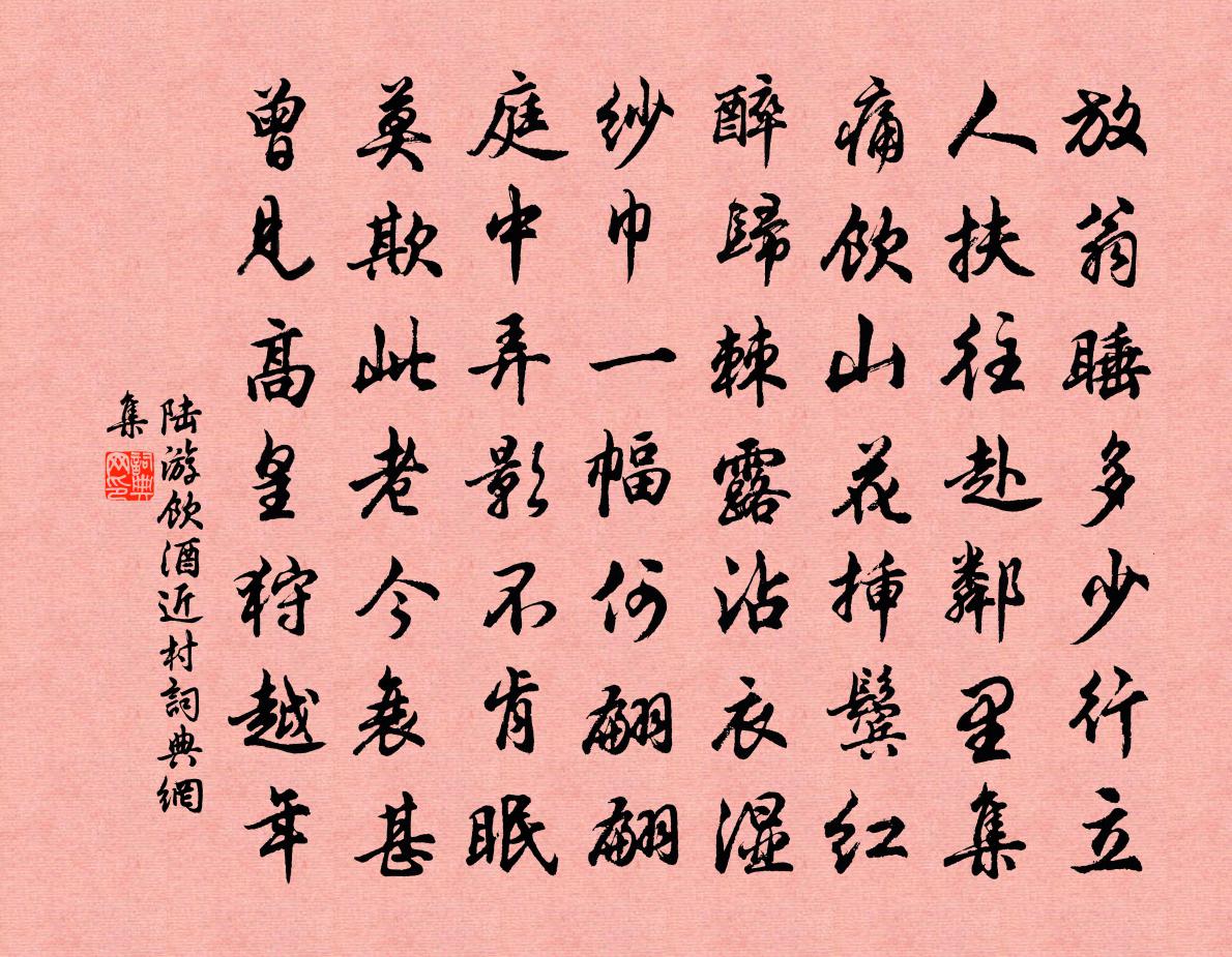 放翁睡多少行立,人扶往赴鄰里集。痛飲山花插鬢紅,醉歸棘露沾衣濕。