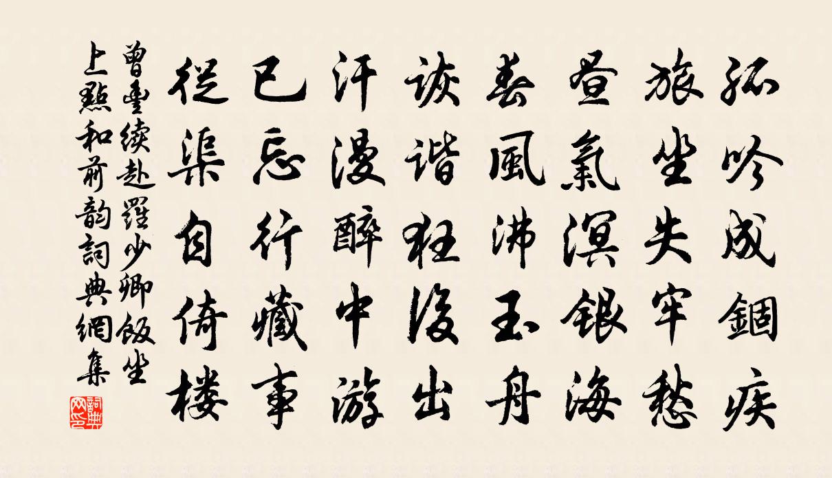 詩詞名句歷史字典書法欣賞書法字典國語詞典說文解字康熙字典古漢語字典標 題 作 者 詩 句 續赴羅少卿飯坐上點和前韻作者:曾豐 朝代:宋代續赴羅少卿飯坐上點和前韻原文孤吟成錮疾,旅坐失牢愁。晝氣溟銀海,春風沸玉舟。詼諧狂後出,汗漫醉中游。已忘行藏事,從渠自倚樓。詩詞問答問:續赴羅少卿飯坐上點和前韻的作者是誰?答:曾豐問:續赴羅少卿飯坐上點和前韻寫於哪個朝代?答:宋代曾豐續赴羅少卿飯坐上點和前韻書法欣賞續赴羅少卿飯坐上點和前韻書法作品詩詞推薦五龍六首佚名〔宋代〕靈之智兮,躍漢潛幽。欲前擾兮,無董興劉。陳金石兮,佐侑牢羞。庶燕享兮,澤應民求。和豐城鄒端簡韻就送其歸姚勉〔宋代〕批了龍鱗歸釣魚,江濤帖息果天歟。腰雖未印衣重彩,囊縱無金篋有書。日可事劉宜令伯,天教名子更僑如。本原迎春樂方千里〔宋代〕參差鳳鐸鳴高屋。漸驚覺、清眠熟。看夕陽倒影花陰速。雙燕子、歸來宿。幾曲危腸愁易束。問雪鬢、何時重綠。舟中峽口真山民〔宋代〕亂山如碧玉,處處見鵑花。水漲傍分港,舟行倒走沙。宿依沽酒市,飯過釣魚家。喜脫風波險,推篷數暝鴉。五用喜雨韻三首吳潛〔宋代〕暗雲潑雨土生香,不假琮黃與璧蒼。天道從來關感應,人閒此際換炎涼。青燈可近聊憑案,緗帙堪翻謾啟箱。窗外題海陵寓舍四首之二賀鑄〔宋代〕近濕籬根歌蟪蛄,向明屋角網蜘蛛。黃葵紫莧雨張王,花蚊白蟻風驅除。輾轉猶憎夏夜久,支離何堪春病餘。預愁一剪梅·漠漠春陰酒半佚名〔宋代〕漠漠春陰酒半酣。風透春衫,雨透春衫。人家蠶事欲眠三。桑滿筐籃,柘滿筐籃。先自離懷百不堪。檣燕呢喃,梁贈項斯(一作王建詩,題雲贈賈島)張籍〔唐代〕端坐吟詩忘忍飢,萬人中覓似君稀。門連野水風長到,驢放秋原夜不歸。日暖剩收新落葉,天寒更著舊生衣。曲江句林興宗〔宋代〕形容變盡頭如雪,不改當時一寸心。江郎山和韻辛棄疾〔宋代〕三峰一一青如削,卓立千尋不可乾。正直相扶無倚傍,撐持天地與人看。東村晚歸陸游〔宋代〕蜀道還吳鬢已絲,歷年二紀固應衰。寧知病思沉綿日,又見秋風搖落時。錦雉白魚供野餉,青林紅樹入新詩。東村岳陽別李十七越賓王昌齡〔唐代〕相逢楚水寒,舟在洞庭驛。具陳江波事,不異淪棄跡。杉上秋雨聲,悲切蒹葭夕。彈琴收餘響,來送千里客。平明挽錢仲耕運使孫應時〔宋代〕樂易無畦畛,寬平不細苛。人才隨世狹,時望獨公多。獻納開丹禁,風神照紫荷。誰令終遠外,百歲轉蓬科。逍遙詠宋太宗〔宋代〕玄之玄又見真空,巧拙臨時要妙中。大智伏藏知遠近,織微盡達瞭然通。周旋物性誰區別,坦蕩由來是且同。境致金陵官舍後圃散二首楊萬里〔宋代〕旋種花窠二百株,不知種了有花無。阿誰便向春工說,急搗紅藍染玉酥。西湖游次韻趙見燭王之道〔宋代〕山鎮在越澤在吳,東南形勢憑江湖。不知弱水竟何處,恍若員嶠連方壺。海門潮至飛雪涌,天竺雨過遙青紆。十年想東遊五十韻白居易〔唐代〕海內時無事,江南歲有秋。生民皆樂業,地主盡賢侯。郊靜銷戎馬,城高逼鬥牛。平河七百里,沃壤二三州。[自減字木蘭花沈瀛〔宋代〕適然萃止。不待燈花先報喜。不速真風。且免毛生不為通。詩歌棋酒。真正清歡真正壽。事事真何。更得真真真更送竇十九判官使江南張繼〔唐代〕遊客淹星紀,裁詩煉土風。今看乘傳去,那與問津同。南郡迎徐子,臨川謁謝公。思歸一惆悵,於越古亭中。春日和林宗易韻陳傅良〔宋代〕白與紅兼盡落梅,小園獨步日千回。浮空曉色臨無際,排闥春光撥不開。學語新禽更後囀,鋪茸細草雨邊來。卻憐名句推薦唯不求利者為無害,唯不求福者為無禍。劉安及其門客《淮南子·詮言訓》 殘雪庭陰,輕寒簾影,霏霏玉管春葭。王沂孫《高陽台·和周草窗寄越中諸友韻》 樓外垂楊千萬縷。欲系青春,少住春還去。朱淑真《蝶戀花·送春》 四月十七,正是去年今日,別君時。韋莊《女冠子·四月十七》 雨打梨花深閉門,忘了青春,誤了青春。唐寅《一剪梅·雨打梨花深閉門》 報導山中去,歸時每日斜皎然《尋陸鴻漸不遇》 還與去年人,共藉西湖草。蘇軾《卜運算元·感舊》 芳草已雲暮,故人殊未來。韋莊《章台夜思》 孤之有孔明,猶魚之有水也。陳壽《隆中對》 銀燭秋光冷畫屏,輕羅小扇撲流螢。杜牧《秋夕》