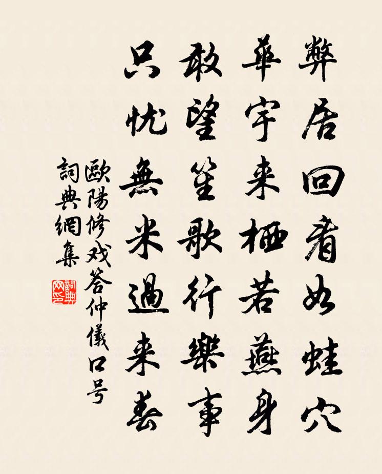 詩詞名句歷史字典書法欣賞書法字典國語詞典說文解字康熙字典古漢語字典標 題 作 者 詩 句 戲答仲儀口號作者:歐陽修 朝代:宋代戲答仲儀口號原文弊居回看如蛙穴,華宇來棲若燕身。敢望笙歌行樂事,只憂無米過來春。詩詞問答問:戲答仲儀口號的作者是誰?答:歐陽修問:戲答仲儀口號寫於哪個朝代?答:宋代問:歐陽修的名句有哪些?答:歐陽修名句大全歐陽修戲答仲儀口號書法欣賞戲答仲儀口號書法作品詩詞推薦古洗章甫〔宋代〕古人不可見,古物亦無幾。今朝雙眼明,乃識漢時洗。規模簡而質,仿佛古君子。年深土銷蝕,薄處僅如紙。篆名晚登子城陸游〔宋代〕江頭作雪雪未成,北風吹雲如有營。驅車出門何所詣,一放吾目登高城。城中繁雄千萬戶,朱門甲第何崢嶸。錦機寄山中伉禪師貫休〔唐代〕舉世遭心使,吾師獨使心。萬緣冥目盡,一句不言深。野火燒禪石,殘霞照栗林。秋風溪上路,終願一相尋。何參政輓歌葉適〔宋代〕宿昔叨殊眷,尋常款直廬。聽雞催謁駕,立馬待紬書。零落誰存者,追尋昨夢余。何曾嗔石介,韓愈自狂疎。送張使君赴饒州(一作送饒州張蒙使君赴任)章孝標〔唐代〕饒陽因富得州名,不獨農桑別有營。日暖提筐依茗樹,天陰把酒入銀坑。江寒魚動槍旗影,山晚雲和鼓角聲。太守次韻虞永康十月海棠魏了翁〔宋代〕冷淡庭梅儼玉顏,孤高翠竹聳修鬟。如何富貴天然質,猶欲尋盟二友間。句齊唐〔宋代〕春波池上搘琴薦,秋月桐陰把蟹螯。南徐夕眺司馬扎〔唐代〕行吟向暮天,何處不悽然。岸影幾家柳,笛聲何處船。樓分瓜步月,鳥入秣陵煙。故里無人到,鄉書誰為傳。浣溪沙劉過〔宋代〕誰把幽香透骨薰。韻高全似玉樓人。幾時勸酒不深顰。竹里絕憐閒體態,月邊無限好精神。一枝斜插坐生春。送淳安括田省委買都事何夢桂〔宋代〕白馬何方來,青絲紅錦韉。手持省府檄,身著從事衫。分麾蒞屬邑,銜命司括田。一見為鸞鳳,不肯為鷹鸇。視民水仙子馬致遠〔元代〕春風驕馬五陵兒,暖日西湖三月時,管弦觸水鶯花市。不知音不到此,宜歌宜酒宜詩。山過雨顰眉黛,柳拖煙堆鬢感懷宋祁〔宋代〕俯首周南淚未乾,驚開魚素得雙盤。心隨月樹烏三匝,病費仙山藥一丸。久許橫經陪闕里,更憂舉步學邯鄲。髀銷清平樂·檢校山園書所見辛棄疾〔宋代〕連雲松竹,萬事從今足。拄杖東家分社肉,白酒床頭初熟。西風梨棗山園,兒童偷把長竿。莫遣旁人驚去,老夫靜代張京尹賀皇太子生辰三首彭龜年〔宋代〕神光開甲觀,寰海作重陽。世盡占人瑞,天應發子祥。山河涵玉露,象緯瀉銀潢。有道如三代,寧須不老方。方太君生朝四首項安世〔宋代〕夾鍾琯里聽春聲,天上箜篌次第鳴。數到一弦弦足處,孟家機畔慶長生。句王之望〔宋代〕雪班遠岫明蒼鬢,春秀奇峰擁翠鬟。詔除虛額錢計庭遣簡州通判王和叟再至謂考實晁公溯〔宋代〕天王念遠民,哀此西南隅。主者按其籍,取之盡錙銖。掃地皆赤立,名獨存版圖。竭澤儻未已,來年恐無魚。歸詔賦詠得神仙詩陰鏗〔南北朝〕羅浮銀是殿。瀛洲玉作堂。朝游雲暫起。夕餌菊恆香。聊持履成燕。戲以石為羊。洪厓與松子。乘羽就周王。和汪正夫梅鄭獬〔宋代〕流俗休教見美才,不如長入醉鄉來。江南蚤是多風雨,莫向花前唱落梅。雜詠一百首王戎劉克莊〔宋代〕惜李常鑽核,商財自執籌。如何嵇阮輩,放入竹林游。名句推薦玉慘花愁出鳳城,蓮花樓下柳青青。聶勝瓊《鷓鴣天·別情》 新秋逢閏,鵲橋重駕,兩度人間乞巧。顧太清《鵲橋仙·雲林矚題閏七夕聯吟圖》 教婦初來,教兒嬰孩。顏之推《顏氏家訓·教子篇》 誰料蘇卿老歸國,茂陵松柏雨蕭蕭。李商隱《茂陵》 又是重陽近也,幾處處,砧杵聲催。秦觀《滿庭芳·碧水驚秋》 生生死死,非物非我,皆命也,智之所無柰何。列子及其弟子《列子·力命》 人生有酒須當醉,一滴何曾到九泉。高翥《清明日對酒》 芳洲拾翠暮忘歸,秀野踏青來不定。張先《木蘭花·乙卯吳興寒食》 白雲回望合,青靄入看無。王維《終南山》 人生無根蒂,飄如陌上塵。陶淵明《雜詩》