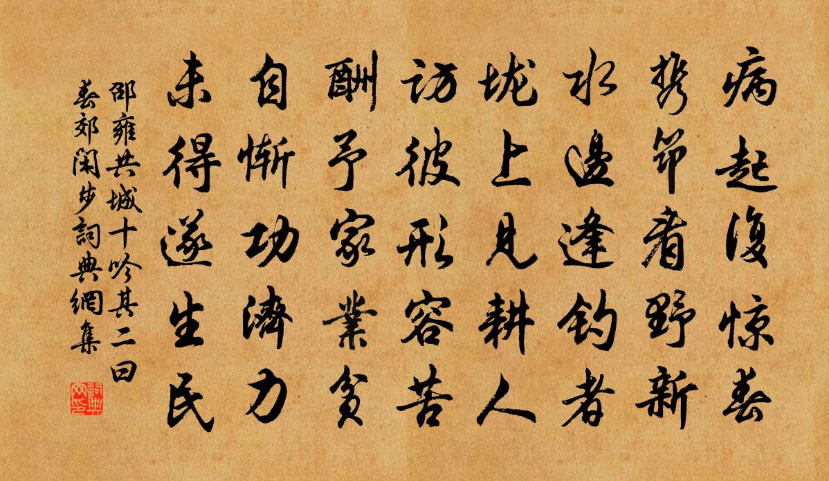 詩詞名句歷史字典書法欣賞書法字典國語詞典說文解字康熙字典古漢語字典標 題 作 者 詩 句 共城十吟其二曰春郊閒步作者:邵雍 朝代:宋代共城十吟其二曰春郊閒步原文病起復驚春,攜筇看野新。水邊逢釣者,壠上見耕人。訪彼形容苦,酬予家業貧。自慚功濟力,未得遂生民。詩詞問答問:共城十吟其二曰春郊閒步的作者是誰?答:邵雍問:共城十吟其二曰春郊閒步寫於哪個朝代?答:宋代邵雍共城十吟其二曰春郊閒步書法欣賞共城十吟其二曰春郊閒步書法作品詩詞推薦三月二十日出郊泛舟西津得予字李燾〔宋代〕春日行郊坰,南風初唱予。相攜出城郭,著意買江湖。句好從兒覓,杯乾任客呼。長年足詩酒,此外復何須。送劉評事赴廣州使幕韓翃〔唐代〕征南官屬似君稀,才子當今劉孝威。蠻府參軍趨傳舍,交州刺史拜行衣。前臨瘴海無人過,卻望衡陽少雁飛。為報壽蘇友橘鄭會〔宋代〕一春湖上看花枝,看到青青杏子肥。家在江南身在浙,年年生日未曾歸。贈嚴司直徐夤〔唐代〕承家居闕下,避世出關東。有酒劉伶醉,無兒伯道窮。新詩吟閣賞,舊業釣台空。雨雪還相訪,心懷與我同。題榠查紅葉楊萬里〔宋代〕榠查將葉學丹楓,戲與攀條撼晚風。一片飛來最奇絕,碧羅袖尾滴猩紅。斑竹夫人方岳〔宋代〕山谷青奴娛夜,秋崖斑媛專房。爾定婕妤失笑,爾孫流落荒涼。秋懷三十六首邵雍〔宋代〕疏雨滴高梧,微風挼弱柳。此景歲歲同,世人自白首。俗慮易縈仍,塵襟難抖擻。浮生已夢中,其間強為有。半山寺三首楊萬里〔宋代〕日邊賜額寺名新,雞犬猶迎舊主人。見說小兒齊拍手,半山寺主褁頭巾。赴野渡招賞桂衛宗武〔宋代〕幾年寥落負秋光,剩喜朋簪列耐堂。枌社重開真率集,桂華新薦廣寒香。故交今日嗟無幾,我輩晨星當自強。況有草堂王安石〔宋代〕草堂今寂寞,往事翳山椒。蕙帳空留鶴,蘿衣終換貂。生皆墮天秩,隱或寄公朝。疊穎何勞怒,東風汝自搖。橫路林少皋輓詞林亦之〔宋代〕十年騎馬畫橋歸,長記朱樓傍水湄。今日悲吟想君屋,一如騎馬十年時。和答張衡仲孫應時〔宋代〕志略周公瑾,才名陸敬輿。可憐空老大,不敢問何如。松菊間吟外,風婆噩夢余。諸公自台省,吾復愛吾廬。同何元立蔡肩吾至東丁院汲泉煮茶陸游〔宋代〕一州佳處盡裴回,惟有東丁院未來。身是江南老桑薴,諸君小住共茶杯。夢昔時元稹〔唐代〕閒窗結幽夢,此夢誰人知。夜半初得處,天明臨去時。山川已久隔,雲雨兩無期。何事來相感,又成新別離。吳山仁王寺周弼〔宋代〕山寺憑高夕未昏,上皇曾此定乾坤。甌閩散驛緣江島,龕赭收潮入海門。細雨亂花唐輦道,淡煙疏柳漢營屯。何時嘲曹掾友人華岳〔宋代〕世態年來日日新,宦途澆薄更驚人。闕期動徹連三政,選調無疑費百緡。是吏有囊盛短卷,非財無藥療長貧。參軍擬水西寺東峰亭九詠林中翠梅堯臣〔宋代〕萬木總柔翠,況復新晴時。日色照欲動,山氣斂還遲。望之如何攬,舉袂隨風吹。八獄第一百二文天祥〔宋代〕勞生共乾坤,何時有終極。燈影照無睡,今夕復何夕。重葺敝廬有作宋祁〔宋代〕履市喧卑極,家林改築初。藩傾猶置筆,楹破尚逢書。徑草臨江府,園畦洛涘居。憑誰遺真意,仁義亦蘧廬。和陶黃文雷〔宋代〕上有書碧松林,書下有白石書道。中有書學仙人,自號枯松老。蛻身千歲余,坐息如木槁。面目劇嚴冷,但道空虛名句推薦雞聲茅店月,人跡板橋霜。溫庭筠《商山早行》 傷心千里江南,怨曲重招,斷魂在否?吳文英《鶯啼序·春晚感懷》 明朝萬一西風動,爭向朱顏不耐秋。晏幾道《鷓鴣天·守得蓮開結伴遊》 眼覷著災傷教我沒是處,只落得雪滿頭顱。張養浩《一枝花·詠喜雨》 時有官船橋畔過,白鷗飛去落前灘。姜夔《釣雪亭》 秋風蕭瑟,洪波湧起。曹操《觀滄海 / 碣石篇》 樹木何蕭瑟,北風聲正悲。曹操《苦寒行》 千古興亡多少事?悠悠。不盡長江滾滾流。辛棄疾《南鄉子·登京口北固亭有懷》 便覺眼前生意滿,東風吹水綠參差。張栻《立春偶成》 芙蓉老秋霜,團扇羞網塵。李白《中山孺子妾歌》