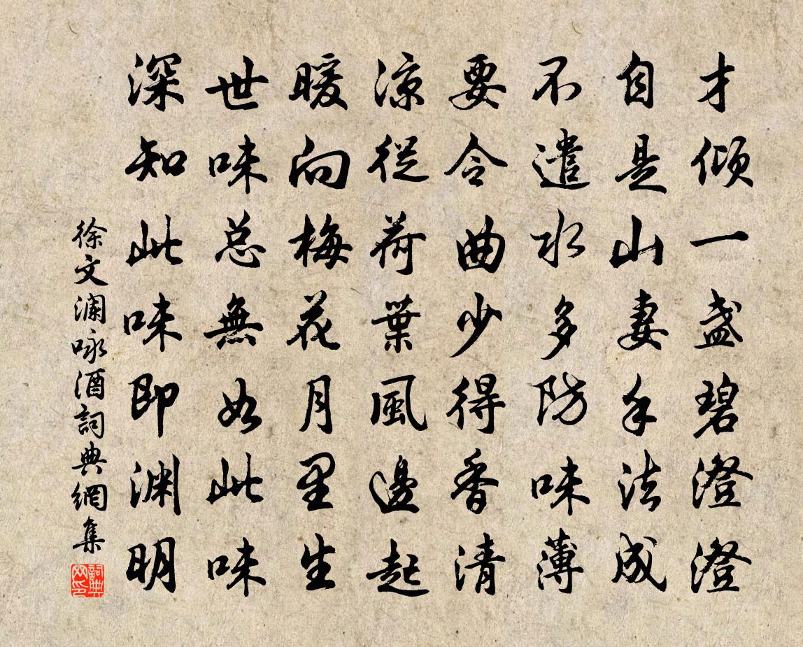詩詞名句歷史字典書法欣賞書法字典國語詞典說文解字康熙字典古漢語字典標 題 作 者 詩 句 詠酒作者:徐文瀾 朝代:宋代詠酒原文才傾一盞碧澄澄,自是山妻手法成。不遣水多防味薄,要令曲少得香清。涼從荷葉風邊起,暖向梅花月里生。世味總無如此味,深知此味即淵明。詩詞問答問:詠酒的作者是誰?答:徐文瀾問:詠酒寫於哪個朝代?答:宋代徐文瀾詠酒書法欣賞詠酒書法作品詩詞推薦山居十三首蔡格〔宋代〕天下無如聞道樂,人間惟有養心高。煙花過眼須臾滅,明德馨香萬古牢。樛枝檜李廌〔宋代〕檜今老矣何兢兢,樛枝下屈如不勝。左松右柏非爾朋,繁霜茂雪徒驕矜。鞠躬不敢騫其肱,午陰淒淒綠鬅鬙。六月三日兄弟侍老人展墓歸和尊韻洪咨夔〔宋代〕雲淡風柔霽色輕,瀧岡阡上氣和明。莫思舊日遨頭出,且試新年便面行。飽飯即為君子泰,濁醪不失聖人清。一翁酬談校書長安秋夜對月寄諸故舊武元衡〔唐代〕故園千里渺遐情,黃葉蕭條白露生。驚鵲繞枝風滿幌,寒鍾送曉月當楹。蓬山高價傳新韻,槐市芳年挹盛名。莫怪過鸚鵡洲王處士別業劉長卿〔唐代〕白首此為漁,青山對結廬。問人尋野筍,留客饋家蔬。古柳依沙發,春苗帶雨鋤。共憐芳杜色,終日伴閒居。少年游 游鑑湖 以上四十二首詞,見天一閣本張可久〔元代〕美人歌舞競湖中。秋鏡簇春紅。載酒船來,洗花雨過,清似水晶宮。御羅單扇題新字,爭看蕺山翁。石上棋殘,松和吳叔永見寄韻李曾伯〔宋代〕眼空凡馬絕全牛,肯念江萍萬里浮。一倡朱弦補騷雅,片言華袞續春秋。禮羅自昔須溫造,文館而今欠薛收。要任用從軍古雲樂為韻賀楊覺甫乾李曾伯〔宋代〕求士近取材,論人遠稽古。鄭公得杜陵,晉公有韓愈。上思利社稷,下不愧賓主。斯言宜服膺,餘子未足數。偈頌一百五十首釋心月〔宋代〕白髮垂垂一葉身,今年貧似去年貧。住山不與山為主,水石煙雲也笑人。和戴禹功幕府歸來三首王之道〔宋代〕抖擻空腸一字無,下邳能復異時書。中興正欲平驕寇,莫若相如賦子虛。追和彭城太尉夏月寄題湖上湛源大師房林逋〔宋代〕碧蒲紅蓼白蓮房,一片欒櫨撼水光。海岸空聞有孤絕,山中休道更清涼。驚飛翡翠當軒鳥,裊過旃檀別院香。最愛楊都官知隨陽宋祁〔宋代〕棧道迴忠馭,牢盆幹計貲。文書三署草,兄弟五常眉。遽爾分符竹,欣然捧詔芝。疾驅關外傳,奉引漢東旗。夕月和百塔寺四首水閣黃庶〔宋代〕山僧聽泉心不足,鑿池汲引為蟾泓。自言猶欲洗俗耳,夜靜為聞蛙黽聲。送趙撫乾趙班劉克莊〔宋代〕貴重元身外物輕,薦書慫恿入都城。金閨得路通初籍,玉座臨軒再唱名。岩邑古人難錦制,長官叔世少琴聲。今皇早秋諸友真率相聚白玉蟾〔宋代〕白帝如今已有權,驕陽退壁漸涼天。兌支一霎風來享,供送三更月與眠。山水秋來渾是畫,賓朋酒後總成仙。暗蛩贈秋山道人謝枋得〔宋代〕曬衣台上草春深,天遣詩人近士林。宇宙中間千萬變,長歌收拾付閒心。早春十絕呈石湖陳造〔宋代〕中林頻度養花風,合放林梢一點紅。蝴蝶與春偏有約,依依先占去年叢。又用前韻二首林季仲〔宋代〕雕甍華棟照晴空,更憶檐前十八公。四望川流何富有,一時歌詠許誰同。海吞萬壑蒼煙外,地涌雙峰白浪中。洞接又湘妃詩四首(一作女仙題湘妃廟詩)佚名〔唐代〕渺渺三湘萬里程,淚篁幽石助芳貞。孤雲目斷蒼梧野,不得攀龍到玉京。碧杜紅蘅縹緲香,冰絲彈月弄清涼。峰巒偈頌一百二十三首釋普度〔宋代〕雨滌炎威,秋雲自在。一片兩片拄杖頭,或卷或舒林木外。白璧明珠,泥團土塊。放去收來顆顆圓,填溝塞壑無人名句推薦楊柳絲絲弄輕柔,煙縷織成愁。王雱《眼兒媚·楊柳絲絲弄輕柔》 十日雨絲風片裡,濃春艷景似殘秋。王士禎《秦淮雜詩二十首·其一》 家童掃蘿徑,昨與故人期。錢起《谷口書齋寄楊補闕》 更可惜,雪中高樹,香篝熏素被。周邦彥《花犯·小石梅花》 梅雪爭春未肯降,騷人閣筆費評章。盧鉞《雪梅·其一》 角聲吹徹小梅花。夜長人憶家。趙長卿《阮郎歸·客中見梅》 雲母屏風燭影深,長河漸落曉星沉。李商隱《嫦娥》 長因送人處,憶得別家時張籍《薊北旅思/送遠人》 時不可失,喪不可久左丘明《國語·晉語·里克殺奚齊而秦立惠公》 妙極生知,睿哲惟宰。精理為文,秀氣成采。劉勰《文心雕龍·徵聖》