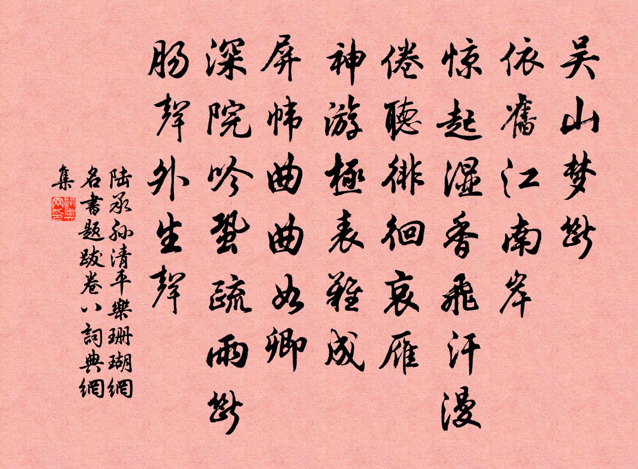 詩詞名句歷史字典書法欣賞書法字典國語詞典說文解字康熙字典古漢語字典標 題 作 者 詩 句 清平樂 珊瑚網名書題跋卷八作者:陸承孫 朝代:元代原文吳山夢斷。依舊江南岸。驚起濕香飛汗漫。倦聽徘徊哀雁。神遊極表難成。屏幃曲曲如卿。深院吟蛩疏雨,斷腸聲外生聲。詩詞問答問:《清平樂 珊瑚網名書題跋卷八》的作者是誰?答:陸承孫問:該詩寫於哪個朝代?答:元代問:該詩是什麼體裁?答:詞書法欣賞清平樂 珊瑚網名書題跋卷八書法作品詩詞推薦長孫霞李溟自紫閣白閣二峰見訪賈島〔唐代〕寂寞吾廬貧,同來二閣人。所論唯野事,招作住雲鄰。古寺期秋宿,平林散早春。漱流今已矣,巢許豈堯臣。鵲橋仙(挑巷弟生日)劉克莊〔宋代〕御屏錄了,冰銜換了,酷似香山居士。草堂丹灶莫留他,且領取、忠州刺史。移來芳樹,摘來珍果,壓盡來禽青李次前韻示楊明二首蘇轍〔宋代〕甘井元依廟,平湖亦近城。幅巾朝食罷,芒屩雨中行。擾擾初何事,悠悠畢此生。欲邀東郭叟,煩子作郊迎。南坡口號十八首鄭清之〔宋代〕酷愛鳥鳴山更幽,牆陰風雨但颼颼。筠籠買得春禽語,不會憂時也白頭。緣識宋太宗〔宋代〕皇天不事但多羅,莫道無緣奈我何。上有天堂下地獄,分明種麥不生禾。偶成 其一王冕〔元代〕人言栗里是吾家,問信東皋事已訛。殘歲都聞呼盜賊,良宵誰復望星河?門迎野水垂楊柳,屋枕雲山帶荔蘿。沽酒減字木蘭花張掄〔宋代〕神仙何處。若有宿緣須□□。□□□□。不在山林及市朝。丹爐休守。須信人人皆自有。此外非真。莫認凡砂與水次韻江陵張撫乾送行二首項安世〔宋代〕蕭蕭青草岸,籊籊釣魚竿。此地規逃世,傍人誤喚官。夏涼眠麓寺,春晚戲雩壇。卻笑平生謬,崎嶇自作難。客有教予謹言者,口占謝之方文〔清代〕野老生來不媚人,況逢世變益嶙峋。詩中憤懣妻常戒,酒後顛狂客每嗔。自分餘年隨運盡,卻無奇禍賴家貧。從今聞雁林寬〔唐代〕接影橫空背雪飛,聲聲寒出玉關遲。上陽宮裡三千夢,月冷風清聞過時。偈二首釋休〔宋代〕風動邪,幡動邪,風鳴邪,鈴鳴邪。非風鈴鳴,非風幡動。此土與西天,一隊黑漆桶。誑惑世間人,請看滅胡種。簡王道父陳傅良〔宋代〕瞻彼萬仞岩,亭亭上煙霞。其下寒淵水,清不容魚蝦。閔予生好修,而居東海涯。顧見泥中藏,日食百萬家。浮名贈石崇曹攄〔魏晉〕昂昂我牧。德惟人豪。作鎮方岳。有徽其高。英風遠扇。峻跡遐招。攻璞荊嵎。滋蘭江皋。朝采芝蕙。夕玩瓊瑤。出山相贊釋了惠〔宋代〕夜半見明星,山中添冷話。腳未出山來,此語行天下。我觀一切眾生成佛多時,只有你者老子猶欠悟在。河傳(二之一·仙呂調)柳永〔宋代〕翠深紅淺。愁蛾黛蹙,嬌波刀翦。奇容妙妓,爭逞舞裀歌扇。妝光生粉面。坐中醉客風流慣。尊前見。特地驚狂眼念奴嬌高惟月〔宋代〕岩扃不鎖,算空洞深窈,是誰初鑿。帝遣六丁持月斧,亂把雲根鑱斫。駭目奇觀,恍如崩浪,洶湧從天落。謫仙何發慈湖,過烈山,望見歷陽一帶山二首楊萬里〔宋代〕夢繞天津月再灣,慈湖解纜已開顏。淮山到眼渾相識,直北青梢是定山。和葛德遠姚勉〔宋代〕脫兔驚罝逸,潛魚畏餌逃。山林聊復爾,湖海可曾豪。藥笑多方誤,棋嗟不著高。且須隨野鹿,共此食苹蒿。送韋覲謫潘州李明遠〔唐代〕北鳥飛不到,南人誰去游。天涯浮瘴水,嶺外向潘州。草木春秋暮,猿猱日夜愁。定知遷客淚,應只對君流。漁父四時歌周必大〔宋代〕白浪粘天雲覆地,津人斷渡征人喟。欲矜好手傲風波,故把扁舟恣遊戲。雪蓑不博狐白裘,尺寸之膚暖即休。賣魚名句推薦流芳未及歇,遺掛猶在壁。潘安《悼亡詩三首》 人言落日是天涯,望極天涯不見家。李覯《鄉思》 江南可採蓮,蓮葉何田田。佚名《江南》 深村時節好,應為去年豐。范成大《寒食郊行書事》 記得舊時,探梅時節。老來舊事無人說。呂本中《踏莎行·雪似梅花》 夜覺曉非,今悔昨失顏之推《顏氏家訓·序致篇》 靜勝躁,寒勝熱。清靜為天下正。老子《老子·德經·第四十五章》 隋堤上、曾見幾番,拂水飄綿送行色。周邦彥《蘭陵王·柳》 兼相愛,交相利。墨子《墨子·15章 兼愛(中)》 夜聽胡笳折楊柳,教人意氣憶長安。王翰《涼州詞二首》