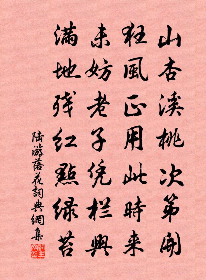 詩詞名句歷史字典書法欣賞書法字典國語詞典說文解字康熙字典古漢語字典標 題 作 者 詩 句 落花作者:陸游 朝代:宋代落花原文山杏溪桃次第開,狂風正用此時來。未妨老子憑欄興,滿地殘紅點綠苔。詩詞問答問:落花的作者是誰?答:陸游問:落花寫於哪個朝代?答:宋代問:陸游的名句有哪些?答:陸游名句大全陸游落花書法欣賞落花書法作品詩詞推薦胡兒莫窺江劉子翬〔宋代〕胡兒莫窺江,長江限絕吳楚間。驚濤駭浪如連山,鯨鯢出沒含戈鋋,汝不顧死爭相先。鳴髇不響突騎閒,浮屍隨潮送聘儒侄秋試袁說友〔宋代〕八月靈槎萬里秋,乘風得雋要遨頭。吾家連已躋儒級,汝業今宜濟巨舟。掘井莫令嗟九仞,善刀終自見金牛。儒冠所感方回〔宋代〕生涯今爾許,心悔舊為邦。老合營埋穴,貧猶買釀缸。山行憐瘦馬,晝誦喜晴窗。忽欲翩然去,風帆泝九江。漁歌子周巽〔元代〕負薪行唱路迢迢。幾朵梅花擔上挑。風正緊,雪初飄。曲中猶自憶前夜飲觀風堂龔漕折芙蓉侑酒吳芾〔宋代〕燈下看花已可人,此花那更有精神。不辭今日樽前醉,只恐紅妝不是真。送僧南歸簡長〔宋代〕漸老念鄉國,先歸獨羨君。吳山全接漢,江樹半藏雲。振錫林煙斷,添瓶澗月分。重棲上方定,孤狖雪中聞。鹿伯可郎中園池雜詠見一堂樓鑰〔宋代〕靈澈清詩千載傳,始聞林下有斯賢。傍人只道休官早,見一名堂已十年。頌古四十五首釋如珙〔宋代〕不曾出門去,莊上吃油糍。莊主歸相謝,侍者不得知。留別龔處士李白〔唐代〕龔子棲閒地,都無人世喧。柳深陶令宅,竹暗辟疆園。我去黃牛峽,遙愁白帝猿。贈君卷葹草,心斷竟何言。春思詩謝朓〔南北朝〕茹溪發春水。阰山起朝日。蘭色望已同。萍際轉如一。巢燕聲上下。黃鳥弄儔匹。邊郊阻游衍。故人盈契闊。夢寐立秋方回〔宋代〕暑赦如聞降德音,一涼歡喜萬人心。雖然未便梧桐落,終是相將蟋蟀吟。 * 銀河正牛女,詰朝紅日尾觜參。朝廷夜看牡丹溫庭筠〔唐代〕高低深淺一闌紅,把火殷勤繞露叢。希逸近來成懶病,不能容易向春風。長安在何許二首之一賀鑄〔宋代〕長安在何許,疑是青天上。矯首遡西風,溪雲斷人望。風雨中尋李十一因題船上白居易〔唐代〕匹馬來郊外,扁舟在水濱。可憐沖雨客,來訪阻風人。小榼沽清醑,行廚煮白鱗。停杯看柳色,各憶故園春。偈頌一百零二首釋紹曇〔宋代〕西子湖邊泛渺茫,一堤寒綠看垂楊。誰知業債難逃避,開眼堂堂入鑊湯。送劉秀才歸桑水寧覲齊己〔唐代〕歸和初喜戢戈矛,乍捧鄉書感去留。雁序分飛離漢口,鴒原騫翥在鰲頭。家鄰紫塞仍千里,路過黃河更幾州。應到早發湘中楊憑〔唐代〕按節鳴笳中貴催,紅旌白旆滿船開。迎愁湓浦登城望,西見荊門積水來。和主司王起(一作奉和主司王僕射答周侍郎賀放榜作)盧肇〔唐代〕嵩高降德為時生,洪筆三題造化名。鳳詔佇歸專北極,驪珠搜得盡東瀛。褒衣已換金章貴,禁掖曾隨玉樹榮。明日霜天曉角(泛池)張鎡〔宋代〕荷花閒撥。撐破玻璃滑。拂拂香風微度,吹雪亂、數根發。弄泉羅蓋匝。萬顆真珠撒。唱我蓮歌歸去,凌波步、水香港感懷十首黃遵憲〔清代〕豈欲珠崖棄,其如城下盟。帆檣通萬國,壁壘遏三城。虎穴人雄據,鴻溝界末明。傳聞哀痛詔,猶灑淚縱橫。名句推薦四面邊聲連角起,千嶂里,長煙落日孤城閉。范仲淹《漁家傲·秋思》 歌泣不成天已暮,悲風日夜起江生。魏禧《登雨花台》 送君歸去愁不盡,又惜空度涼風天。王昌齡《送狄宗亨》 千里孤墳,無處話淒涼。蘇軾《江城子·乙卯正月二十日夜記夢》 聞說東風亦多情,被竹外、香留住。史達祖《留春令·詠梅花》 荷風送香氣,竹露滴清響。孟浩然《夏日南亭懷辛大》 節用儲蓄,以備凶災范曄《後漢書·本紀·肅宗孝章帝紀》 眇眇孤舟逝,綿綿歸思紆。陶淵明《始作鎮軍參軍經曲阿作》 水是眼波橫,山是眉峰聚王觀《卜運算元·送鮑浩然之浙東》 三春已暮花從風,空留可憐與誰同。蕭衍《東飛伯勞歌》