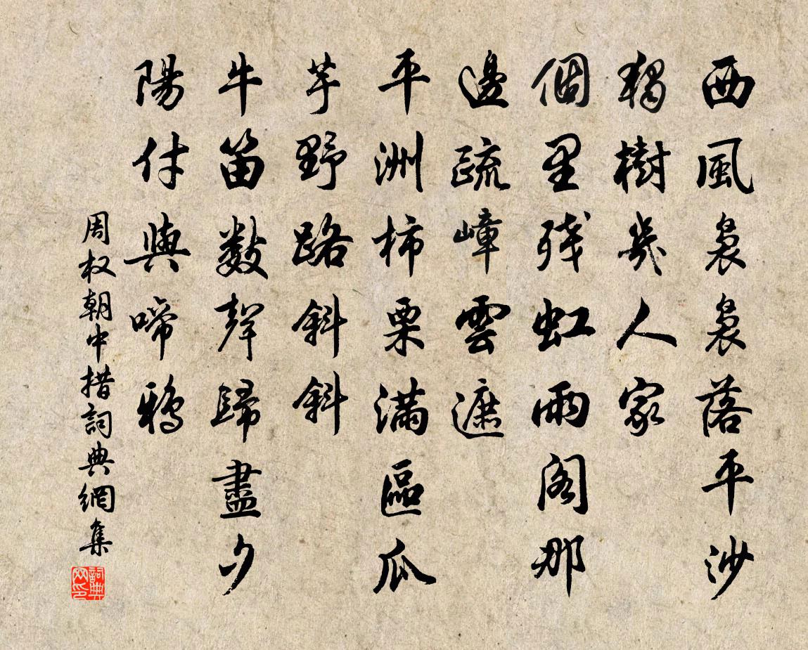 詩詞名句歷史字典書法欣賞書法字典國語詞典說文解字康熙字典古漢語字典標 題 作 者 詩 句 朝中措作者:周權 朝代:元代朝中措原文西風裊裊落平沙。獨樹幾人家。個裡殘虹雨閣,那邊疏嶂雲遮。平洲柿栗滿區瓜。芋野路斜斜。牛笛數聲歸盡,夕陽付與啼鴉。詩詞問答問:朝中措的作者是誰?答:周權問:朝中措寫於哪個朝代?答:元代問:朝中措是什麼體裁?答:詞周權朝中措書法欣賞朝中措書法作品詩詞推薦琴曲歌辭湘妃怨孟郊〔唐代〕南巡竟不返,帝子怨逾積。萬里喪蛾眉,瀟湘水空碧。冥冥荒山下,古廟收貞魄。喬木深青春,清光滿瑤席。搴芳馬詩二十三首·其一李賀〔唐代〕龍脊貼連錢,銀蹄白踏煙。無人織錦韂,誰為鑄金鞭。菩薩蠻趙長卿〔宋代〕倚樓小小穿針女。秋光點點蛛絲雨。今夕是何宵。龍車烏鵲橋。經年謀一笑。豈解令人巧。不用問如何。人間巧更用賒韻簡賈新之趙蕃〔宋代〕洛陽人物舊傳夸,殊縣相依得賈鼓。魯殿獨余多劫火,玄都看盡幾番花。寓懷不但篇章好,評古猶多論議嘩。問我題太岳院壁林焞〔宋代〕我來勸農值春雨,傍人笑我身藍縷。我身藍縷分當然,唯有擔夫愁艱阻。汝擔夫,聽我語,桑 * 粟生於土。若非點絳唇(武都靜林寺妙峰亭席上作。假山前引水,激起數尺)毛滂〔宋代〕秀嶺寒青,冷泉凌亂催秋意。佩環聲里。無限真珠碎。嘆我平生,識盡閒滋味。來閒地。為君一醉。萬事浮雲外。詩品二十四則。自然司空圖〔唐代〕俯拾即是,不取諸鄰。俱道適往,著手成春。如逢花開,如瞻歲新。真予不奪,強得易貧。幽人空山,過水采蘋。惜分飛(九日)袁去華〔宋代〕平日悲秋今已老。細看秋光自好。風緊寒生早。漫將短髮還吹帽。寂寞東籬人不到。只有淵明醉倒。一笑留殘照。雲溪釋紹曇〔宋代〕一從鎖斷清波路,密影重重布畫橋。著腳不知深淺處,定應攧折瞎驢腰。送陳穎仲赴省闈李彌遜〔宋代〕木末揮斤玉未鐫,清姿直節已飄然。詩書插架嗤三萬,文字撐腸富五千,筆下行看吐黃絹,選中應喜探青錢。管城憶秦娥·秋蕭索黃機〔宋代〕秋蕭索。梧桐落盡西風惡。西風惡。數聲新雁,數聲殘角。離愁不管人飄泊。年年孤負黃花約。黃花約。幾重庭院過蕭關張蠙〔唐代〕出得蕭關北,儒衣不稱身。隴狐來試客,沙鶻下欺人。曉戍殘烽火,晴原起獵塵。邊戎莫相忌,非是霍家親。徐進齋得古銅香爐具象鼻眼博古圖謂之象鬲屬俞文豹〔宋代〕在象數前鍾鼻眼,出囂塵外鑄形模。傳香到手親曾見,全勝人看博古圖。次韻和雪霽游西湖黃庶〔宋代〕雪會遊人意,元朝變物華。醉鄉銀作界,詩客玉為家。魚影紋冰縠,禽蹤篆霰沙。余英恐銷盡,目斷夕陽霞。題益陽清修寺張栻〔宋代〕峰勢香爐直,溪流峽水潺。居然一蘭若,喚作小廬山。老木千崖表,孤亭萬竹間。明朝問征路,回首白雲閒。久雨鄭剛中〔宋代〕漂泊初時尚念鄉,如今意定已都忘。小窗積雨韋編潤,慢火薰蘢藥裹香。正要門前蛛結網,何妨籬上蟻成行。山前化前題壁釋頓悟〔宋代〕精神若還天,肉骨又還上。上下都還了,此身元是主。惟有一點雲,不散還不聚。從然卻還來,未脫尋常母。若更沁園春 漁王玠〔元代〕不種田園,投閒江海,遠絕塵蹤。保一家性命,扁舟為屋,隨機應舵,逐浪乘風。九曲江頭,三元潭裡,直把銀鉤趙樂道輓詩二首毛滂〔宋代〕貧賤通姻好,淒涼累賞音。空知典刑在,誰聽短長吟。飛鶴窺塘水,眠牛傍柏林。龜魚迎拄杖,猶出畫橋陰。答寄魏衍陳師道〔宋代〕往昔敦朋好,猶能成報書。老衰渾得懶,疏密略相如。名墮網中蝶,身隨冰下魚。填門車馬客,左席為君虛。名句推薦岸邊兩兩三三,浣沙游女。柳永《夜半樂·凍雲黯淡天氣》 人閒桂花落,夜靜春山空。王維《鳥鳴澗》 躞蹀御溝上,溝水東西流卓文君《白頭吟》 善言天者必有徵於人,善言古者必有驗於今班固《漢書·傳·董仲舒傳》 群雞正亂叫,客至雞鬥爭。杜甫《羌村三首·其三》 攀荷弄其珠,蕩漾不成圓。李白《折荷有贈》 桂花浮玉,正月滿天街,夜涼如洗。文徵明《念奴嬌·中秋對月》 鄉書何處達?歸雁洛陽邊。王灣《次北固山下》 知其雄,守其雌,為天下谿。老子《老子·道經·第二十八章》 寒食不多時,牡丹初賣。晁沖之《感皇恩·寒食不多時》