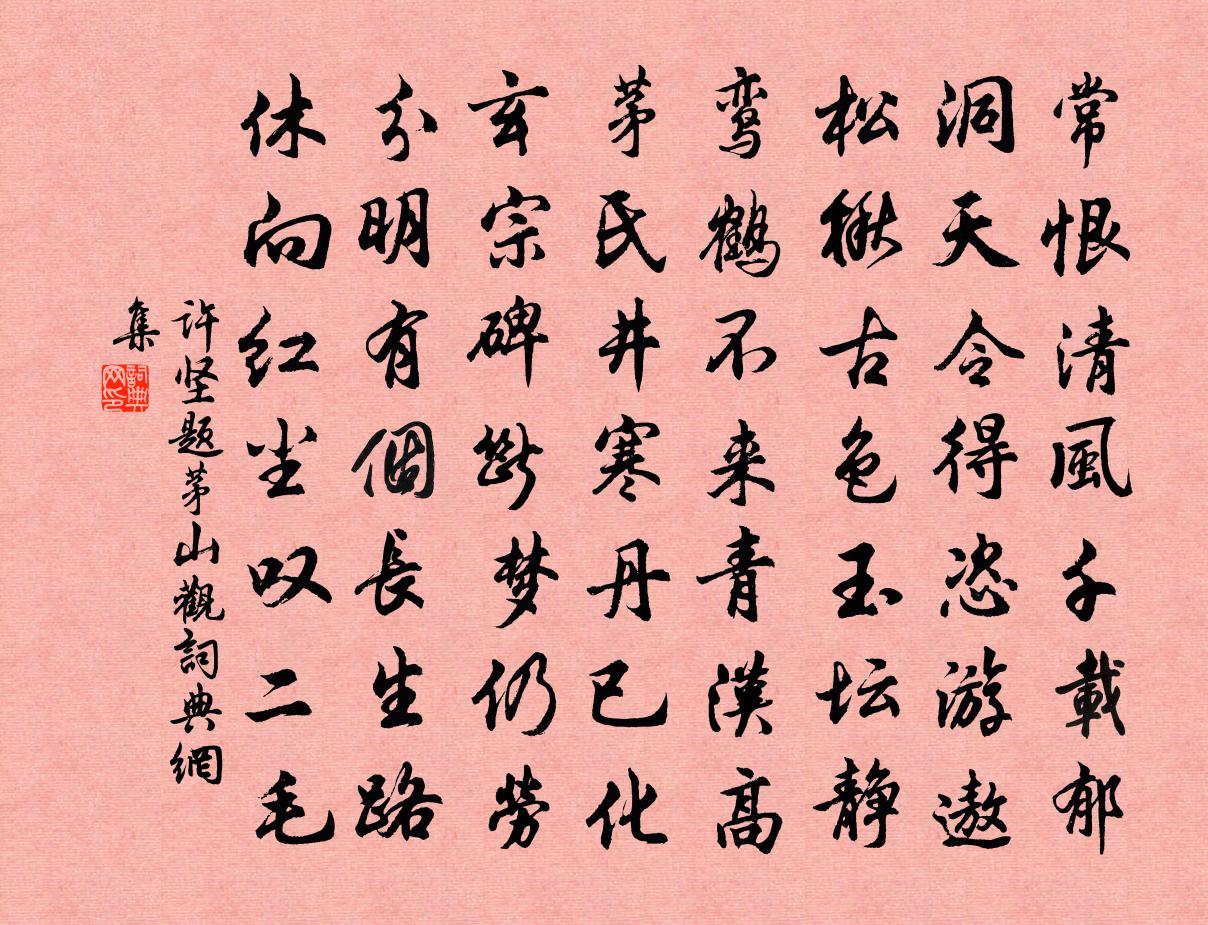 詩詞名句歷史字典書法欣賞書法字典國語詞典說文解字康熙字典古漢語字典標 題 作 者 詩 句 題茅山觀作者:許堅 朝代:唐代題茅山觀原文常恨清風千載郁,洞天令得恣游遨。松楸古色玉壇靜,鸞鶴不來青漢高。茅氏井寒丹已化,玄宗碑斷夢仍勞。分明有個長生路,休向紅塵嘆二毛。詩詞問答問:題茅山觀的作者是誰?答:許堅問:題茅山觀寫於哪個朝代?答:唐代問:題茅山觀是什麼體裁?答:七律許堅題茅山觀書法欣賞題茅山觀書法作品注釋全唐詩:卷757-26詩詞推薦第一百九十六文天祥〔宋代〕客從何鄉來,挾矢身漢月。殺身傍權要,門戶有旌節。可笑口號文同〔宋代〕可笑山州為刺史,寂寥都不似川城。若無書籍兼圖畫,便不教人白髮生。夏夜對月陸游〔宋代〕薄雲歸欲盡,殘雨久猶滴。月入疏林間,庭戶粲珠璧。梅天苦蒸郁,爽氣始此夕。豈無一舴艋,放浪江天碧。散發出塞虞世南〔唐代〕上將三略遠,元戎九命尊。緬懷古人節,思酬明主恩。山西多勇氣,塞北有遊魂。揚桴上隴坂,勒騎下平原。誓將雪後贈雪苑師夏竦〔宋代〕老去方知行露難,此心正要覓人安。室中半偈如聞得,便作當年立雪看。軍次陽城烽舍北流泉李益〔唐代〕何地可潸然,陽城烽樹邊。今朝望鄉客,不飲北流泉。冬夜即事呂溫〔唐代〕百憂攢心起復臥,夜長耿耿不可過。風吹雪片似花落,月照冰文如鏡破。商山四皓贊釋道璨〔宋代〕橘大天地窄,眼高秦漢小。一片隱淪心,商山青未了。以西省齋事被差孟夏景靈宮朝饔跪進茶酒齋宿程公許〔宋代〕承明三入笑陳人,藥砌翻紅又一春。英轂並馳騁慚領袖,斐章何自稱絲綸。駿奔數幸天顏近,駑拙難勝寵渥頻。朋賀新郎張輯〔宋代〕鵲喜花間曉。惜凝香、低將簾卷,海棠開早。前度登樓清嘯月,吹入春風不老。後五日、花朝方到。趁舞羅衣花訊硯劉黻〔宋代〕色若馬肝微帶紫,星如鵒眼更添青。端方一靜渾無語,即是吾今座右銘。雪後雨作范成大〔宋代〕瑞葉飛來麥已青,更煩膏雨發欣榮。東風不是厭滕六,卻怕雪天容易晴。贈趙秀才一首陳造〔宋代〕平生心事釣漁舟,邂逅青衫映白頭。肯為功名戲雕虎,不留顏面對沙鷗。露溥青蓋高荷曉,風約黃陂小麥秋。入眼漫郎秦觀〔宋代〕元公機鑒天所高,中興諸彥非其曹。自呼漫郎示真率,日與聱叟為嬉遨。是時胡星殞未久,關輔擾擾猶弓刀。百里偈頌一百零二首釋慧遠〔宋代〕正如窮漢破衫袖,也不與萬法為侶。捺著頭,掀尾舉,西江吸盡鐵船浮,活捉泥牛和角煮。潑天大,些子許,君不燭影搖紅王哲〔元代〕燭影搖紅,暗垂珠淚如言語。無情本不起斯因,轉使余頻悟。勸汝何須憂慮。已當日、終南遭遇。拂開眸目,剔正夜宴太僕田卿宅姚合〔唐代〕故人九寺長,邀我此同歡。永夜開筵靜,中年飲酒難。微風侵燭影,疊漏過林端。臘後分朝日,天明幾刻殘。電杜范〔宋代〕玉女開天笑,驪龍弄月珠。照眸千壑滿,應手一絲我。晻映同雲表,行移轉海隅。田夫占北極,明日雨平鋪。化前題壁釋自在〔宋代〕邑尉非常氣勢豪,因談真教反稱褒。吾家微密皆彰露,又往西天去一遭。秋風篇梅堯臣〔宋代〕秋風 * 嗥,長庚光如刀。水源縮竅穴,木根潛脂膏。啄實已細毳,齧枯皆豎毛。鬼啼竹籬梢,月黑為朋曹。小兒名句推薦學者不患才之不贍,而患志之不立。徐幹《中論·上卷·治學》 適與野情愜,千山高復低梅堯臣《魯山山行》 庭中有奇樹,綠葉發華滋。佚名《庭中有奇樹》 已是黃昏獨自愁,更著風和雨。陸游《卜運算元·詠梅》 冷紅葉葉下塘秋。長與行雲共一舟。姜夔《憶王孫·番陽彭氏小樓作》 勸君莫打枝頭鳥,子在巢中望母歸。白居易《鳥》 治大國,若烹小鮮。老子《老子·德經·第六十章》 澹月梨花,借夢來、花邊廊廡。史達祖《解佩令·人行花塢》 謀泄者事無功,計不決者名不成。劉向《戰國策·齊三·楚王死》 陋室空堂,當年笏滿床;衰草枯楊,曾為歌舞場。曹雪芹《好了歌注》