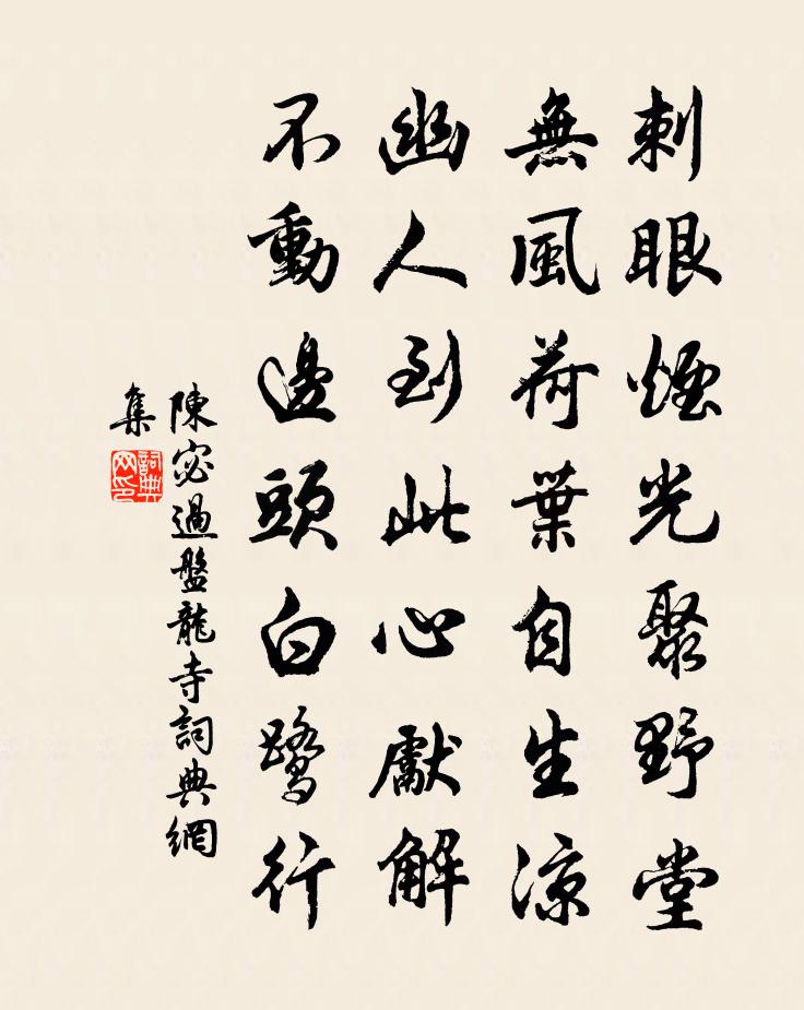 詩詞名句歷史字典書法欣賞書法字典國語詞典說文解字康熙字典古漢語字典標 題 作 者 詩 句 過盤龍寺作者:陳宓 朝代:宋代過盤龍寺原文刺眼煙光聚野堂,無風荷葉自生涼。幽人到此心先解,不動邊頭白鷺行。詩詞問答問:過盤龍寺的作者是誰?答:陳宓問:過盤龍寺寫於哪個朝代?答:宋代陳宓過盤龍寺書法欣賞過盤龍寺書法作品詩詞推薦平床嶺劉克莊〔宋代〕一動非容易,三年議始成。倩人挑旅橐,買紙劄山程。下嶺峰如拜,登崖樹若迎。暫無塵事汩,便覺長吟情。早梳頭白居易〔唐代〕夜沐早梳頭,窗明秋鏡曉。颯然握中發,一沐知一少。年事漸磋跎,世緣方繳繞。不學空門法,老病何由了?未得贈通慧大師淨務陳舜俞〔宋代〕鄱陽江頭逢道人,昔我先子游從親。口誦先子詩,別來三十春。我悲不忍聽,泫然淚沾巾。道人見我少小日,嗟我漁父/漁歌子陸游〔宋代〕鏡湖俯仰兩青天。萬頃玻璃一葉船。拈棹舞,擁蓑眠。不作天仙作水仙。讀永叔所撰薛雲衛碣梅堯臣〔宋代〕文章如塗金,光彩發美器。所宜玉石間,模寫傳千祀。堅堅孝子心,森森柏庭閟。豈與石麒麟,原傍斗蒼翠。次韻答學者四首陳師道〔宋代〕黃塵投老得何郎,準擬明年共我長。薰沐不為杯酒污,飛揚未許老夫量。入蜀·萬水千山音高駢〔唐代〕萬水千山音信希,空勞魂夢到京畿。漫天嶺上頻回首,不見虞封淚滿衣。和叔夏田舍三絕胡寅〔宋代〕尚恨山前塵土侵,去耕山後白雲深。下泉不使苞稂秀,夫子寧忘濟物心。浣谷沙曹伯啟〔元代〕世態紛紛幾變更。天南地北只虛名。一簪華發可憐生。旅食驚心三月到,浪花吹面一舟輕。中宵屈指計歸程。臥病累日羸甚偶復小健戲作陸游〔宋代〕行年當大耋,臥病涉高秋。丸藥作奇驗,俶裝仍小留。輕漚元泛泛,破屋已颼颼。尚有江湖興,沙頭問釣舟。落花詩(十二首選一)歸莊〔清代〕江南春老嘆紅稀,樹底殘英高下飛。燕蹴鶯銜何太急!溷多茵少竟安歸?闌乾曉露芳條冷,池館斜陽綠蔭肥。靜掩秋懷赤松道士貫休〔唐代〕仙觀在雲端,相思星斗寒。常憐呼鶴易,卻恨見君難。石罅青蛇濕,風榸白菌乾。終期花月下,壇上聽君彈。予讀元次山與瀼溪鄰里詩意甚愛之取其間四句陸游〔宋代〕北起成孤峰,東蟠作幽谷。中有十餘家,蘆藩映茆屋。土肥桑柘茂,雨飽麻豆熟。比鄰通有無,井稅先期足。煙中【雙調】殿前歡_春遊上花台張可久〔元代〕春遊上花台,落紅沾滿綠羅鞋。誰家庭院鞦韆外,蘭麝裙釵。我閒將笑口開,也待了芳春債,何處把新詩賣。無情寺深陳宗遠〔宋代〕寺深幽寂寂,四月似秋天。夜久聽山雨,晚來添石泉。斷岩風嘯木,疏竹鳥栖煙。鐘鼓林梢動,空堂已罷禪。和樂天閒園獨賞八韻前以蜂鶴拙句寄呈…小巧以取大咍劉禹錫〔唐代〕永日無人事,芳園任興行。陶廬樹可愛,潘宅雨新晴。傅粉琅玕節,薰香菡萏莖。榴花裙色好,桐子藥丸成。柳蠹開元寺佛缽詩皮日休〔唐代〕帝青石作綠冰姿,曾得金人手自持。拘律樹邊齋散後,提羅花下洗來時。乳麋味斷中天覺,麥麨香消大劫知。從此偈頌二百零五首釋正覺〔宋代〕孤筇長作水雲遊,底事而今嗾下休。一點破幽明歷歷,十分合體冷湫湫。暗中須透金針穴,轉處還藏玉線頭。劫外送澤化士兼簡雲門二老釋慧空〔宋代〕過了雲門更好看,前頭孤峻有姜山。三關一箭收功後,南海波斯念八還。丙戌春霧趙友直〔宋代〕忽逢陰濁氣氤氳,四顧山河盡已昏。窗外霏霏成細雨,檐端渺渺綴浮雲。朦朧咫尺人難辨,混沌東西路不分。若得名句推薦秋聲萬戶竹,寒色五陵松。李頎《望秦川》 世人解聽不解賞,長飆風中自來往。李頎《聽安萬善吹觱篥歌》 聖人之道,寬而栗,嚴而溫,柔而直,猛而仁。劉安及其門客《淮南子·汜論訓》 綺席凝塵,香閨掩霧。晏殊《踏莎行·碧海無波》 地白風色寒,雪花大如手。李白《嘲王歷陽不肯飲酒》 美人慵翦上元燈,彈淚倚瑤瑟。朱敦儒《好事近·春雨細如塵》 寂歷秋江漁火稀,起看殘月映林微。湯顯祖《江宿》 擊鼓其鏜,踴躍用兵。佚名《擊鼓》 執一者至貴也,至貴者無敵。呂不韋《呂氏春秋·覽·離俗覽》 悄無人、桐陰轉午,晚涼新浴。蘇軾《賀新郎·夏景》