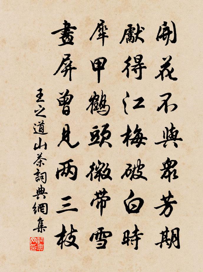 詩詞名句歷史字典書法欣賞書法字典國語詞典說文解字康熙字典古漢語字典標 題 作 者 詩 句 山茶作者:王之道 朝代:宋代山茶原文開花不與眾芳期,先得江梅破白時。犀甲鶴頭微帶雪,畫屏曾見兩三枝。詩詞問答問:山茶的作者是誰?答:王之道問:山茶寫於哪個朝代?答:宋代王之道山茶書法欣賞山茶書法作品詩詞推薦別常征君杜甫〔唐代〕兒扶猶杖策,臥病一秋強。白髮少新洗,寒衣寬總長。故人憂見及,此別淚相忘。各逐萍流轉,來書細作行。探春(西湖十詠·蘇堤春曉)陳允平〔宋代〕上苑烏啼,中洲鷺起,疏鍾才度雲窈。篆冷香篝,燈微塵幌,殘夢猶吟芳草。搔首捲簾看,認何處、六橋煙柳。翠直宿南宮三首楊萬里〔宋代〕今年秋暑更禁他,無計商量柰熱何。一霎飄蕭涼一日,雨來銷得幾多多。五色雀金君卿〔宋代〕晨氛澄霽海風調,彩絢珍禽入絳霄。聞說舜庭方作樂,可容飛舞聽簫韶。送人之官嚴陵周文璞〔宋代〕如君風貌又精神,自合拖紳近紫宸。平地有心開洞穴,十年無俸著閒身。已看青舫垂垂去,須憶緋桃灩灩春。若向魏佛狸歌蘇轍〔宋代〕魏佛狸,飲泗水,黃金甲身鐵馬箠。睥睨山川俯畫地,畫作西方佛名字。卷舒三軍如使指,賓士萬夫鑿山觜。雲中自喜白居易〔唐代〕自喜天教我少緣,家徒行計兩翩翩。身兼妻子都三口,鶴與琴書共一船。僮僕減來無冗食,資糧算外有餘錢。攜將放後遇恩不沾李白〔唐代〕天作雲與雷,霈然德澤開。東風日本至,白雉越裳來。獨棄長沙國,三年未許回。何時入宣室,更問洛陽才。賀新郎 席上聞歌有感劉克莊〔宋代〕妾出於微賤。小年時、朱弦彈絕,玉笙吹遍。粗識國風關雎亂,羞學流鶯百囀。總不涉、閨情春怨。誰向西鄰公子賀林自知兄登第胡仲弓〔宋代〕賀客來遲休怪余,新篇準備暮春初。群兒得志誠逾望,一第於君非有餘。喜脫平生場屋債,飽看太古聖賢書。由來頌古五十三首釋文禮〔宋代〕散席迢迢到海涯,點頭橈下喪全機。父南子北今何在,月冷漁歌落釣磯。菩薩蠻晁補之〔宋代〕百花含蓓東風裡。南園小雨朱扉啟。春色一年年。年年花共妍。清談招隱去。莫認如賓處。華發好風光。林間此味臞庵五首何偁〔宋代〕柳外長虹臥,江邊小市圓。水搖千嶂影,窗納五湖天。隔岸誰家圃,開帆何處船。非關台榭好,此地最堪憐。漁家傲(和孔純老三首)王之道〔宋代〕岩電晶熒君未老。看看門外鋒車到。一點眉間黃色好。人盡道。從今次第登三少。左右青娥來巧笑。注唇塗額新妝皇帝上禮撫事述懷李嶠〔唐代〕配極輝光遠,承天顧托隆。負圖濟多難,脫履歸成功。聖道昭永錫,邕言讓在躬。還推萬方重,鹹仰四門聰。恭已寄黃雲心胡仲參〔宋代〕竹屋少行跡,閉門春晝長。天時半晴濕,人意共炎涼。苔蘚侵階綠,荼醾壓架香。冥搜尋杖屨,不為看花忙。酬桂林從叔賀鑄〔宋代〕江到三湘盡,山圍八桂深。龍蛇寒下蟄,霧露晝多陰。迢遞馳梅信,殷勤訪竹林。淮南風土美,留滯亦何心。梅花方岳〔宋代〕枯梢橫出竹疏疏,挾雪吹香夢自孤。立到夜深難著語,怕渠去說與林通。碧泉九日有感胡宏〔宋代〕雲日韜光山水幽,亭亭風送雁來秋。當時祓禊千華好,今日登臨萬葉愁。刻蠟桂香環遠路,縷金蓮色亂方舟。丹青送武桓之安陽賀鑄〔宋代〕黃金絡征轡,之子待明發。樽酒少遲留,禪林見涼月。歌鬟結蛾黛,怨此佳期闊。去去柳堤風,青蟬催白髮。名句推薦鳥啼官路靜,花發毀垣空。張繼《清明日自西午橋至瓜岩村有懷》 黃河捧土尚可塞,北風雨雪恨難裁。李白《北風行》 功蓋三分國,名成八陣圖。杜甫《八陣圖》 迎天意,揣利害,不如其已。列子及其弟子《列子·力命》 為有犧牲多壯志,敢叫日月換新天。 * 《七律·到韶山》 長袖善舞,多錢善賈。韓非及後人《韓非子·五蠹》 深居俯夾城,春去夏猶清。李商隱《晚晴》 菡萏香連十頃陂,小姑貪戲採蓮遲。皇甫松《採蓮子·菡萏香蓮十頃陂》 舟覆乃見善游,馬奔乃見良御。劉安及其門客《淮南子·說林訓》 故園腸斷處,日夜柳條新。宋之問《途中寒食題黃梅臨江驛寄崔融》