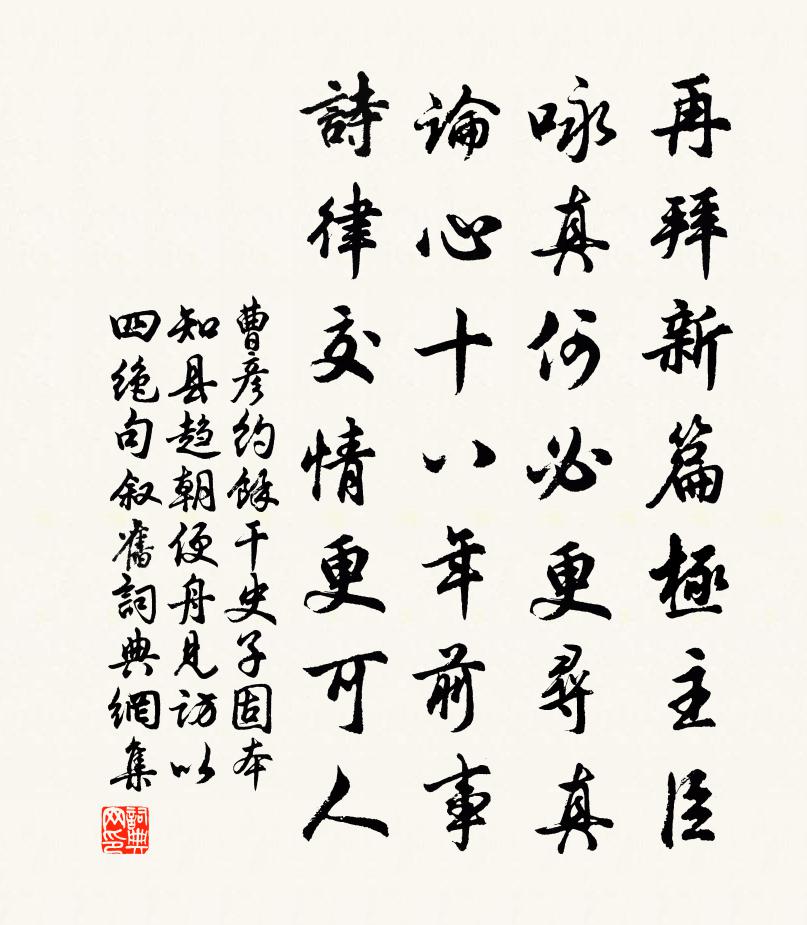 詩詞名句歷史字典書法欣賞書法字典國語詞典說文解字康熙字典古漢語字典標 題 作 者 詩 句 餘乾史子固本知縣趨朝便舟見訪以四絕句敘舊作者:曹彥約 朝代:宋代原文再拜新篇極主臣,詠真何必更尋真。論心十八年前事,詩律交情更可人。詩詞問答問:《餘乾史子固本知縣趨朝便舟見訪以四絕句敘舊》的作者是誰?答:曹彥約問:該詩寫於哪個朝代?答:宋代書法欣賞餘乾史子固本知縣趨朝便舟見訪以四絕句敘舊書法作品詩文賞析【原題】:餘乾史子固本知縣趨朝便舟見訪以四絕句敘舊次其韻詩詞推薦採石阻雨寄宣城故人二首張耒〔宋代〕風雨江頭思故人,東南煙水濕青春。宛溪東岸垂楊樹,想見煙眉亦解顰。息心顧逢〔宋代〕詩酒無窮樂,功名陌上塵。息心長壽藥,瞑目後生身。白日一回夢,青山萬古春。不知天地里,誰是悟空人。山居雜詩九十首曹勛〔宋代〕素原游匡廬,夢寐不可易。棄官竟一往,不以歸意近。屢扣清虛仙,杯酒話疇昔。永懷撥雲峰,西麈每相憶。楊和王挽章五首曹勛〔宋代〕帝謂關張勇,氣吞豺虎群。忠誠昭白日,始卒翊明君。滅沿台躔耀,哀榮鳳口墳。傳家有賢嗣,淚血入江雲。應庵和尚贊釋智遇〔宋代〕奮劈胸拳,撈摸虛空骨髓。開活入眼,瞎卻自己頂門。從芘海涌峰危,是謂東山正續。送房陵倅韋同年二首王炎〔宋代〕德齒皆兄我,曾聯淡墨名。揮犀方晤晤,浮鷁又催行。今日惟櫜矢,何人更請纓。戰塵猶未息,北望若為情。和李參政龍鶴庵廬二首魏了翁〔宋代〕古往今來一貉丘,行藏有道坎還流。鳳凰池上春風夢,龍鶴山頭夜月秋。閒曳深衣聊獨樂,有懷連璧賦三游。何人清明後一日宴客明日宗易送牡丹有詩次韻陳傅良〔宋代〕客去朝酲惡,詩來晚思和。名花如洛上,佳句近陰何。雨故妨新火,春應墮夢柯。莫將行樂地,蝸角動干戈。舊挽汪隱君陳起〔宋代〕棲志浮雲小萬鍾,帶經高壟度春風。義方莫問當年事,十五男兒識阿戎。次韻文潛瞻啟聖院旃檀像晁補之〔宋代〕至人如幻千億身,若以色觀皆世人。大千初自一漚發,變化誰能知本因。移天宮殿著人世,斷取無異陶家輪。當年浪淘沙(四之二)賀鑄〔宋代〕一十二都門。夢想能頻。無言桃李幾經春。艷粉鮮香開自落,還為何人。白紵別時新。苒苒征塵。鏡中消瘦老於真和人游嵩山十二題其五玉女窗范仲淹〔宋代〕窈窕玉女窗,想像玉女妝。皎皎月為鑑,飄飄霓作裳。莫學陽台夢,無端惑楚王。賢者之孝二百四十首蔡邕林同〔宋代〕自非易寒暑,示始解衣襟。不謂母疾久,三年惟一心。送僧歸遂州秦觀〔宋代〕寶師本巴蜀,浪跡游淮海。定水湛虛明,戒珠炯圓彩。飄零鄉縣異,晼晚星霜改。明發又西征,孤帆破煙靄。題瓜州新河餞族叔舍人賁李白〔唐代〕齊公鑿新河,萬古流不絕。豐功利生人,天地同朽滅。兩橋對雙閣,芳樹有行列。愛此如甘棠,誰雲敢攀折。吳關秋日晚出郡效張嵲〔宋代〕暝色生平野,喬林動遠風。蟲鳴古道迥,月白戍樓空。歲月悲歡異,山川今古同。荒城見搖落,未免泣途窮。遣懷釋紹嵩〔宋代〕落拓無生計,放懷使所便。托心時散帙,即事偶成篇。此道欣逢泰,平生祗信緣。殷勤伴幽獨,松亞小窗前。路舍人客居太湖東山三十年,寄此代柬顧炎武〔清代〕翡翠年深伴侶稀,清霜憔悴減毛衣。自從一上南枝宿,更不回身向北飛!題長江賈島〔唐代〕言心俱好靜,廨署落暉空。歸吏封宵鑰,行蛇入古桐。長江頻雨後,明月眾星中。若任遷人去,西溪與剡通。懷汶陽兄弟劉滄〔唐代〕回看雲嶺思茫茫,幾處關河隔汶陽。書信經年鄉國遠,弟兄無力海田荒。天高霜月砧聲苦,風滿寒林木葉黃。終日名句推薦還作一段相思,冷波葉舞愁紅,送人雙槳。吳文英《解蹀躞·醉雲又兼醒雨》 知君慣度祁連城,豈能愁見輪台月。岑參《送李副使赴磧西官軍》 梧桐雨細。漸滴作秋聲,被風驚碎。張輯《疏簾淡月·寓桂枝香秋思》 揚人惡,即是惡。疾之甚,禍且作。李毓秀《弟子規·泛愛眾》 賈傅松醪酒,秋來美更香。杜牧《送薛種游湖南》 鳥飛反故鄉兮,狐死必首丘。屈原《九章》 望斷金馬門,勞歌采樵路。孟浩然《田園作》 坐上別愁君未見,歸來欲斷無腸。蘇軾《臨江仙·送王緘》 奇卓異非至人,至人只是常。洪應明《菜根譚·概論》 人之命在天,國之命在禮荀子《荀子·強國》