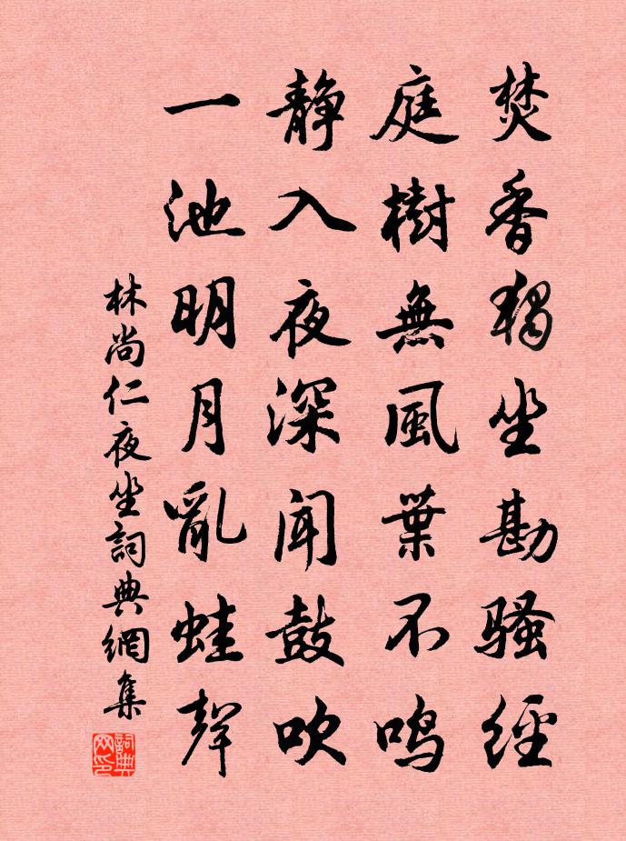 詩詞名句歷史字典書法欣賞書法字典國語詞典說文解字康熙字典古漢語字典標 題 作 者 詩 句 夜坐作者:林尚仁 朝代:宋代夜坐原文焚香獨坐勘騷經,庭樹無風葉不鳴。靜入夜深聞鼓吹,一池明月亂蛙聲。詩詞問答問:夜坐的作者是誰?答:林尚仁問:夜坐寫於哪個朝代?答:宋代林尚仁夜坐書法欣賞夜坐書法作品詩詞推薦獨立黃溍〔元代〕數盡飛花一愴然,壯心迢遞夕雲邊。十年人事空流水,二月風光已杜鵑。過眼青春寧夏得,污人黃土絕堪憐。故園效阮公詩江淹〔南北朝〕至人貴無為。裁魂守寂寥。唯有馳騖士。風塵在一朝。輿馬相跨躍。賓從共矜驕。天道好盈缺。春華故秋凋。不知明發祈門悟法寺,溪行險絕六首楊萬里〔宋代〕一泒泉從千丈崖,轟霆跳雪瀉將來。無論驚殺行人著,兩岸諸峰震欲摧。寄題吳氏社倉項安世〔宋代〕淹劇無悰易愴神,社倉新記重關心。前朝詔在恩淪骨,遺老書存淚滿襟。永念君仁多善稼,肯因師死下喬林。皇天山寺(得開字,章留後同游)杜甫〔唐代〕野寺根石壁,諸龕遍崔嵬。前佛不復辨,百身一莓苔。雖有古殿存,世尊亦塵埃。如聞龍象泣,足令信者哀。使君病中對石竹花皇甫冉〔唐代〕散點空階下,閒凝細雨中。那能久相伴,嗟爾殢秋風。偶興羅隱〔唐代〕逐隊隨行二十春,曲江池畔避車塵。如今贏得將衰老,閒看人間得意人。和崔公度家風琴八首王安石〔宋代〕屋山終日信飄飄,似與幽人破寂寥。為有機心須強聒,直教懸解始聲消。和叔夏視獲三首胡寅〔宋代〕閒客何如樂聖時,欣聞威鳳再鳴岐。且將詩筆耕堯壤,寧記書囊集漢帷。日錯碎金歸野菊,風欺危綠戰棠梨。殷勤寄空上人曹勛〔宋代〕華頂峰頭空侍者,家在全閩九峰下。後山妙香今始聞,西江一口元非假。可但枯木已陽艷,更喜淮碑仍續雅。天風寄牛相公杜牧〔唐代〕漢水橫衝蜀浪分,危樓點的拂孤雲。六年仁政謳歌去,柳遠春堤處處聞。代崔家送客李賀〔唐代〕行蓋柳煙下,馬蹄白翩翩。恐隨行處盡,何忍重揚鞭。追和子由去歲試舉人洛下所寄九首暴雨初晴樓蘇軾〔宋代〕洛邑從來天地中,嵩高蒼翠北邙紅。風流耆舊消磨盡,只有青山對病翁。頌古二十一首釋正覺〔宋代〕大眾退後,衲僧去就。豈用機關,那容體究。蓑翁老熟慣風波,橈棹不施船放溜。奉和御製讀五代漢史夏竦〔宋代〕危邦有賢哲,力戰鎮州平。革弊還疲庶,從寬悅眾情。愛人惟責己,徇節幾忘生。青史惟馨在,千年仰令名。山中陳郁〔宋代〕自入山中二十年,搞塵有道即為仙。差科難到耽閒地,種獲因無負郭田。細事亦參齊和論,大還長勘娛真篇。詩成飛石岩張先〔宋代〕石破重岩萬客疑,不堪攻玉不支機。長江風雨來無定,時學零陵燕子飛。冬夜題齋壁陸游〔宋代〕發不能勝二寸冠,天教送老向江乾。倚牆筇杖伴人瘦,縞瓦清霜爭月寒。壯志追思良可悔,危途遍曆始知難。一身次韻杜安行嘉陵春日書事十首郭印〔宋代〕公退幽齋坐,悠然對碧岑。吹香花拂拂,圍翠竹森森。蝶散紅芳歇,鶯藏綠樹深。吾心清似水,塵境勿相侵。戲題三絕蘇轍〔宋代〕懊惱嘉榮白髮年,逢人依舊唱陽關。渭城朝雨今誰聽,砑鼓跳踉一破顏。名句推薦悠悠卷旆旌,飲馬出長城。李世民《飲馬長城窟行》 君不密則失臣,臣不密則失身,幾事不密則害成。是以君子慎密而不出也。佚名《易傳·繫辭傳上·第八章》 故父母、學、君三者,莫可以為治法。墨子《墨子·04章 法儀》 巧笑東鄰女伴,採桑徑里逢迎。晏殊《破陣子·春景》 舍其所爭,取其所棄,不亦君子乎?王通《中說·卷四·事君篇》 朔方三度重陽節,河曲乾旌歲歲忙。齊之鸞《九日登清水營城》 缺月掛疏桐,漏斷人初靜。蘇軾《卜運算元·黃州定慧院寓居作》 父兮生我,母兮鞠我。佚名《蓼莪》 十月江南天氣好,可憐冬景似春華。白居易《早冬》 雁盡書難寄,愁多夢不成。沈如筠《閨怨二首·其一》