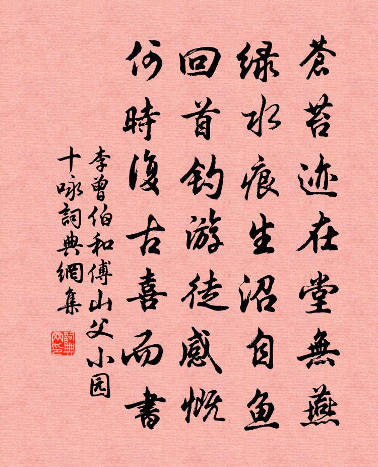 詩詞名句歷史字典書法欣賞書法字典國語詞典說文解字康熙字典古漢語字典標 題 作 者 詩 句 和傅山父小園十詠作者:李曾伯 朝代:宋代和傅山父小園十詠原文蒼苔跡在堂無燕,綠水痕生沼自魚。回首釣游徒感慨,何時復古喜而書。詩詞問答問:和傅山父小園十詠的作者是誰?答:李曾伯問:和傅山父小園十詠寫於哪個朝代?答:宋代李曾伯和傅山父小園十詠書法欣賞和傅山父小園十詠書法作品詩詞推薦奉和李大夫同呂評事太行苦熱行兼寄院中諸公仍呈王員外劉長卿〔唐代〕迢遞太行路,自古稱險惡。千騎儼欲前,群峰望如削。火雲從中出,仰視飛鳥落。汗馬臥高原,危旌倚長薄。清風金盞倒垂蓮佚名〔宋代〕依約疏林,見盈盈春意,幾點霜蕤。應是東君,試手作芳菲。粉面倚、天風微笑,是日暖、雪已晴時。人靜么鳳翩凌閣學輓詩二首周必大〔宋代〕聖上開皇極,炎興纂異書。蒼葭依玉樹,清水映污渠。自爾音塵隔,思公歲月除。佳城空在望,無路祖喪車。南鄉子(商調)周邦彥〔宋代〕晨色動妝樓。短燭熒熒悄未收。自在開簾風不定,颼颼。池面冰澌趁水流。早起怯梳頭。欲綰雲鬟又卻休。不會沈春日晁公武〔宋代〕蝸牛廬畔舫齋前,春晚風光絕可憐。雲補斷山尤秀拔,竹藏殘蕊尚嬋娟。送從子令憲西歸魏了翁〔宋代〕弘毅規摹本末周,既難分付又難酬。須知陋巷憂中樂,又識耕莘樂處憂。贈柳三解晁說之〔宋代〕海角那知有宮柳,故園春思尚依依。可憐風韻去人遠,一日花開天際飛。送人李鹹用〔唐代〕一軸煙花滿口香,諸侯相見肯相忘。未聞珪璧為人棄,莫倦江山去路長。盈耳暮蟬催別騎,數杯浮蟻咽離腸。眼前和蕭中庶直石頭詩謝朓〔南北朝〕九河亘積岨。三嵏郁旁眺。皇州總地德。回江欵岩徼。井幹赩蒼林。雲甍蔽層嶠。川霞旦上薄。山光晚余照。翔集挽周迪功二首杜范〔宋代〕憶昔痴兒幸,聯君季氏姻。兩家成契闊,一夢記酸辛。鄉譽聞君子,銘章又古人。落花愁暮雨,淒冷不成春。偈三首釋梵言〔宋代〕吾心似秋月,碧潭清皓潔。無物堪比倫,教我如何說。菩薩蠻·渚蓮紅亂風翻張孝祥〔宋代〕渚蓮紅亂風翻雨。雨翻風亂紅蓮渚。深處宿幽禽。禽幽宿處深。澹妝秋水鑒。鑒水秋妝澹。明月思情人。情人思月遼述律後謠佚名〔唐代〕青牛嫗,曾避路。送日本國聘賀使晁巨卿東歸包佶〔唐代〕上才生下國,東海是西鄰。九譯蕃君使,千年聖主臣。野情偏得禮,木性本含真。錦帆乘風轉,金裝照地新。孤城請佛閣晚望,雪山數十峰如爛銀,晁耀暑光中范成大〔宋代〕壘塊蒼然是九州,大千起滅更悠悠。雪興正照天西角,日影長浮雨上頭。峰頂何曾知六月,塵間想已別三秋。佛毫次韻鄧善之書懷七首方回〔宋代〕老懷饒感慨,無一可歡娛。久矣還初服,胡然落半途。流年蘇開雁,往事左慈鱸。莫笑腰圍減,還堪作酒壺。侍從宜春苑奉詔賦龍池柳色初青聽新鶯百囀歌李白〔唐代〕東風已綠瀛洲草,紫殿紅樓覺春好。池南柳色半青青,縈煙裊娜拂綺城。垂絲百尺掛雕楹,上有好鳥相和鳴,間關曬蓑亭趙蕃〔宋代〕冰玉溪山近與鄰,我舟來往故成頻。眼邊風物渾如舊,只欠行吟采若人。十月五日從兄四弟三侄侍太孺人賞菊亦好園以喻良能〔宋代〕霜天豁澄明,水日共清朗。西園足甘菊,歡言事幽賞。板輿奉慈顏,華發森少長。一笑喜團欒,千枝迷俯仰。黃英漢儒二首劉克莊〔宋代〕賣賦長安偶遇知,後車歸載遠山眉。可憐犬子真窮相,不見劉郎過沛時。名句推薦無數春筍滿林生,柴門密掩斷行人。杜甫《詠春筍》 汀洲采白苹,日落江南春。柳惲《江南曲》 思君如滿月,夜夜減清輝。張九齡《賦得自君之出矣》 我愛山中夏,空冥花雨下。元鵬《山中四詠》 數回細寫愁仍破,萬顆勻圓訝許同杜甫《野人送朱櫻》 屏山遮斷相思路,子規啼到無聲處。高鶚《青玉案·絲絲香篆濃於霧》 短籬殘菊一枝黃。正是亂山深處、過重陽。呂本中《南歌子·驛路侵斜月》 繡嶺宮前鶴髮翁,猶唱開元太平曲李洞《繡嶺宮詞》 鄂王墳上草離離,秋日荒涼石獸危。趙孟頫《岳鄂王墓》 和氣吹綠野,梅雨灑芳田。李世民《詠雨》