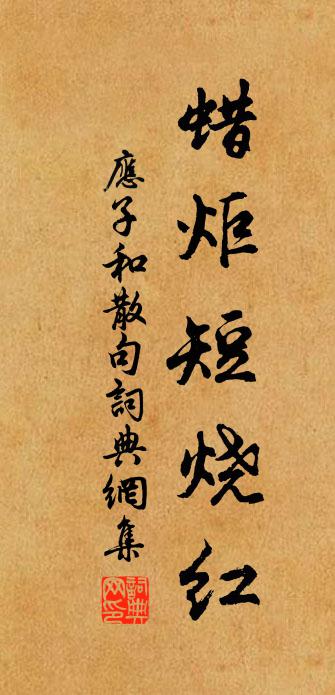 詩詞名句歷史字典書法欣賞書法字典國語詞典說文解字康熙字典古漢語字典標 題 作 者 詩 句 句作者:應子和 朝代:宋代句原文蠟炬短燒紅。詩詞問答問:句的作者是誰?答:應子和問:句寫於哪個朝代?答:宋代應子和句書法欣賞句書法作品詩詞推薦句李子遷〔宋代〕石鼎夜聯詩筆健,布囊春醉酒錢粗。答贈劉交代二首洪咨夔〔宋代〕危棧摩千仞,牢關護一窩。山巔閒地步,溪面白雲多。晝永琴書樂,年豐鼓角和。官清誰得似,祗欠客經過。郭熙秋山平遠二首蘇軾〔宋代〕目盡孤鴻落照邊,遙知風雨不同川。此間有句無人見,送與襄陽孟浩然。木落騷人已怨秋,不堪平遠發詩愁。要看次韻次尹俊卿梅花絕句王灼〔宋代〕飯顆從嘲瘦,湘流獨占清。失身到東閣,聊復對簪纓。青玉案·春寒惻惻春陰顧德輝〔宋代〕春寒惻惻春陰薄。整半月,春蕭索。晴日朝來升屋角。樹頭幽鳥,對調新語,語罷雙飛卻。紅入花腮青入萼。盡不送壽州陳錄事韓翃〔唐代〕壽陽南渡口,斂笏見諸侯。五兩楚雲暮,千家淮水秋。開簾對芳草,送客上春洲。請問山中桂,王孫幾度游。春日田園雜興九山人〔宋代〕軒裳一夢斷齋環,桑柘陰陰靜掩閏。種秫已非彭澤縣,採薇何必首陽山。因耿社鼓剛催老,轉覺儒冠不負閒。君看和趙尚書無辯詩吳泳〔宋代〕猘犬吠漢月,黃雲塞江天。江淮我家門,守地何擇焉。婦嘗勸減灶,苦口為母言。早使言得行,家門更安全。短歌行李白〔唐代〕白日何短短,百年苦易滿。蒼穹浩茫茫,萬劫太極長。 * 垂兩鬢,一半已成霜。天公見玉女,大笑億千場。吾欲送人歸鄉尚顏〔唐代〕多才與命違,末路憶柴扉。白髮何人問,青山一劍歸。晴煙獨鳥沒,野渡亂花飛。寂寞長亭外,依然空落暉。友龍侄來別留詩次韻毛滂〔宋代〕樵青煎茶青竹里,汝欲過門鵲先喜。我家千里凌風駒,豈比虺聵鞭不起。我亦西遊倦始歸,久闊相望老白眉。歸家次韻定慧欽長老見寄八首蘇軾〔宋代〕淨名毗耶中,妙喜恆沙外。初無來往相,二土同一在。云何定慧師,尚欠行腳債。請判維摩憑,一到東坡界。宿疏山釋紹嵩〔宋代〕竹輿穿雨上疏山,寒涕重頤獨掩關。病客欲眠渾不寐,白猿啼在白雲間。梁三朝雅樂歌 寅雅沈約〔南北朝〕禮莫違。樂具舉。延藩辟。朝帝所。執桓蒲。列齊莒。垂袞毳。紛容與。升有儀。降有序。齊簪紱。忘笑語。始矜賀新郎 壽李西隱館於李氏洪希文〔元代〕今日知何日。聽瑤池、西來青鳥,密傳訊息。阿母臨行宣曼倩,留取蟠花休吃。因則甚、鸞驂未出。約待西方無量山居雜詩九十首曹勛〔宋代〕小隱世味薄,花飛慘殘春。明玉剝楚筍,嫩紫庖吳蓴。不覺盤箸闕,但喜志意新。我惟一廛足,何必問大鈞。三月二十一日泛舟十絕劉克莊〔宋代〕弟兄玉映更珠聯,豈減玄暉與惠連。卻笑漠人無具眼,羨它李郭作神仙。尤生說字王洋〔宋代〕正名百物與神謀,禍福無門亦自求。君獨何心分象數,筆端無復見生牛。探心取意陳前修,一字或可談封侯。逆知浣溪沙方千里〔宋代〕密約深期卒未成。藏鉤春酒坐頻傾。向人嬌艷夜亭亭。相顧無言情易覺,歸來單枕夢猶驚。眼梢怨淚幾時晴。送三八弟歸九江王遂〔宋代〕陸侯與鄒令,善政時所尊。為我謝契闊,寄言托諸昆。送子華陽道,迤邐白下門。懷言欲贈別,臨別又忘言。名句推薦我亦飄零久!顧貞觀《金縷曲二首》 亭皋木葉下,隴首秋雲飛柳惲《搗衣詩》 逞奸謀事,事難必其穩重,可惜他徒自壞心。王永彬《圍爐夜話·第五一則》 木謂之華,草謂之榮。佚名《爾雅·釋草》 灼灼野花香,依依金柳黃。佚名《菩薩蠻·霏霏點點回塘雨》 山暝聞猿愁,滄江急夜流。孟浩然《宿桐廬江寄廣陵舊遊》 空對著,山中高士晶瑩雪曹雪芹《終身誤》 松雪飄寒,嶺雲吹凍,紅破數椒春淺。周密《獻仙音·吊雪香亭梅》 西湖到日,重見梅鈿皺。吳文英《瑞龍吟·送梅津》 繡嶺宮前鶴髮翁,猶唱開元太平曲李洞《繡嶺宮詞》