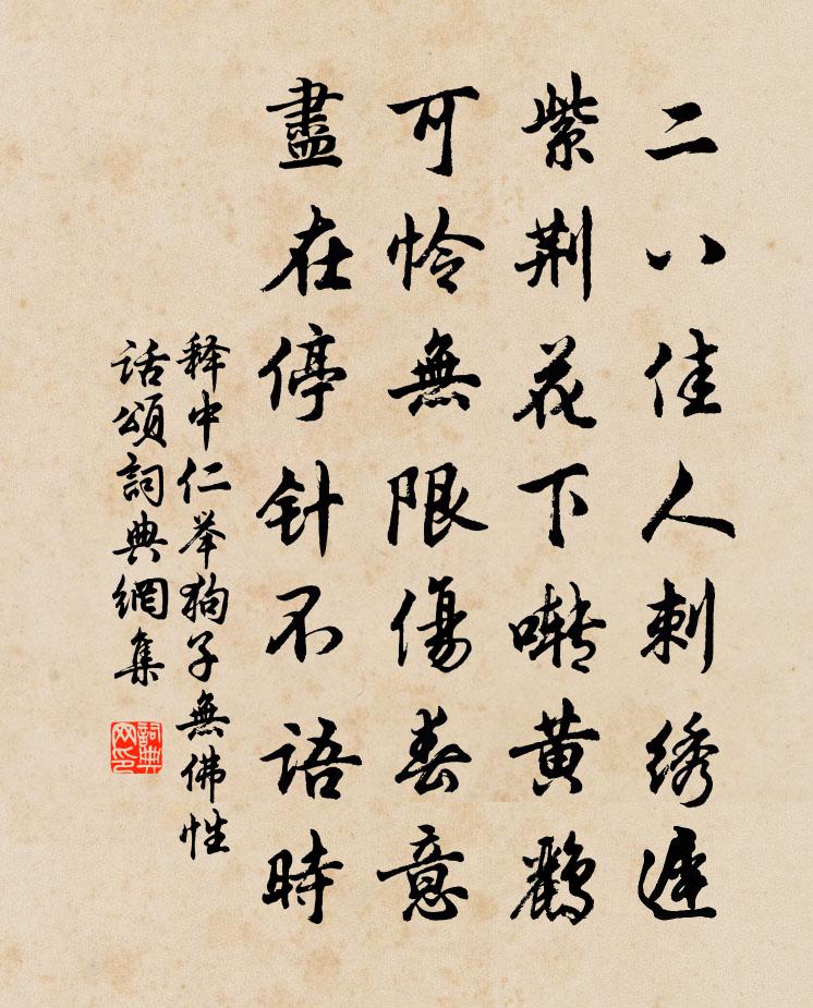 詩詞名句歷史字典書法欣賞書法字典國語詞典說文解字康熙字典古漢語字典標 題 作 者 詩 句 舉狗子無佛性話頌作者:釋中仁 朝代:宋代舉狗子無佛性話頌原文二八佳人刺繡遲,紫荊花下囀黃鸝。可憐無限傷春意,盡在停針不語時。詩詞問答問:舉狗子無佛性話頌的作者是誰?答:釋中仁問:舉狗子無佛性話頌寫於哪個朝代?答:宋代釋中仁舉狗子無佛性話頌書法欣賞舉狗子無佛性話頌書法作品詩詞推薦南歌子陳克〔宋代〕獻鯉榮今日,憑熊瑞此邦。年年壽酒樂城隍。共道使君椿樹、似甘棠。歌舞重城曉,從容燕席涼。不須蘇合與都梁朝中措(壽十八兄)韓元吉〔宋代〕清霜著柳夜來寒。新月印湖山。共喜今年稱壽,一尊還在長安。人間千載,從教鶴髮,且駐朱顏。看取煙霄平步,春暮戴復古〔宋代〕捻指過三月,又當春夏交。花殘蜂課蜜,林茂鳥營巢。芳草生青靄,新篁長綠梢。風騷將斷絕,誰有續弦膠。傳言玉女(許永之以水仙、瑞香、黃香梅、幽蘭同坐,名生四和,即席賦此)楊無咎〔宋代〕小院春長,整整繡簾低軸。異葩幽艷,滿千瓶百斛。珠鈿翠佩,塵襪錦籠環簇。日烘風和,奈何芬馥。鳳髓龍津,捲簾舒邦佐〔宋代〕隔簾見竹早清幽,捲起疏簾滿眼秋。一搭夕陽收不得,被人都送上簾鉤。題或尼院壁蕭澥〔宋代〕剪剪香雲以影寒,更無紅粉舊時痕。只因曾悟桃花偈,閒卻春風夢幾番。留守相公移鎮漢東歐陽修〔宋代〕周郊徹楚垧,舊相擁新旌。路識青山在,人今白首行。問農穿稻野,候節見梅英。腰組人稀識,偏應邸吏驚。贈吳道士白玉蟾〔宋代〕延陵大士詩中虎,接武黃陳肩李杜。無鹽爭取陋西施,也向雷門聲布鼓。宿蒲關東店,憶杜陵別業岑參〔唐代〕關門鎖歸客,一夜夢還家。月落河上曉,遙聞秦樹鴉。長安二月歸正好,杜陵樹邊純是花。清平樂張樞〔宋代〕鳳樓人獨。飛盡羅心燭。夢繞屏山三十六。依約水西雲北。曉奩懶試脂鉛。一紂鸞髻微偏。留得宿妝眉在,要教知燈夕寄獻內翰虢略公劉筠〔宋代〕千輪佛火照層城,九陌香車擊迅霆。簡子最知天帝樂,孟家惟信紫姑靈。金徒抱箭催壺水,玉字來風滿砌蓂。簾卷用晦翁十梅詩韻酬張伯修孫子直吳泳〔宋代〕書消燕日長,棋遣花院寂。何羨山中人,餐霞拾橡實。袁州北崇勝寺二首趙蕃〔宋代〕病中曾覓扊扅炊,別後東西無自知。似說諸侯枉行卷,卻從群彥赴明時。相如定辱君王問,鄭老寧容爾汝期。幾欲求酒於邵元實刪定袁說友〔宋代〕骨相酸寒不足論,平生心賞舊家村。七年誤索長安米,百病幾成楚客魂。命薄不堪嗟分定,官閒猶得荷君恩。秋風門箴盧仝〔唐代〕貪殘奸酗,狡佞訐愎,身之八殺。背惠,恃己,狎不肖,妒賢能,命之四孽。有是有此予敢辭,無是無此予之師,思歸二絕句項安世〔宋代〕艾葉翻翻白,榴花疊疊紅。年華驚客枕,心事逐郵筒。詩一首韓退〔宋代〕山人跨雪精,上便不論程。嗅地打不動,笑天休始行。和峽州趙教授春後雪中惠酒陽枋〔宋代〕多君不許利台驅,官冷瓢空日自娛。猶有小槽春夜滴,呼僮踏雪遺紅珠。風入松皎然〔唐代〕西嶺松聲落日秋,千枝萬葉風飀飀。美人援琴弄成曲,寫得松間聲斷續。聲斷續,清我魂。流波壞陵安足論,美人丙午歲與府中諸君重遊張氏園慨然成詩強至〔宋代〕醉書曾記並遊人,今日重遊墨尚新。對酒年來驚白髮,惜花時複數青春。四方散落幾交臂,萬事參差一病身。傍水名句推薦艷歌餘響,繞雲縈水蘇軾《水龍吟·黃州夢過棲霞樓》 閒來無事不從容,睡覺東窗日已紅。程顥《秋日》 誰見汀洲上,相思愁白蘋。劉長卿《餞別王十一南遊》 日暖泥融雪半消,行人芳草馬聲驕。杜牧《宣州送裴坦判官往舒州時牧欲赴官歸京》 醉月頻中聖,迷花不事君李白《贈孟浩然》 歲歲金河復玉關,朝朝馬策與刀環。柳中庸《征人怨 / 征怨》 何當金絡腦,快走踏清秋。李賀《馬詩二十三首》 飛絮濛濛。垂柳闌乾盡日風。歐陽修《採桑子·群芳過後西湖好》 水光瀲灩晴方好,山色空濛雨亦奇。蘇軾《飲湖上初晴後雨二首·其二》 傷心闊別三千里,屈指思量四五年。韓偓《寒食日重遊李氏園亭有懷》