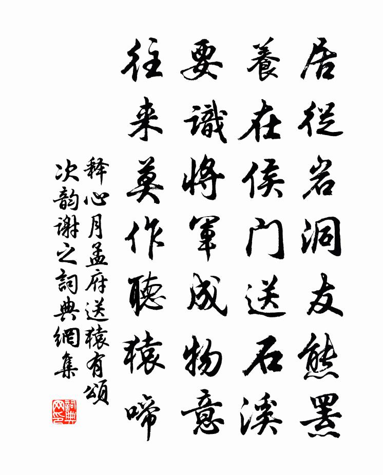 詩詞名句歷史字典書法欣賞書法字典國語詞典說文解字康熙字典古漢語字典標 題 作 者 詩 句 孟府送猿有頌次韻謝之作者:釋心月 朝代:宋代孟府送猿有頌次韻謝之原文居從岩洞友熊羆,養在侯門送石溪。要識將軍成物意,往來莫作聽猿啼。詩詞問答問:孟府送猿有頌次韻謝之的作者是誰?答:釋心月問:孟府送猿有頌次韻謝之寫於哪個朝代?答:宋代釋心月孟府送猿有頌次韻謝之書法欣賞孟府送猿有頌次韻謝之書法作品詩詞推薦贈張漢卿汪莘〔宋代〕相伴留侯訪赤松,碧桃花下醉融融。玉龍嘶罷還家晚,月出蓬萊第一峰。好事近趙長卿〔宋代〕江上一江樓,樓上遠山橫翠。還更腰金騎鶴,引竹西歌吹。壽君春酒遣雙壺,滿引見深意。肯向龜荷香里,喚儂來再作十絕寄胡伯負兵侍仲方尚書李元實〔宋代〕東西兩浙及閩川,皆見鴛行有直言。若我江 * 鉗口,澹翁九地也埋冤。游洞霄宮韓松〔宋代〕玄冥相我作山行,卷卻重陰放曉晴。但見峰巒互扃鎖,不見宮闕隱崢嶸。雲根洞穴篝燈入,井底波瀾撫掌生。喚客途中雜題六首趙蕃〔宋代〕樹合猿啼遠,崖荒虎跡新。尋常慣居者,辛苦恐行人。晏成續太祝遺雙井茶五品茶具四枚近詩六十篇梅堯臣〔宋代〕始於歐陽永叔席,乃識雙井絕品茶。次逢江東許子春,又出鷹爪與露芽。鷹爪斷之中有光,蹍成雪色浮乳花。晏公玉爐三澗雪 勤勞丘處機〔元代〕物外雖明端的,天心未放玲瓏。區區陌上走西東。也學浮生作夢。夢寐更勞數載,岩龕復度三冬。待佗訊息顯真功臨江仙辛棄疾〔宋代〕鍾鼎山林都是夢,人間榮辱休驚。只消閒處過平生。酒杯秋吸露,詩句夜裁冰。記取小窗風雨夜,對床燈火多情。南江酒家樓鑰〔宋代〕南江舟檝飽經行,橋外人家最可人。賸種寒杉映修竹,快沽村酒趁鮮鱗。潮痕落草櫓聲動,日腳銜山涼意新。酷愛賀新郎張輯〔宋代〕鵲喜花間曉。惜凝香、低將簾卷,海棠開早。前度登樓清嘯月,吹入春風不老。後五日、花朝方到。趁舞羅衣花訊送黎主簿釋紹嵩〔宋代〕及瓜一笑上浮艎,孤淡無君得趣長。秋月春花入牙頰,錦機繡段出肝腸。詩題寺壁雲根潤,江送蓬婆雪汗香。丞相飲牡丹高斯得〔宋代〕尚記年時醉我賓,抽簪起舞坐生春。誰呼七七逡巡手,重視三三夢幻身。獨樂園中老居士,沉香亭北謫仙人。吾今柘枝舞史浩〔宋代〕回頭卻望塵寰去。喧畫堂簫鼓。整雲鬟、搖曳青綃,愛一曲柘枝舞。好趁華封盛祝笑,共指南山煙霧。蟠桃仙酒醉題晚照樓陳著〔宋代〕乳峰天下景,清景此尤多。檐影夕陽樹,簾香新水荷。虛通雲入室,平送鶴歸窠。高坐清涼境,人閒自沸鍋。春日即事九首李廌〔宋代〕毛桃猶帶蕊,青杏已團枝。老不禁春惱,應知老易欺。次韻吳山甫陳著〔宋代〕誰敲拄杖碧溪灣,得見霞城老則山。對面相驚風鑒舊,論心不放雨鐙閒。浮生夢蟻淒涼外,春事啼鵑遠近間。幸有送高舍人使嶺南徐鉉〔唐代〕西掖官曹近,南溟道路遙。使星將渡漢,仙棹乍乘潮。柳映靈和折,梅依大庾飄。江帆風淅淅,山館雨蕭蕭。陸賈贈聞人必大釋紹嵩〔宋代〕長日林皋獨醉吟,久貧如得顧家金。屬文想見翻新樣,執卷猶聞惜寸陰。世上紛紛蠻與觸,胸中歷歷古兼今。有時泉上人畫牡丹強至〔宋代〕芳樹不合生深堂,座上似已聞生香。乃知丹青逼造化,獨有真假爭毫芒。枝外霏微包雨露,筆跡淋漓濕縑素。游蜂又和梅雨楊萬里〔宋代〕管得天公雨更晴,何關客子病心情。得歸此意良不惡,且住微軀也自輕。名句推薦滄海月明珠有淚,藍田日暖玉生煙。李商隱《錦瑟》 生而不有,為而不恃,功成而弗居。夫唯弗居,是以不去。老子《老子·道經·第二章》 東風吹水日銜山,春來長是閒。李煜《阮郎歸·呈鄭王十二弟》 江南自是離愁苦,況游驄古道,歸雁平沙。王沂孫《高陽台·和周草窗寄越中諸友韻》 一雙舞燕,萬點飛花,滿地斜陽。陳子龍《訴衷情·春遊》 歸來報名主,恢復舊神州。岳飛《送紫岩張先生北伐》 時不可再,機不可失魏徵《隋書·列傳·卷三》 年年躍馬長安市。客舍似家家似寄。劉克莊《玉樓春·戲林推》 黃鶯百舌正相呼,玉樹後庭花帶雨。牛殳《琵琶行》 不管煙波與風雨,載將離恨過江南。鄭文寶《柳枝詞》