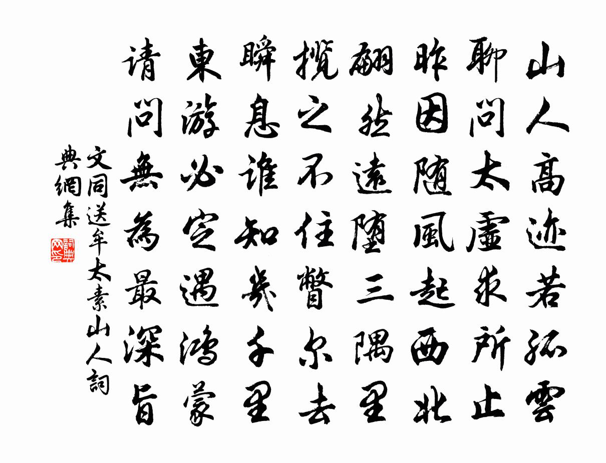 詩詞名句歷史字典書法欣賞書法字典國語詞典說文解字康熙字典古漢語字典標 題 作 者 詩 句 送牟太素山人作者:文同 朝代:宋代送牟太素山人原文山人高跡若孤雲,聊問太虛求所止。昨因隨風起西北,翩然遠墮三隅里。攬之不住瞥爾去,瞬息誰知幾千里。東遊必定遇鴻蒙,請問無為最深旨。詩詞問答問:送牟太素山人的作者是誰?答:文同問:送牟太素山人寫於哪個朝代?答:宋代文同送牟太素山人書法欣賞送牟太素山人書法作品詩詞推薦清音王威〔宋代〕白雲深處有清音,上接祥光古木森。不但濯纓兼濯足,直須一洗利名心。鎖宿余半月得讀書喜而有賦程公許〔宋代〕薰風鎖重棘,補被去何勇。私我幾日間,此意千金重。杜子野主簿約客賦一詩為贈與仆一聯雲生就石戴復古〔宋代〕杜陵之後有孫耒,自守詩家法度嚴。秀骨可仙官況薄,高情追古俗人嫌。起看星斗夜推枕,為愛江山寒捲簾。飽吃天津橋南山中各題一句李益〔唐代〕野坐分苔席,[李益]山行繞菊叢。[韋執中]雲衣惹不破,[諸葛覺]秋色望來空。[賈島]陸山人畫水方乾〔唐代〕毫末用功成一水,水源山脈固難尋。逡巡便可見波浪,咫尺不能知淺深。但有片雲生海口,終無明月在潭心。我來寄王祥季昆翟龕〔宋代〕右軍孫子總奇才,一別俄驚秋又來。冠佩正宜朝鳳闕,釣竿未許老鰲台。雲昏野寺疏鍾斷,潮落寒汀野鶴回。咫尺臥龍山程師孟〔宋代〕聞說林泉便訪尋,平田一逕上孤岑。榕陰落處宜千客,荔子生時直萬金。盡放遲回官舍近,不妨閒坐石門深。四邊次韻烹茶四首傅察〔宋代〕仰望群公若會仙,貪論茗飲未安眠。冥搜往往游塵外,得句時時在枕前。夜漏哎吟清徹骨,晴窗揮染淨無煙。中秋醉落魄(自壽)葉秀髮〔宋代〕胸襟灑落。光風霽月澄寥廓。生平素志惟丘壑。隨分田園,花木四時樂。兒孫不用千金橐。吾家自有詩書粕。生朝代門生作立春書門貼子詩四首范成大〔宋代〕日朋添收帙,湖山引杖藜。剩周花甲子,多醉玉東西。挽趙浪淳三首陳存〔唐代〕慷慨君酬國,奔逃我喪家。陸沈同一壑,淵涉眇無涯。祈死惟嫌晚,餘生只自嗟。蒿萊連雉堞,落日噪棲鴉。夜步陸游〔宋代〕市人莫笑雪蒙頭,北陌南阡信腳游。風遞鐘聲雲外寺,水搖燈影酒家樓。鶴歸遼海逾千歲,楓落吳江又一秋。卻掩舟還浯溪再留二絕留筠〔宋代〕為愛浯溪風景幽,重臨釣石系歸舟。不妨細讀豐碑下,墨本空看幾白頭。送高湘及第後東歸覲叔劉得仁〔唐代〕此去幾般榮,登科鼎足名。無慚入南巷,高價聳東京。窗對嵩山碧,庭來洛水聲。門前桃李樹,一徑已陰成。送久禪德歸蘭亭釋重顯〔宋代〕右軍墨池月,照我復照誰。千里忽相到,中峰多病師。三月晦日偶題秦觀〔宋代〕節物相催各自新,痴心兒女挽留春。芳菲歇去何須恨,夏木陰陰正可人。扇子詩李石〔宋代〕竹影千林一族,此中孝子門家。釋老曾經抱送,詩書便是生涯。清聽堂白玉蟾〔宋代〕白龍過澗玉琮琤,澗外松聲擊戛鳴。煙鎖檐牙春二月,月移簾額夜三更。琴彈白雪陽春調,曲轉高山流水聲。清聽雙井茶送子瞻黃庭堅〔宋代〕人間風日不到處,天上玉堂森寶書。想見東坡舊居士,揮毫百斛瀉明珠。我家江南摘雲腴,落磑霏霏雪不如。為君觀潮王琮〔宋代〕旗彩斜飛一命輕,舟人卻立萬舟迎。不應當日將軍事,猶到如今氣未平。名句推薦好事不出門,壞事傳千里。佚名《增廣賢文·上集》 夜喧山門店,獨宿不安席。韋應物《聽嘉陵江水聲寄深上人》 玉樓深鎖薄情種。清夜悠悠誰共。秦觀《桃源憶故人·玉樓深鎖薄情種》 而天下皆曰其力也,必不能曰我見命焉。墨子《墨子·36章 非命(中)》 明月青山夜,高天白露秋。李嶠《同賦山居七夕》 人生到處知何似,應似飛鴻踏雪泥。蘇軾《和子由澠池懷舊》 人情已厭南中苦,鴻雁那從北地來。王勃《蜀中九日 / 九日登高》 燕子飛時,綠水人家繞。蘇軾《蝶戀花·春景》 被冷香消新夢覺,不許愁人不起李清照《念奴嬌·春情》 渡江天馬南來,幾人真是經綸手。辛棄疾《水龍吟·甲辰歲壽韓南澗尚書》