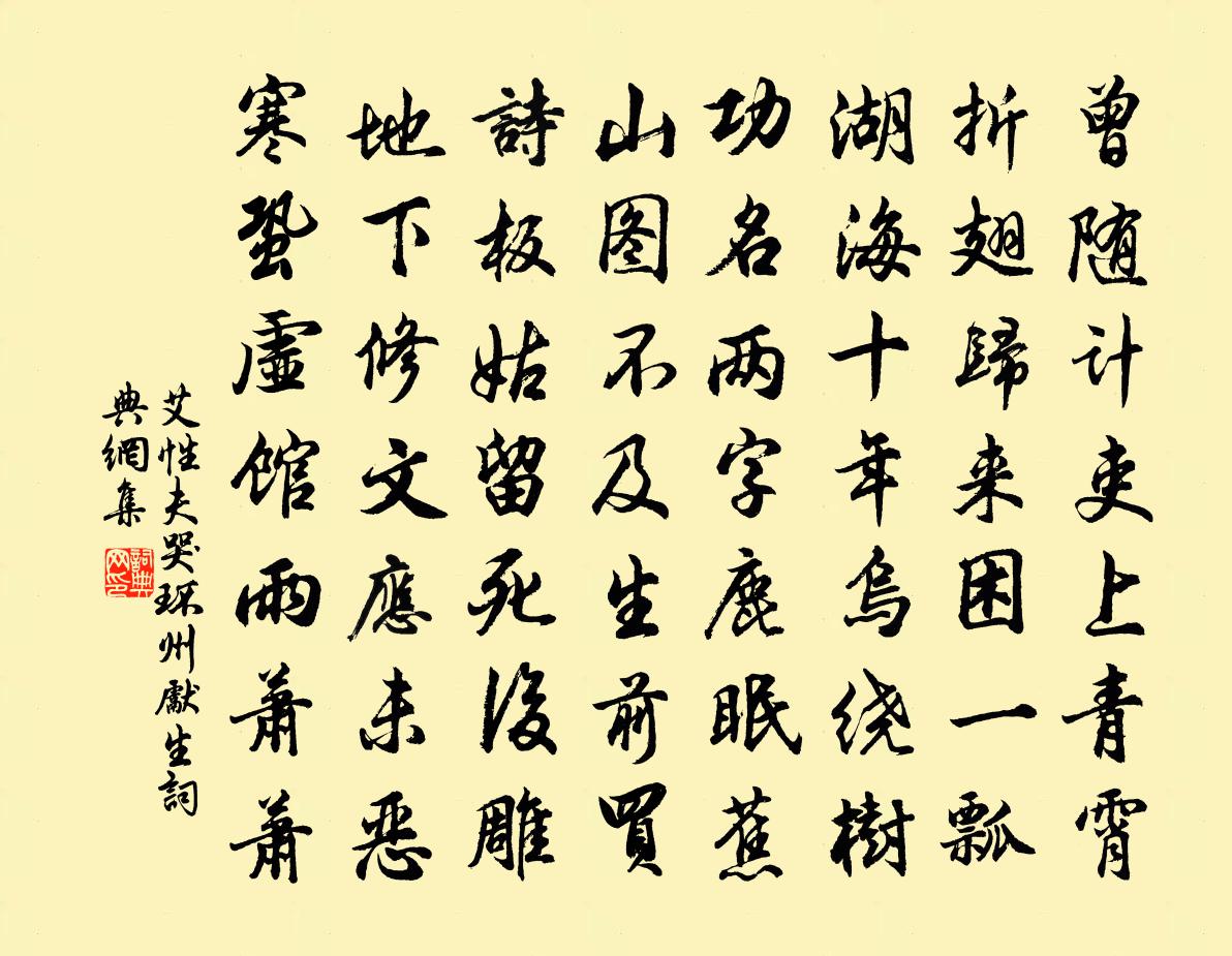 詩詞名句歷史字典書法欣賞書法字典國語詞典說文解字康熙字典古漢語字典標 題 作 者 詩 句 哭環州先生作者:艾性夫 朝代:宋代哭環州先生原文曾隨計吏上青霄,折翅歸來困一瓢。湖海十年烏繞樹,功名兩字鹿眠蕉。山圖不及生前買,詩板姑留死後雕。地下修文應未惡,寒蛩虛館雨蕭蕭。詩詞問答問:哭環州先生的作者是誰?答:艾性夫問:哭環州先生寫於哪個朝代?答:宋代問:哭環州先生是什麼體裁?答:七律艾性夫哭環州先生書法欣賞哭環州先生書法作品詩詞推薦秋日漫興二首洪邁〔宋代〕一夕西風木葉飛,畫梁落月淡餘輝。銀燈夜照還家夢,金剪親裁寄遠衣。霜信早隨新雁至,素書深訝故人稀。無因三用韻奉酬楊公遠〔宋代〕不是騷人不是農,筆耕墨耒原年豐。有時啜罷盧仝茗,羽羽能生兩腋風。竹章雲心〔宋代〕萬朵奇雲繞屋飛,雲心修竹綠猗猗。孤高不為風霜折,正直只應天地知。四海久無龍化處,千年幾具雁來時。晉林浣溪沙(春暮)趙長卿〔宋代〕柳老拋綿春已深。袷衣初試曉寒輕。別離無奈此時情。先自愁懷容易感,不堪聞底子規聲。西樓料得數回程。詠史下何曾陳普〔宋代〕家國兒曹付五胡,奉身恨不及齊奴。君王但說平生事,政為諸公昧遠圖。梅僊塢小飲陸游〔宋代〕綠樹陰陰小嶺西,一翁二子自扶攜。雨前芳嫩初浮碗,臘腳清醇旋拆泥。本欲省緣行買餅,未能去殺尚烹雞。弄橈過含山郵亭和子厚弟壁間韻三首王之道〔宋代〕犯暑籃輿趁曉耕,東風迎面葛衣輕。過山繚繞湖邊路,楊柳陰中帶月行。東方未明佚名〔先秦〕東方未明,顛倒衣裳。顛之倒之,自公召之。東方未晞,顛倒裳衣。倒之顛之,自公令之。折柳樊圃,狂夫瞿瞿。和邠老郎官湖懷古五首賀鑄〔宋代〕白也遭時網,臨年放夜郎。何妨去物遠,當道橫豺狼。絕句佚名〔宋代〕傳聞天子訪沈淪,萬里懷書西入秦。早知不用無媒客,恨別江南楊柳春。醉吟酒肆布衣〔唐代〕陽春時節天氣和,萬物芳盛人如何。素秋時節天地肅,榮秀叢林立衰促。有同人世當少年,壯心儀貌皆儼然。一旦再賦典半宅方回〔宋代〕屋以多為貴,思之亦太愚。燈膏徒重費,庖膳卒難呼。榻外知何用,杯中不可無。質錢分客住,得醉且頻沽。感皇恩程大昌〔宋代〕此之心聲,比夢又差有實也變化屬朝班,鯤鵬相併。健翼垂雲風用壯。扶搖得勢,不藉仙人仙杖。旁觀生意氣,猶酒黃庭堅〔宋代〕江形圜似阮家盆,山勢岑如北海樽。戶有浮蛆春盎盎,雙松一路醉鄉門。蝶戀花(自東江乘晴過蟆頤渚園小飲)程垓〔宋代〕晴帶溪光春自媚。繞翠縈青,來約東風醉。雲補斷山疏復綴。雨回綠野清還麗。拄杖不妨舒客意。臨水人家,問有次韻張子野秋中久雨晚晴王安石〔宋代〕天沉四山黑,池漲百泉黃。苦濕欲千里,願晴非一鄉。埽除供晚色,洗刷放秋光。菊泣花猶重,粳肥穗稍長。積陰送于丹方乾〔唐代〕至業是至寶,莫過心自知。時情如甚暢,天道即無私。入洛霜霰苦,離家蘭菊衰。焚舟不回顧,薄暮又何之。寄金山良書記章甫〔宋代〕不向金山作主人,春江鷗鳥定相親。憑君與問寒岩樹,今見桃花幾度新。代宗引諺佚名〔唐代〕不痴不聾,不作阿家阿翁。偈頌一百零九首釋可湘〔宋代〕無門之門面得門而入,無意之意須得意而通。一扇西兮一扇東。名句推薦聖人不貴尺之壁,而重寸之陰劉安及其門客《淮南子·原道訓》 當時相候赤欄橋,今日獨尋黃葉路。周邦彥《玉樓春·桃溪不作從容住》 使君宏放,談笑洗盡古今愁。陸游《水調歌頭·多景樓》 妾身獨自眠,月圓人未圓。王元鼎《憑欄人·閨怨》 生前心已碎,死後性空靈。曹雪芹《紅樓夢·第五回》 世有伯樂,然後有千里馬。千里馬常有,而伯樂不常有。韓愈《雜說四·馬說》 波瀾誓不起,妾心古井水。孟郊《列女操 / 烈女操》 過眼年華,動人幽意,相逢幾番春換。王沂孫《法曲獻仙音·聚景亭梅次草窗韻》 落魄江南載酒行,楚腰纖細掌中輕。杜牧《遣懷》 楊柳東風樹,青青夾御河。王之渙《送別》