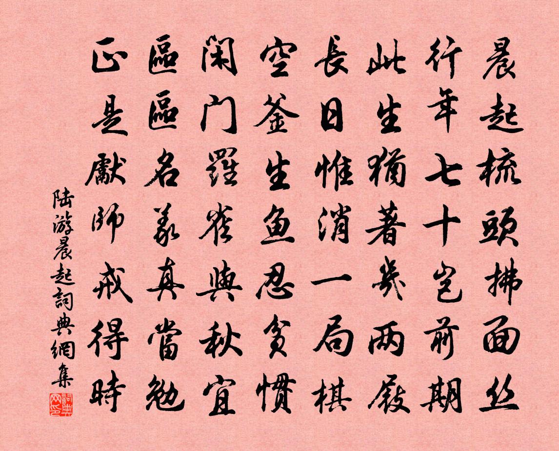 詩詞名句歷史字典書法欣賞書法字典國語詞典說文解字康熙字典古漢語字典標 題 作 者 詩 句 晨起作者:陸游 朝代:宋代晨起原文晨起梳頭拂面絲,行年七十豈前期。此生猶著幾兩屐?長日惟消一局棋。空釜生魚忍貧慣,閒門羅雀與秋宜。區區名義真當勉,正是先師戒得時。詩詞問答問:晨起的作者是誰?答:陸游問:晨起寫於哪個朝代?答:宋代問:陸游的名句有哪些?答:陸游名句大全陸游晨起書法欣賞晨起書法作品詩詞推薦羅漢石曾季貍〔宋代〕吾聞大幻師,種種示方便。雖於土石中,神力亦周遍。君看此翠琅,乃有羅漢面。殷勤作禮相,形質皆可辨。初觀頌證道歌證道歌釋印肅〔宋代〕河沙諸佛體皆同,如今端坐大雄峰。森羅萬象無藏隱,元來只在一塵中。送從善雲遊薛師石〔宋代〕雁盪天台去,閒尋倚杖藤。路邊應得句,禪坐似無能。頂笠偏愁雪,山猿不畏僧。儻逢清塞伴,休原入傳燈。早春北亭見城隅荒寂宋庠〔宋代〕荒城樓堞少,野色偏高低。蔓草無名綠,幽禽取意啼。天形岡樹北,日腳嶺雲西。不覺凝笳動,春風引夕鼙。偶憩吳則禮〔宋代〕系馬後河川。可人冬景妍。要看花到晚,付與水浮天。未覺隨戎馬,端來喚酒船。誰雲是關塞,勝事總堪傳。登崇陽縣北鋒亭張詠〔宋代〕高榭臨公宅,憑軒萬木秋。亂雲橫島嶼,鳴雁下汀州。到此欲長醉,何門銷舊愁。若為陶靖節,容易賦歸休。送王七錄事赴虢州岑參〔唐代〕早歲即相知,嗟君最後時。青雲仍未達,白髮欲成絲。小店關門樹,長河華岳祠。弘農人吏待,莫使馬行遲。建溪精捨得本字戴表元〔宋代〕四山翛翛風日暖,白髮看花惜春晚。當時衰草牧羊坡,今日池台紅霧滿。最鄰幽篁手所植,兒戲成業亦千本。舊遊一翦梅(醉中)韓淲〔宋代〕醉倒城中不過溪。溪外無塵,惟掩柴扉。水浮橋漾翠煙霏。一片閒情,能幾人知。留飲君家絮帽敧。爆竹聲中,萬和澄齋劉制乾過蕪湖渭陽宅有感韻張榘〔宋代〕興言陟屺駐征艎,丘水依然亦故鄉。萱草夢寒詩思遠,梅花月冷角聲長。暫辭小隱從三聘,況值清時已一陽。朝籍對雪易祓妻〔宋代〕紛紛瑞雪壓山河,特出新奇和郢歌。樂道幽人方閉戶,高歌漁父正披蓑。自嗟老景光陰速,誰使佳時感愴多。更念朴上人訪筠翁於溪草堂袖詩贈雨中告別將有雁李彌遜〔宋代〕一壑悠然聽雨眠,君來著語破雲煙。肯隨鷗狎清江上,欲趁鴻飛白日邊。童子不應我一指,學人正自少三拳。急行山中與元九書因題書後白居易〔唐代〕憶昔封書與君夜,金鑾殿後欲明天。今夜封書在何處?廬山庵里曉燈前。籠鳥檻猿俱未死,人間相見是何年?句可朋〔唐代〕來多不似客,坐久卻垂簾。虹收千嶂雨,潮展半江天。詩因試客分題僻,棋為饒人下著低。傷心盡日有啼鳥,獨步新羅岩陳舜俞〔宋代〕萬疊青山與世違,一岩雲物倚天危。僧開峭石難行路,猿叫枯松最上枝。藥鼎施人寒種火,菜畦行虎宿無籬。此中江城子(餞黃魁)洪适〔宋代〕當年提筆上詞壇。琢琅玕。涌波瀾。晁董聲名,一日滿人間。底事遠煩騏驥足,梅嶺外,硯台邊。元戎傾蓋有餘歡對菊鄭剛中〔宋代〕淵明不可作,遺芳落天涯。幽香抱孤蕊,正色敷金蕤。眷言出俗韻,寒透方相宜。南方十月溫,不見落葉飛。江氛水調歌頭(舟過桃源,適逢初度,和歐陽楚翁韻)王奕〔宋代〕吾玄終不白,拗出老揚雄。近日青衿綠髮,轉盼忽成翁。縮首ń天墜地,極力虞淵取日,直欲入馮宮。迂闊有如此句王大受〔宋代〕岸拖秋草綠。改白雲庵疏語為李道大方回〔宋代〕昔有隱君子,中年洛陽居。擊壤歌太平,洛人為結廬。名曰安樂窩,花間行小車。昔有賢宰相,退休寓洛都。心乎名句推薦憐君片雲思,一棹去瀟湘。杜牧《送薛種游湖南》 繁華事散逐香塵,流水無情草自春。杜牧《金谷園》 流水孤村,荒城古道。陳霆《踏莎行·晚景》 昨夜笙歌容易散,酒醒添得愁無限馮延巳《鵲踏枝·梅落繁枝千萬片》 臨水整烏紗。兩鬢蒼華。故鄉心事在天涯。吳琚《浪淘沙·岸柳可藏鴉》 桂花浮玉,正月滿天街,夜涼如洗。文徵明《念奴嬌·中秋對月》 眾里嫣然通一顧,人間顏色如塵土。王國維《蝶戀花·窈窕燕姬年十五》 床空委清塵,室虛來悲風。潘安《悼亡詩三首》 諂諛在側,善議障塞,則國危矣。墨子《墨子·01章 親士》 秋晚佳晨重物華,高台復帳駐鳴笳。宋祁《九日置酒》