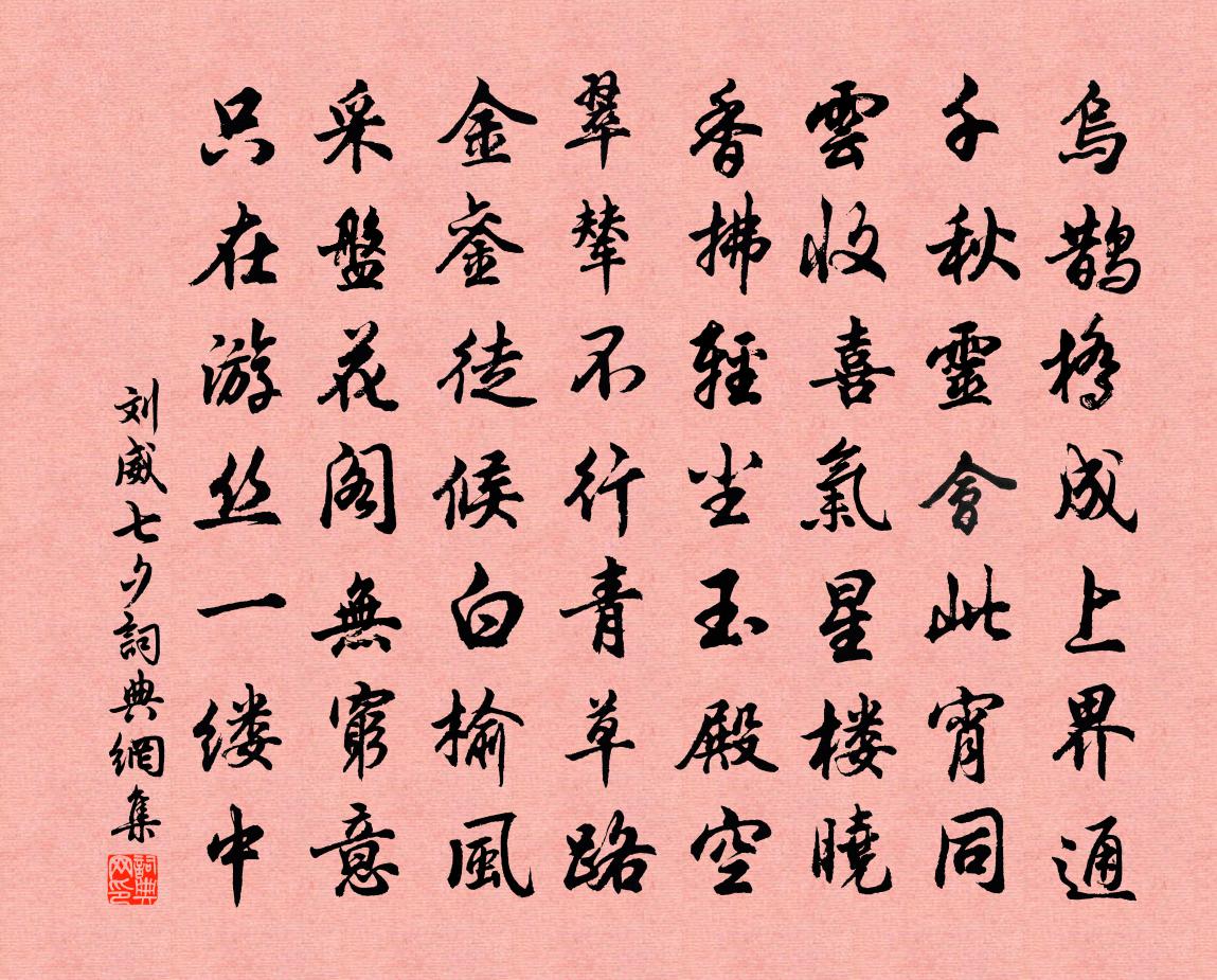 詩詞名句歷史字典書法欣賞書法字典國語詞典說文解字康熙字典古漢語字典標 題 作 者 詩 句 七夕作者:劉威 朝代:唐代七夕原文烏鵲橋成上界通,千秋靈會此宵同。雲收喜氣星樓曉,香拂輕塵玉殿空。翠輦不行青草路,金鑾徒候白榆風。采盤花閣無窮意,只在遊絲一縷中。詩詞問答問:七夕的作者是誰?答:劉威問:七夕寫於哪個朝代?答:唐代問:七夕是什麼體裁?答:七律劉威七夕書法欣賞七夕書法作品注釋全唐詩:卷562-13詩詞推薦題尤溪趙氏連桂堂劉克莊〔宋代〕一從五竇聯芳後,直至君家四桂堂。莫是燕山傳下本,又疑蟾窟摘來香。即今錄續題千佛,伊昔栽培記十郎。卻笑四和二首劉克莊〔宋代〕朱門畫鼓舞宮靴,應笑狂歌似采和。露坐一生無步障,春遊是處有行窩。紹興讜議誰當續,元祐全人本不多。辦取北窗葉茵〔宋代〕八面玲瓏靜向陰,靜中時現定中身。解傳佛祖從前意,便是羲皇向上人。背日一檐渾不暑,依山百卉若為春。未逢雲關觀月李昴英〔宋代〕山間未晚先得月,料想城中見較遲。海吐銀蟾漸呈露,林垂翠影早參差。孤輪涵澗安禪處,明鏡當空沉籟時。夜半陳秀才問詩於余次韻贈之戴表元〔宋代〕秋半說詩秋又闌,覓從忘處更喔看。不妨味熟心自悟,祗恐業成身轉寒。竊木野風天倡和,崩溪怪石鬼鐫刊。扳君沒安碑曾極〔宋代〕漫漫荒池浸綠蕪,殘碑一丈載龜趺。當年刻畫書勛閥,雨打風吹字已無。蠟梅武衍〔宋代〕磬口檀心紫暈重,繁香微泄繡簾風。照花休用添紅燭,卻怕輕明暖易融。呂子固輓詞張舜民〔宋代〕大塊分勞逸,唯君獨不均。險夷安若性,金石想為人。萬卷書奚托,重泉恨莫伸。誰知丞相子,天地一窮民。寄春坊顧校書劉得仁〔唐代〕寧因不得志,寂寞本相宜。冥目冥心坐,花開花落時。數畦蔬甲出,半夢鳥聲移。只恐龍樓吏,歸山又見違。寄峴山願公三首齊己〔唐代〕形影更誰親,應懷漆道人。片言酬鑿齒,半偈伏姚秦。榛莽池經燒,蒿萊寺過春。心期重西去,一共吊遺塵。相思悲哉行白居易〔唐代〕悲哉為儒者,力學不知疲。讀書眼欲暗,秉筆手生胝。十上方一第,成名常苦遲。縱有宦達者,兩鬢已成絲。可憐丞相龐公歸政就第數有新詩傳播都下偶成拙句宋祁〔宋代〕方道逍遙一品身,盡收和氣付凝神。小車殿里拋丞相, * 邊伴老人。雙鶴對眠雲帳月,五芝催耨雨岩春。支離沙塞子(詠梅)葛立方〔宋代〕天生玉骨冰肌。瘦損也、知他為誰。□寒底、傲霜凌雪,不教春知。高樓橫笛試輕吹。要一片、花飛酒卮。拚沈醉小道吟邵雍〔宋代〕藝雖小道,事亦系人。苟不造微,焉能入神。贈蔡俊民挾雷法妝眼科北行陳杰〔宋代〕乖龍捲雨焦土山,妖蟆蝕晴長夜漫。安得霹靂鞭龍起,取光還天磔蟆死。寥落風霆道術空,坐看短世入盲聾。南人懷揚通州文天祥〔宋代〕江波無柰暮雲陰,一片朝宗只此心。今日海頭覓船去,始知百鍊是精金。次韻伯氏謝安石塘蓮花酒黃庭堅〔宋代〕花蕊芙蕖拍酒醇,浮蛆相亂菊英新。寒光欲漲紅螺面,爛醉從歌白鷺巾。行樂銜杯常有意,過門問字久無人。王孫句張鎡〔宋代〕已從槐借葉,更梁菊為裳。寄別諸公林景熙〔宋代〕盍簪譚舊夢,持酒送余春。天地綠陰雨,江湖白髮人。時平銷劍氣,客久積衣塵。又出重關北,斜陽獨問津。湖上晚歸陸游〔宋代〕地僻多幽事,官閒慰古心。晚花藏密葉,新筍補疏林。碩果畦丁獻,芳醪稚子斟。碧雲遮日盡,歸路更蕭森。名句推薦灞原風雨定,晚見雁行頻。馬戴《灞上秋居》 雖死之日,猶生之年陳壽《三國志·吳書·吳主五子傳》 問他有甚堪悲處?思量卻也有悲時,重陽節近多風雨。辛棄疾《踏莎行·庚戌中秋後二夕帶湖篆岡小酌》 雁盡書難寄,愁多夢不成。沈如筠《閨怨二首·其一》 歌鐘不盡意,白日落昆明。李白《經亂離後天恩流夜郎憶舊遊書懷贈江夏韋太守良宰》 氣軟來風易,枝繁度鳥遲。李爽《芳樹》 淅淅西風淡淡煙,幾點疏疏雨。葛立方《卜運算元·席間再作》 梧桐樹,三更雨,不道離情正苦。溫庭筠《更漏子·玉爐香》 棲霞山裂;沂水陷穴,廣數畝蒲松齡《地震》 處富貴之地,要知貧賤的痛癢;當少壯之時,須念衰老的辛酸。洪應明《菜根譚·概論》