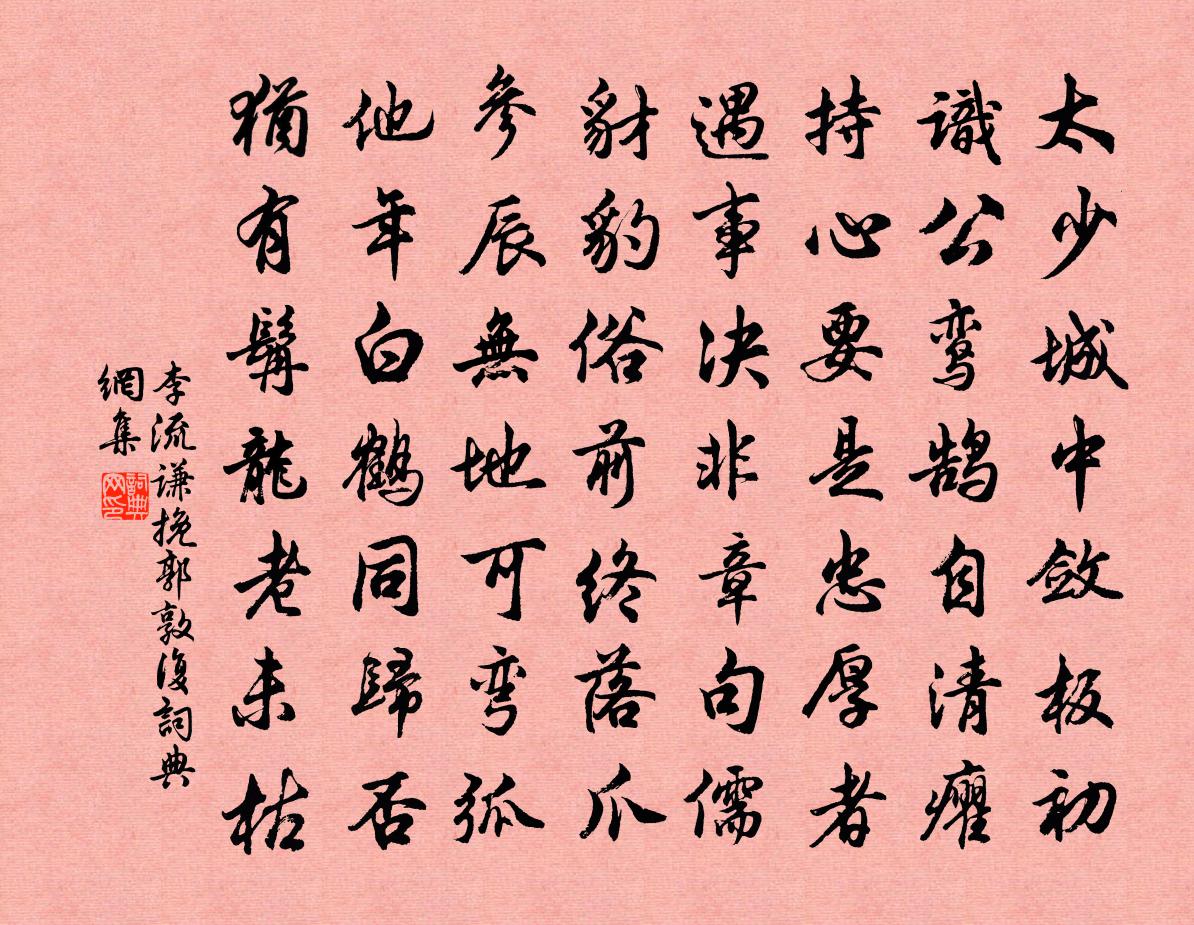 詩詞名句歷史字典書法欣賞書法字典國語詞典說文解字康熙字典古漢語字典標 題 作 者 詩 句 挽郭敦復作者:李流謙 朝代:宋代挽郭敦復原文太少城中斂板初,識公鸞鵠自清癯。持心要是忠厚者,遇事決非章句儒。豺豹俗前終落爪,參辰無地可彎弧。他年白鶴同歸否,猶有髯龍老未枯。詩詞問答問:挽郭敦復的作者是誰?答:李流謙問:挽郭敦複寫於哪個朝代?答:宋代李流謙挽郭敦復書法欣賞挽郭敦復書法作品詩詞推薦句宋綬〔宋代〕雲間乍闋仙韶曲,禁里還過叡武樓。子瞻見許驪山澄泥硯蘇轍〔宋代〕長安新硯石同堅,不待書求遂許頒。豈必魏人勝近世,強推銅雀沒驪山。寒煤舒捲開雲葉,清露沾流發涕潸。早與水調歌頭(賀李潼川埴改知常德府)魏了翁〔宋代〕更盡一杯酒,春近武陵源。源頭父老迎笑,人似老癯仙。檢校露桃風葉,問訊渚莎江草,點檢舊風煙。世界要人拄句趙師秀〔宋代〕地僻傳聞新事少,路遙牽率故人多。野寺陸游〔宋代〕閒行入野寺,僧飯鼓其鏜。慘慘風剺面,暉暉日滿廊。去來元自在,賓主兩相忘。卻下山坡路,樵歌出隴長。溪行林景熙〔宋代〕風高余暑盡,獨策興悠然。野色延幽步,秋聲入暮年。日斜禽影亂,水薄樹根懸。回首故人遠,城笳吹夕煙。三山寺戲堂頭僧二首曾豐〔宋代〕竹不容塵入,山寧與俗交。開門懸梵偈,置榻解僧包。不見肘生柳,未聞頭戴巢。葛籐非我事,笑語浪相嘲。送別王之渙〔唐代〕楊柳東風樹,青青夾御河。近來攀折苦,應為別離多。病起荊江亭即事十首黃庭堅〔宋代〕魯中狂士邢尚書,本意扶日上天衢。惇夫若在鑴此老,不令平地生崎嶇。和吳御史臨淮感事王安石〔宋代〕柵鎖城扉曉一開,柂牙車軸轉成雷。黃塵欲礙龜山出,白浪空分汴水來。澄觀有材邀昧陋,霽雲無力報奸回。騷人寄呈壽岡先生二首趙蕃〔宋代〕我愛清江郡,端如屋上烏。掛冠推二老,縫掖盛諸儒。吳蜀書難得,荊蠻病益癯。飛黃去騰踏,局趣效轅駒。山居七詠中隱洞方岳〔宋代〕終南少室苦躋攀,已入先生一笑間。不學劉安便仙去,屋邊儘自有佳山。驀山溪晁端禮〔宋代〕風流心膽,直把春償酒。選得一枝花,綺羅中、算來未有。名園翠苑,風月最佳時,夜迢迢,車款款,是處曾攜手和南澗叔見寄劉黻〔宋代〕五年風雨別,家信憶浮沈。獨隱金仙屋,誰明鐵漢心。粵鄰蠻瘴惡,蜀急客憂深。此地無黃犬,朝朝說寄音。謁焦鍊師王昌齡〔唐代〕中峰青苔壁,一點雲生時。豈意石堂里,得逢焦鍊師。爐香淨琴案,松影閒瑤墀。拜受長年藥,翩翻西海期。【雙調】折桂令曾瑞〔元代〕閨怨秋霄淡淡輕陰,暮景蕭條,疏雨霪霖。林外鳥啼,天邊雁叫,砌下蛩吟。更漏永聲來繡枕,篆煙消寒透羅衾。一葉舟侯善淵〔元代〕萬象沖開寥廓。元*混然虛托。海月晏晶金。照天心。睫外威神輝豁。冰體雪肌綽約。穩穩過瓊琳。上瑤岑。偈頌一百三十六首釋惟一〔宋代〕元正啟祚,萬物鹹新。覓一毫舊相,了不可得,千年桃核里,元是舊時仁。覓一毫新相,了不可得,新舊之相既不秋懷三十六首邵雍〔宋代〕風柳散如梳,霜雲淡如掃。高樓破危空,低煙裊寒草。此際興不盡,何以戰秋老。止可將酒瓶,同向西風倒。送董億朝奉李復〔宋代〕北游汗漫遺玄珠,煙愁霧泣啼芙蕖。興來便脫上方屐,歸去重修繁露書。一夢百年依幻宅,五湖千里御風輿。家山名句推薦枕上十年事,江南二老憂,都到心頭。徐再思《水仙子·夜雨》 鳳林關里水東流,白草黃榆六十秋。張籍《涼州詞三首·其三》 不明察,不能燭私。韓非及後人《韓非子·孤憤》 江南江北愁思,分付酒螺紅方岳《水調歌頭·平山堂用東坡韻》 招魂楚些何嗟及,山鬼暗啼風雨。元好問《摸魚兒·雁丘詞 / 邁陂塘》 萬歲山前珠翠繞,蓬壺殿里笙歌作岳飛《滿江紅·登黃鶴樓有感》 但信己,不信人,此取敗之由也。王永彬《圍爐夜話·第八五則》 流芳未及歇,遺掛猶在壁。潘安《悼亡詩三首》 愁望春歸,春到更無緒文廷式《祝英台近·剪鮫綃》 獨在異鄉為異客,每逢佳節倍思親。王維《九月九日憶山東兄弟 / 九月九憶山東兄弟》