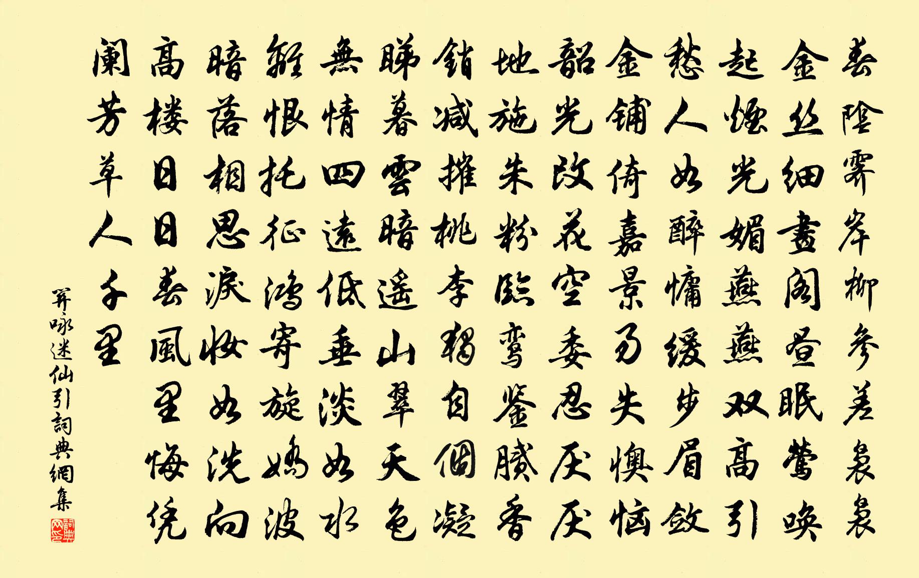 詩詞名句歷史字典書法欣賞書法字典國語詞典說文解字康熙字典古漢語字典標 題 作 者 詩 句 迷仙引作者:關詠 朝代:宋代迷仙引原文春陰霽。岸柳參差,裊裊金絲細。畫閣晝眠鶯喚起。煙光媚。燕燕雙高,引愁人如醉。慵緩步,眉斂金鋪倚。嘉景易失,懊惱韶光改。花空委。忍厭厭地。施朱粉,臨鸞鑑,膩香銷減摧桃李。獨自個凝睇。暮雲暗、遙山翠。天色無情,四遠低垂淡如水。離恨托、征鴻寄。旋嬌波、暗落相思淚。妝如洗。向高樓、日日春風裡。悔憑闌、芳草人千里。詩詞問答問:迷仙引的作者是誰?答:關詠問:迷仙引寫於哪個朝代?答:宋代問:迷仙引是什麼體裁?答:詞關詠迷仙引書法欣賞迷仙引書法作品詩詞推薦送孫學士知太平州梅堯臣〔宋代〕慈姥山上瘦龍孫,堪為笙簫奉玉碗。使君來教後堂樂,江雲江月能迎門,門外青山謝家宅,當時池館無復存。乃知送蔡子驤用蔡子駿韻秦觀〔宋代〕越絕山川遠相屬,萬壑千岩抱青綠。臥龍一峰稱是奇,遶趾清漪如帶束。鏡水春生鶂尾銜,稽山日暮猿聲續。三休依韻和孫侔鴈盪二首梅堯臣〔宋代〕鴈盪高高路莫通,銜蘆秋翼入雲峰。山頭水闊不見影,岩下沙平時有蹤。千仞柱天何斂閃,萬工揮筆漫輕濃。葛巾自儆陸游〔宋代〕經術吾家事,躬行更不疑。仁常為己任,清每畏人知。古訓必三復,危途仍十思。兢兢死方已,寧論迫期頤。癸卯元日方岳〔宋代〕政坐聰明誤乃翁,昔將鞭影戲兒童。春皋本分扶犁手,共駕烏犍待歲豐。聖俞惠宣州筆戲書歐陽修〔宋代〕聖俞宣城人,能使紫毫筆。宣人諸葛高,世業守不失。緊心縛長毫,三副頗精密。硬軟適人手,百管不差一。京師效阮公詩江淹〔南北朝〕若木出海外,本自丹水陰。群帝共上下,鸞鳥相追尋。千齡猶旦夕,萬世更浮沉。豈與異鄉士,瑜瑕論淺深。太湖詩。太湖石(出黿頭山)皮日休〔唐代〕茲山有石岸,抵浪如受屠。雪陣千萬戰,蘚岩高下刳。乃是天詭怪,信非人功夫。白丁一雲取,難甚網珊瑚。厥狀水龍吟 詠揚州明月樓 南濠詞話貫雲石〔元代〕晚來碧海風沉,滿樓明月留人住。瓊花香外,玉笙初響,修眉如妒。十二闌乾,等閒隔斷,人間風雨。望畫橋檐影定庵遠山主薛嵎〔宋代〕修持功行滿,不墮動中塵。龍象西天邃,杉松卵塔新。臘高同輩盡,斂薄小師分。生滅理無二,交深獨愴神。偶成曹彥約〔宋代〕莫鈄愛敬復雕鐫,一片真純得自全。待得將心去鉤索,旋栽荊棘向芝田。鹿鳴席上送諸先輩詩晁說之〔宋代〕周室賓興綺席陳,漢家勸駕禮還申。鶯遷同谷煙霞喜,鯉化瓊林雨露新。日御駸駸須六轡,奎文燁燁自三秦。先應燕支板浣花牋寄合州徐文職方石介〔宋代〕合州太守鬢將絲,聞說歡情尚不衰。板與歌娘拍新調,牋供狎客為芳辭。木成文理差差動,花映溪光瑟瑟奇。名得題畫廿四首唐寅〔明代〕鄧尉山邊七寶灘,高低如畫好溪山。十年游賞經行遍,多少名題竹樹間。秋槿白居易〔唐代〕風露颯已冷,天色亦黃昏。中庭有槿花,榮落同一晨。秋開已寂寞,夕隕何紛紛。正憐少顏色,復嘆不逡巡。感此老桂顧逢〔宋代〕分得蟾宮種,凡葩豈足論。古香吹不盡,生意至今存。秋晚花三色,年深樹半根。更無攀折日,此恨向誰言。望岳時賊據華夏唐彥謙〔唐代〕長路風埃隔楚氛,忽驚神岳映朝曛。削成絕壁五千仞,高揖泥金七十君。祝史秘辭今莫睹,從臣嘉頌久無聞。幽人喜雨戴叔倫〔唐代〕閒居倦時燠,開軒俯平林。雷聲殷遙空,雲氣布層陰。川上風雨來,洒然滌煩襟。田家共歡笑,溝澮亦已深。團團中秋夕愴懷寄荊幕孫郎中齊己〔唐代〕白蓮香散沼痕乾,綠筱陰濃蘚地寒。年老寄居思隱切,夜涼留客話時難。行僧盡去雲山遠,賓雁同來澤國寬。時謝寄吳吏部三首趙蕃〔宋代〕元日送朝天,侵尋又一年。無詩供猥誦,有志辱哀憐。茅屋蒼苔合,芳洲杜若搴。去留俱未遂,兩鬢已蒼然。名句推薦若教眼底無離恨,不信人間有白頭。辛棄疾《鷓鴣天·晚日寒鴉一片愁》 雪花全似梅花萼。細看不是雪無香,天風吹得香零落。王旭《踏莎行·雪中看梅花》 江南春盡離腸斷,苹滿汀洲人未歸。寇準《江南春·波渺渺》 居必擇鄉,游必就士。荀子《荀子·勸學》 可惜一溪風月,莫教踏碎瓊瑤。蘇軾《西江月·頃在黃州》 時有官船橋畔過,白鷗飛去落前灘。姜夔《釣雪亭》 分明小像沉香縷,一片傷心欲畫難。納蘭性德《於中好·送梁汾南還為題小影》 岱宗夫如何?齊魯青未了。杜甫《望岳》 曲終人不見,江上數峰青。錢起《省試湘靈鼓瑟》 相見易得好,久住難為人。佚名《增廣賢文·上集》