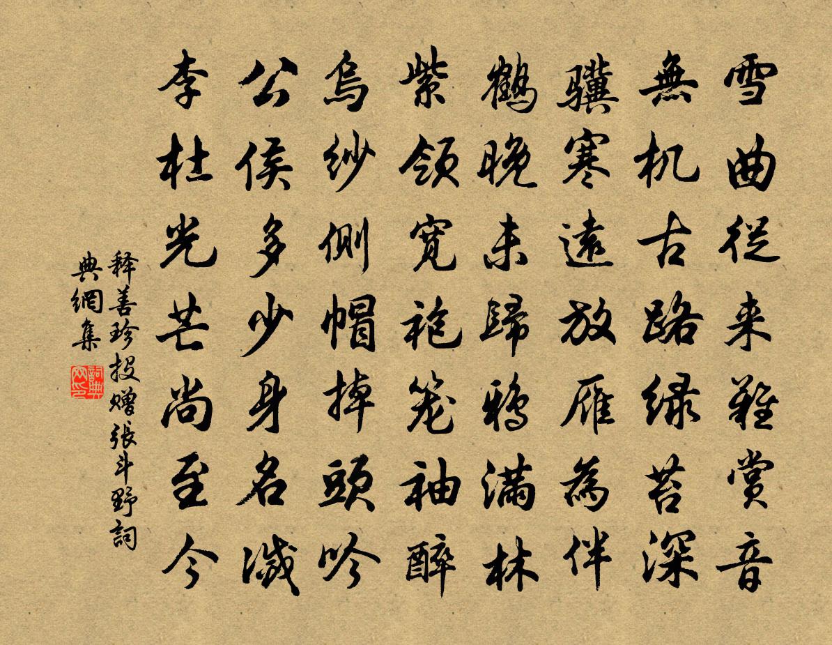 詩詞名句歷史字典書法欣賞書法字典國語詞典說文解字康熙字典古漢語字典標 題 作 者 詩 句 投贈張斗野作者:釋善珍 朝代:宋代投贈張斗野原文雪曲從來難賞音,無機古路綠苔深。驥寒遠放雁為伴,鶴晚未歸鴉滿林。紫領寬袍籠袖醉,烏紗側帽掉頭吟。公侯多少身名滅,李杜光芒尚至今。詩詞問答問:投贈張斗野的作者是誰?答:釋善珍問:投贈張斗野寫於哪個朝代?答:宋代釋善珍投贈張斗野書法欣賞投贈張斗野書法作品詩詞推薦治平皇太后冊寶三首佚名〔宋代〕睟和臨拱,丕命明昴。鶯回實勢,鴻貫瑤光。禮成樂備,德裕名芳。筆基王化,永懋天祥。文相生日金君卿〔宋代〕羲御三星次,堯蓂九葉開。霄躔符有道,天驥下呈才。氣恩凌諸謝,淵源過二崔。光華逢日月,騰躍契雲雷。迅步郫縣春日吟吳泳〔宋代〕無窮官事日裝懷,甫及芳時略放開。騷仆編排詩社去,酪奴勾管醉鄉來。句王琪〔宋代〕誰將水調歌秋雁,不遣君王待曲終。百寶妝王吉昌〔元代〕雲水閒情,松筠雅操,根窮入道真訣。掃霧驅煙,磨鍊志如鐵。慨然不改簞瓢樂,廓愚谷,聰明養素拙。放胸襟,夜攜家登南渡橋樓鑰〔宋代〕幾過長橋下,清宵得意行。風高江水急,月上海潮生。空迥寒逾峭,更深境過清。扁舟難久駐,轉柂問歸程。玉華洞戴復古〔宋代〕憶昨游桂林,岩洞甲天下。奇奇怪怪生,妙不可模寫。玉華東西岩,具體而微者。神功巧穿鑿,石壁生孔罅。玲瓏逐貧賦揚雄〔兩漢〕揚子遁居,離俗獨處。左鄰崇山,右接曠野,鄰垣乞兒,終貧且窶。禮薄義弊,相與群聚,惆悵失志,呼貧與語:晁無咎金山詩帖贊岳珂〔宋代〕我登吞海,而帖適至。事雖偶然,不啻有意。彼江山者,秀無古今。丘壑市朝,則二其必。阿大中郎,煌煌虎節。過臨平二首楊萬里〔宋代〕人家點綴荻花林,水繞階除雪濕衿。最是疏籬與修竹,腳根半入小河深。閒步西湖易士達〔宋代〕西湖風景絕繁華,兩岸荷香十萬家。除卻孤山林處士,後來誰肯種梅花。次韻梁粹中秋日雨方岳〔宋代〕天公不吝常時月,每到中秋苦作難。醽醁又孤今夕醉,梧桐仍是去年寒。萍化風老鱸魚夢,蘆葉雨宜鷗鷺看。我欲挽呂東萊先生宋天則〔宋代〕麗澤南軒聚,俱曾辱異知。顓蒙初自釋,誘掖信吾斯。雖嘆行窩寂,猶虧築室思。只同二三子,許學莫能移。離京後作七首張耒〔宋代〕高槐老柳舞南風,晴日家家蠶麥中。芟盡黃雲見原隰,卻教風雨洗長空。湘中韓愈〔唐代〕猿愁魚踴水翻波,自古流傳是汨羅。蘋藻滿盤無處奠,空聞漁父扣舷歌。雜曲歌辭羽林行王建〔唐代〕長安宮惡少出名宮字,樓下宮劫商樓上醉。天明下直明光宮,散入五陵松柏中。百回 * 身合死,赦宮尚有收城功西江月(為樞密太夫人壽)張孝祥〔宋代〕疇昔通家事契,只今寸鎮交承。起居樞密太夫人。綠鬢斑衣相映。乞得神仙九醞,祝教福祿千春。台星直上壽星明飲襄陽沈氏家醉題侍兒小瑩裙帶李廌〔宋代〕旋剪香羅列地垂,嬌紅嫩綠寫珠璣。花前欲作重重結,系定春光不放歸。偈頌一百五十首釋心月〔宋代〕我有一言,徹根徹源。舉之不全,聽之不圓。擬問如何,蒼天蒼天。夜間鍾惜其不響晁說之〔宋代〕宋都為客喜還驚,無數霜天歸雁橫。夜半鐘聲何太啞,由來石霣五無聲。名句推薦天山三丈雪,豈是遠行時。李白《獨不見》 潭州官舍暮樓空,今古無端入望中。李商隱《潭州》 過橋分野色,移石動雲根。賈島《題李凝幽居》 思家步月清宵立,憶弟看雲白日眠。杜甫《恨別》 賈傳自憐多感慨,東門何意泥孤虛。王惲《送姬仲實隱士北還》 白毛浮綠水,紅掌撥清波駱賓王《詠鵝》 天之道,利而不害;聖人之道,為而不爭。老子《老子·德經·第八十一章》 忠告而善道之,不可則止,毋自辱焉。孔子弟子《論語·顏淵篇》 九日明朝酒香,一年好景橙黃。張可久《滿庭芳·客中九日》 莫等閒,白了少年頭,空悲切!岳飛《滿江紅·寫懷》